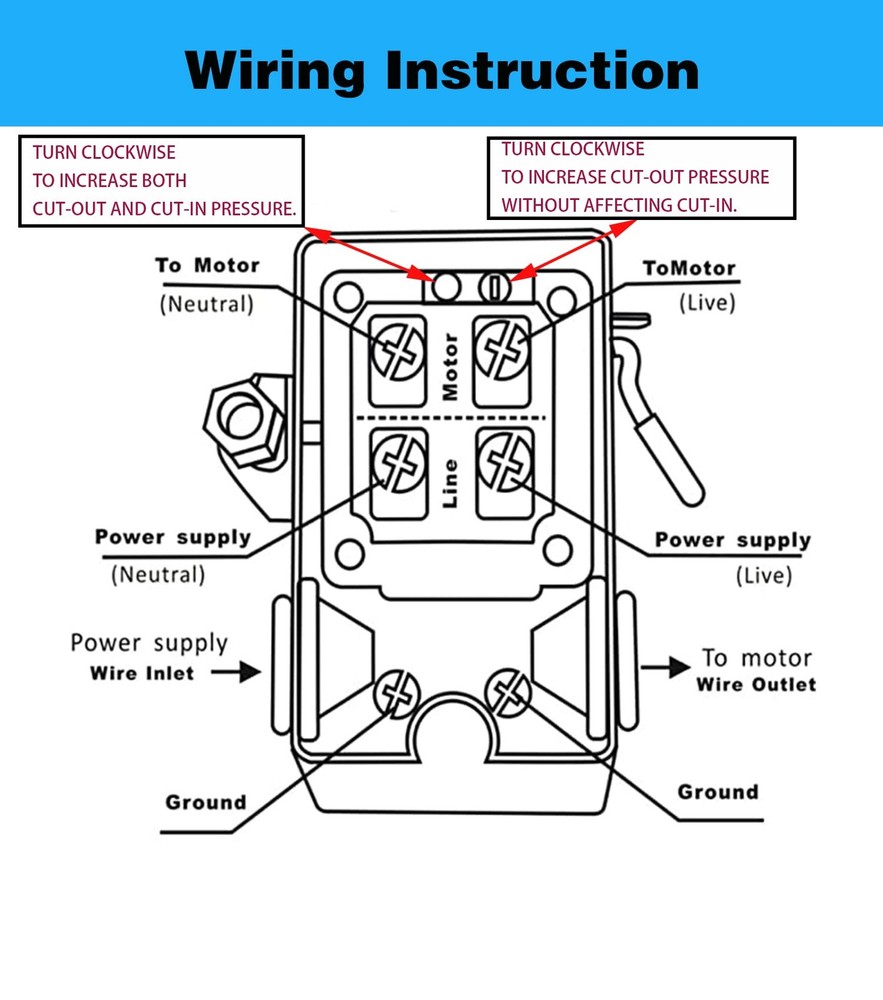 1. Introducing the LF10-4H pressure switch, designed for small, electrically driven air compressors. This switch can regulate tank pressure between two preset values and is suitable for single or two stage compressors with an amperage of less than 20 amps on 120 volt or 12 amps on 240 volt. It comes equipped with a 1/4" plastic or copper line that runs to the check valve or head of the compressor for added convenience. 2. For easy mounting of valves and gauges, this pressure switch also features a four-port manifold. Additionally, the LF10-4H switch is available with an unloader valve to prevent the compressor from starting underload. 3. To adjust the pressure settings, simply turn the switch clockwise to increase both cut-out and cut-in pressure, or turn clockwise to increase cut-out pressure without affecting cut-in.(lease refer to the instruction image for details.) 4. Trust the LF10-4H pressure switch for its reliability and ease of use. Upgrade your air compressor today with this top-of-the-line product. [Size]: This pressure switch features a 6.3 mm unloader valve connection and a 1/4 inch NPT Female connection. The factory-set cut-in and cut-off pressure range is 95-125 PSI. With a relief valve, it can avoid the overload operation of the air compressor. [Part number]: The part number for this pressure switch is LF10-4H-1-NPT1/4-95-125. It is designed for use with a single stage or two-stage air compressor that pumps up to 125 PSI. [Convenient to use]: The four-port manifold gives you the flexibility to mount the switch in any direction and add a relief valve, gauge, or multiple air outlet ports. [Intelligent handle design]: The built-in On/Off metal lever and unloader located on the side of the switch allow you to easily cut off air compressor and 4-port base simply the mountion of exhaust valve and pressure gauge. [Safe to use]: This switch comes preset to turn the compressor on at 95 psi and shut off at 125 psi, providing reliable and safe operation.