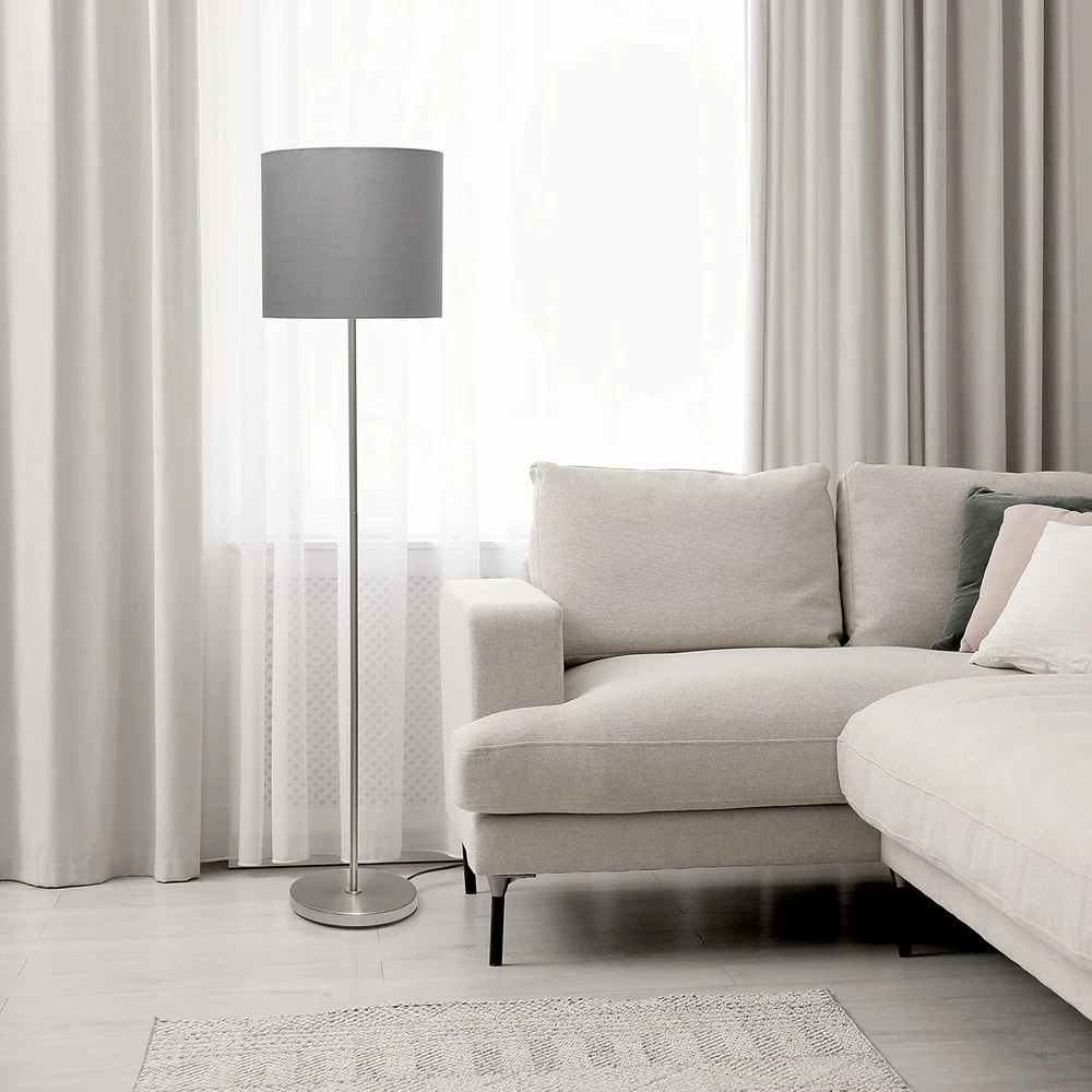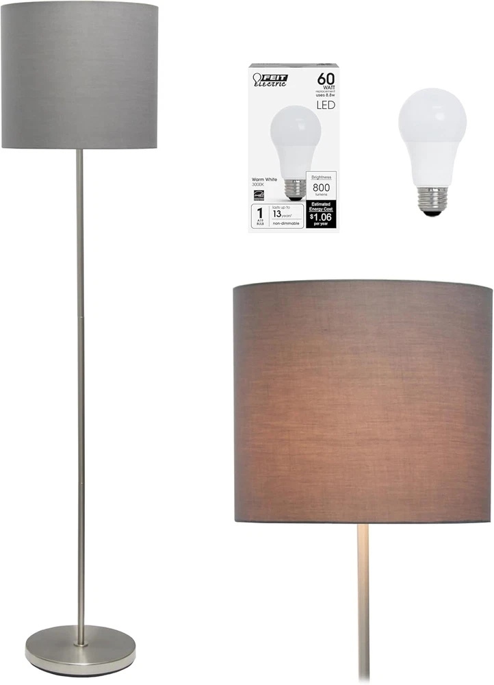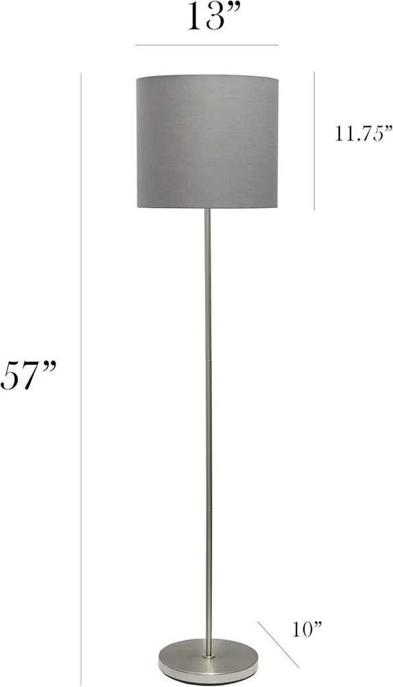 Included Components: Bulb Shade Color: grey Number of Items: 1 Color: Gray Bulb Base: E26 Medium Special Feature: Energy Efficient Connectivity Technology: Normal bulb Is Waterproof: False Age Range (Description): Adult Type: Does not apply Item Weight: 11.13 pounds Wattage: 60 watts Item model number: LF2004-GRY-LB UPC: 313091513596 Finish: Brushed Switch Type: Foot Mounting Type: Floor Mount Product Dimensions: 13"D x 13"W x 57"H Brand: Does not apply Country of Origin: China Part Number: LF2004-GRY-LB Size: Bulb Included Pattern: Solid Special Features: Energy Efficient Water Resistance Level: Not Water Resistant Light Source Type: LED Warranty Description: 1 year limited. gtin13: 313091513596 Shade Material: Linen Base Material: Metal Room Type: Office, Bedroom, Living Room Power Source: Corded Electric Connectivity Protocol: Other Item Package Quantity: 1 Material: Metal Batteries Required?: No Finish Type: Brushed Lamp Type: Floor Lamp Style: Contemporary
