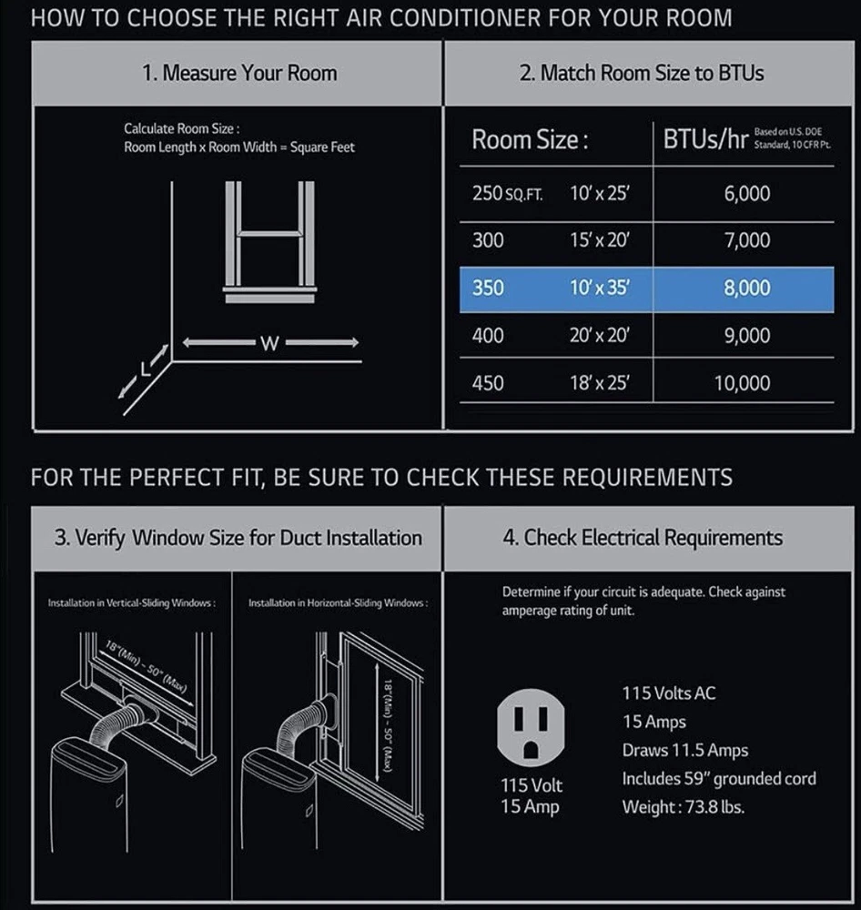 Type: Portable Air Conditioner Mounting Location: Floor Color: Black Area Covered: 350 sq ft Features: Portable, Dehumidifier Smart Home Protocol: Bluetooth, Wi-Fi Manufacturer Warranty: 1 Year Smart Home Compatibility: N/A Energy Star: 5 Stars Compressor Type: Remote Number of Cool Speeds: 3 Model: LP0821GSSM Power: 800 W Power Source: Corded Electric Voltage: 115 V Item Width: 17.52 in Brand: LG Cooling System: Direct Item Depth: 14.56 In BTU Cooling Rating: 8,000 BTU Timer Control: 24 hrs Cooling Method: Air Item Length: 14.56 in Material: Plastic Control Style: App Control, Remote Control, Voice Country of Origin: China Air Flow Volume: 100-499 CFM Operating Sound Rating: 51-60 dB MPN: LP0821GSSM Vent Hose Exhaust Configuration: Single Hose