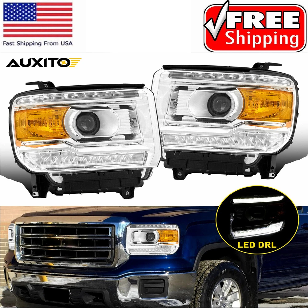 Fit for: 2014-2018 GMC Sierra 1500 Base / Denali / SLE / SLT models only 2015-2019 GMC Sierra 2500HD Base / Denali / SLE / SLT models only 2015-2019 GMC Sierra 3500HD Base / Denali / SLE / SLT models only (Compatible models with factory LED daytime running lights) (Does not compatible models with 2014 classic body style) (For models with factory non-LEDs lights headlights: This headlights will light up the bottom LEDs only by manually turn on the parking lights; the top LEDs will not turn on) (Fits models with factory halogen headlights only; Does Not fit models with factory Xenon HID headlights) Specifications: OE number: GM2502390, GM2503390, GM2502394, GM2503394 LH+RH For 2014-2018 GMC Sierra 1500 2500 3500 Amber LED DRL Head Lights Headlamp Fit for: 2014-2018 GMC Sierra 1500 Base / Denali / SLE / SLT models only 2015-2019 GMC Sierra 2500HD Base / Denali / SLE / SLT models only 2015-2019 GMC Sierra 3500HD Base / Denali / SLE / SLT models only (Compatible models with factory LED daytime running lights) (Does not compatible models with 2014 classic body style) (For models with factory non-LEDs lights headlights: This headlights will light up the bottom LEDs only by manually turn on the parking lights; the top LEDs will not turn on) (Fits models with factory halogen headlights only; Does Not fit models with factory Xenon HID headlights) Specifications: OE number: GM2502390, GM2503390, GM2502394, GM2503394 23130715, 23130716, 23130717, 23130718 Material: ABS+PC (ABS Plastic Housing/Polycarbonate lens) Appearance color: 1.Housing Color: Chrome 2.Lens Color:Clear 3.Reflector Color:Amber Note: Projector √(Include) DRL √ (Include) Bulb × (Not include) Features: *Easy to install: Direct replacement, drilling and cutting are not required. *Superior quality: Made of ABS and PC materials with toughness and heat resistance functions to ensure its long service life and durability. *Angle adjustment: Equipped with a headlamp Angle adjustment knob, you can adjust the best Angle of view through the knob. *Suggestion: 1.Please confirm the OE number before purchasing!!! 2.Professional installation is required!!! Packaging include: Headlights*2(Left+Right) ABOUT US LH+RH For 2014-2018 GMC Sierra 1500 2500 3500 Amber LED DRL Head Lights Headlamp Fit for: 2014-2018 GMC Sierra 1500 Base / Denali / SLE / SLT models only 2015-2019 GMC Sierra 2500HD Base / Denali / SLE / SLT models only 2015-2019 GMC Sierra 3500HD Base / Denali / SLE / SLT models only (Compatible models with factory LED daytime running lights) (Does not compatible models with 2014 classic body style) (For models with factory non-LEDs lights headlights: This headlights will light up the bottom LEDs only by manually turn on the parking lights; the top LEDs will not turn on) (Fits models with factory halogen headlights only; Does Not fit models with factory Xenon HID headlights) Specifications: OE number: GM2502390, GM2503390, GM2502394, GM2503394 23130715, 23130716, 23130717, 23130718 Material: ABS+PC (ABS Plastic Housing/Polycarbonate lens) Appearance color: 1.Housing Color: Chrome 2.Lens Color:Clear 3.Reflector Color:Amber Note: Projector √(Include) DRL √ (Include) Bulb × (Not include) Features: *Easy to install: Direct replacement, drilling and cutting are not required. *Superior quality: Made of ABS and PC materials with toughness and heat resistance functions to ensure its long service life and durability. *Angle adjustment: Equipped with a headlamp Angle adjustment knob, you can adjust the best Angle of view through the knob. *Suggestion: 1.Please confirm the OE number before purchasing!!! 2.Professional installation is required!!! Packaging include: Headlights*2(Left+Right) FAQ Shipping Returns Contact Us Payment Why swith to LED? LEDs not only give your vehicle a clean, modern look but, with proper use, will outlast any halogen bulb and HID bulb! Low energy draw, high lumen output, and instant on/off LED technology out shines stock bulbs in every way. Which bulbs are used in my vehicle? Check Sylvania automotive lamp replacemnt guide , you can select the year, make, and model of your vehicle, then select the application you want to replace or upgrade from stock. What does CAN Bus mean? CAN Bus means Controller Area Network Bus. This system monitors your vehicle and reports operating conditions. CAN Bus systems are commonly found in European vehicles such as BMW, Audi, Mercedes, Volkswagen, Porsche, and in many American vehicles. While most late model American vehicles have CAN Bus systems, it is always good to check with your vehicle dealer to see which system your vehicle has before purchasing electrical products. When do you need Warning Canceller? Some vehicles with cmplex internal computers(such as Audi,BMW,Jaguar,Mercedes,etc.) might report on-dash errors or flickering on the headlights. The warning canceller fixes the dashboard warning and flickering effect. Bulb Out Dashboard Error: On some vehicles, the dashboard will report as if you have a headlight bulb missing or burnt. It does not affect the headlights functioning, but the light on-dash will be on. The warning canceller fixes the issue. Flickering Issue: This happens when your vehicle does not recognize the new headlights installed. When turning the headlights on, the vehicle's computer does not understand the signal back from the headlights hence thinking they are still off. This triggers the headlight flickering effect. The warning canceller solves this issue. LED Advantages: Very low and efficient energy consumption than halogen bulbs & HID Bulbs Compared with HID bulbs, LED bulbs Light up instantly, no warm up period Low voltage protection, high precision constant current driver chip Longer lifespan than HID and halogen bulbs Light can be controlled easily in color and intensity Easy to install a LED headlight conversion kit (1) We will ship your item(s) within 24 hours. (2) We ship this item to US only via USPS first class mail. It usually takes 3-6 working da