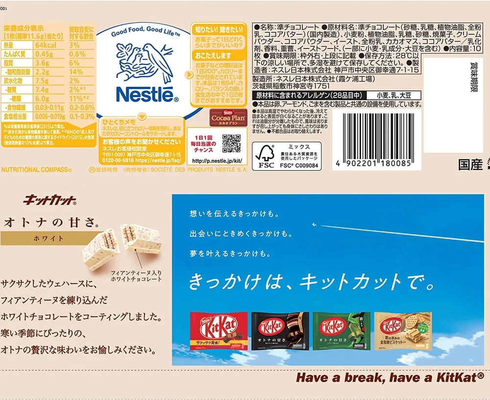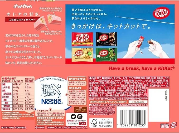 JAPAN EXCLUSIVE Nestle KitKat Flavors- changes seasonally!! DO CHECK BACK - this listing will be updated based on changes in seasonal options available! PLEASE NOTE: The base price for shipping this item is ~$10 from Japan (to the US), and goes up by about $3 for each additional bag added. As many locations have taxes charged on items (but not always shipping), the price has been adjusted to be more affordable to people in these locations. **Spring 2024 Note: Current exchange rate means shipping prices are LOWER than usual! In order to allow for those that have taxes applied to their purchased items (but not shipping costs), we're offering the current discounted item price without any change to the shipping cost for a LIMITED TIME based on the USD/JPY exchange rate! THIS PRICE WILL CHANGE once the exchange rate goes back up!!** Current Flavors Available (all bags 10 mini bars per unless otherwise stated): 'Adult' (low sweetness) Strawberry [white chocolate] Best by October 2024 or later [depending on stock] 'Adult' (low sweetness) Fiantine [white chocolate] Best by 2025[depending on stock] SOLD OUT Strawberry Gateau Chocolat [milk chocolate] SOLD OUT Sweet Potato (Halloween special) [white chocolate] DARK 72% Cacao [dark chocolate] Best by 2025 (depends on purchase date) *12 Piece Bag* NEW JANUARY RELEASE Strawberry ShortCake [white chocolate] Best by November 2024 SOLD OUT Chestnut [white chocolate] SOLD OUTIce Cream [white chocolate] SOLD OUT Salt Lemon [white chocolate] Baskin Robbins Cholo-Mint Ice Cream [white chocolate] Best by December 2024 Half and Half [green matcha tea white and milk chocolate ] Best by late 2024 ( depending on stock) Matcha Latte [white chocolate] Best by December 2024 Sakura Kinako (roasted soybean powder) [white chocolate] Best by December 2024 (or later depending on stock) For each bag you add to your cart, you will earn an additional percentage off of each package in the order when you pay for all the items together! Make your own special combination!! FANTASTIC as a Valentines, birthday or other party gift. SELLER IS NOT RESPONSIBLE if chocolate melts in hot climates- please take the weather in your region into account before ordering! All chocolate is stored in a indoor climate-controlled space where prior melting to shipment has not occurred. All pieces leave the seller whole. Any wafer pieces that are broken during shipping are not the responsibility of the seller. Buyer is responsible for any applicable charges for purchasing items internationally. The item will be labeled correctly on the customs form (not as gift), and a reasonable value will be put on the form as well. Any damage to the shipping box or plastic wrapping of items is not the responsibility of the seller while being transported. Items are shipped exactly as described in a sturdy container. All pieces leave the seller whole. Any pieces that are broken during shipping are not the responsibility of the seller. As this is a consumable product, returns are generally not accepted. In the case of severe damage during shipping, please contact the seller with multiple photos of the damage in order to make an insured mail claim. Only in this case is a refund possible. Whenever possible, seller will used TRACKED AIRMAIL for deliveries. Currently Japan Post refuses air or surface parcel mail to certain destinations (please check these restrictions at https://www.post.japanpost.jp/int/information/overview_en.html). Please be aware that this could increase shipping time dramatically, and the seller is not responsible for these restrictions nor delays in the arrival of any package. Food/drink items and Large Volume/Low Weight items: Japan Post is the only method that accepts any food or beverage items for international shipping. Their costs are higher due to the privatization of the company, and are based on the weight of the item. In most cases with airmail shipping, packages arrive into US Customs approximately 5-7 days after acceptance at the Japan Post office, and to their final destination approximately 2-7 business days after that. Delays on either side of customs could change this time, and is not the responsibility of the seller. Every effort to get the package to you as quickly as possible is taken. Currently Japan Post refuses air or surface parcel mail to certain destinations (please check these restrictions at https://www.post.japanpost.jp/int/information/overview_en.html). Please be aware that this could increase shipping time dramatically, and the seller is not responsible for these restrictions nor delays in the arrival of any package. If you are NOT located in the US/Canada/UK or Australia, please contact seller prior to purchase to check the available shipping options. Thank you for your understanding.