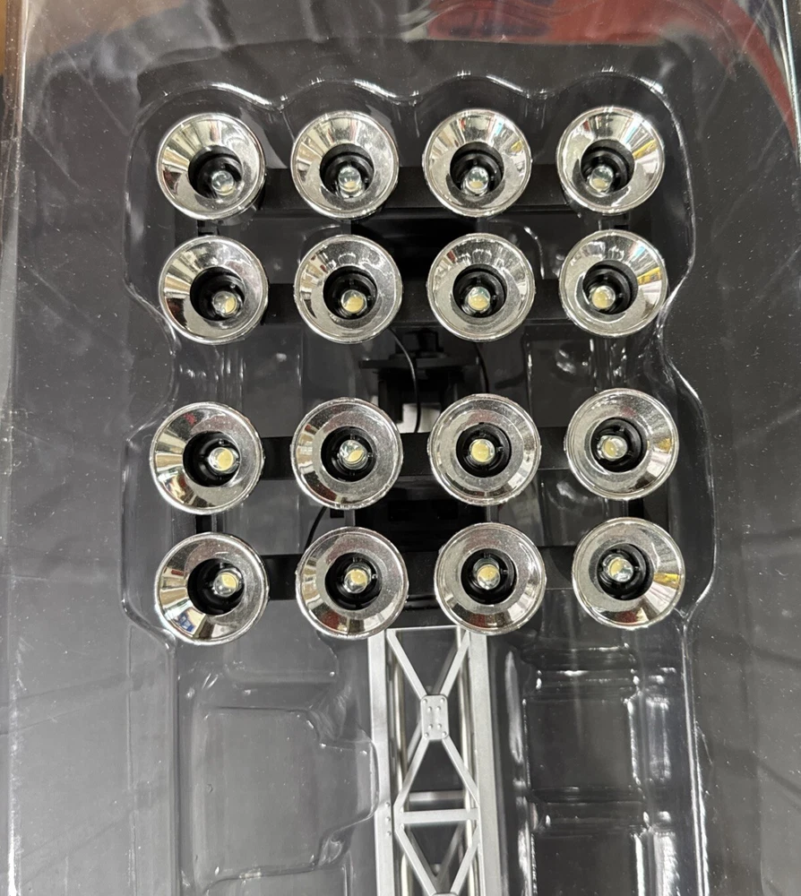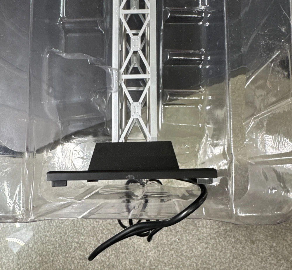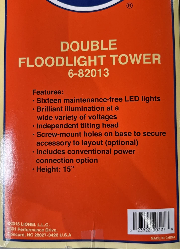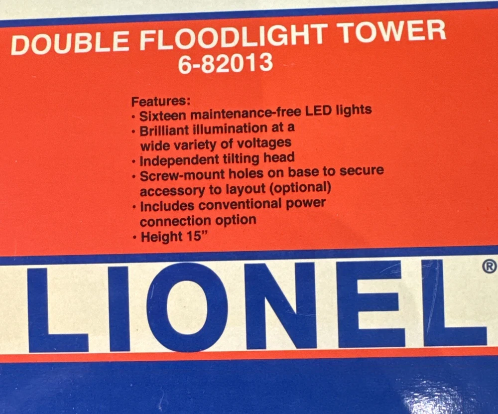 Open box. Never installed nor used. Excellent mint shape. Tested and verified operational. The Lionel Double Floodlight Tower is a pre-built, silver-colored accessory for model railroads in a 1:48 scale. It features two floodlights that can be easily plugged in and controlled using an analog system. Suitable for ages 8-11 years, this plastic unit from China is part of the Plug-N-Play series by Lionel, designed to enhance the realism of train track layouts.