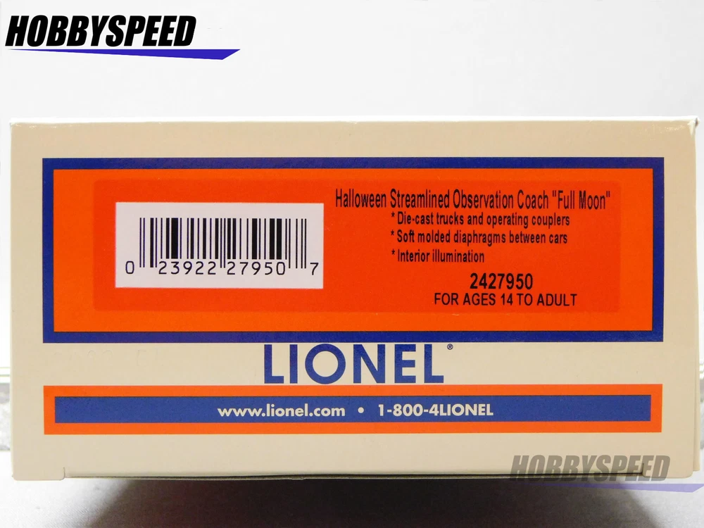 Halloween Streamlined Observation Coach "Full Moon" Grow your consist with Lionel's traditional O-Gauge passenger cars featuring die-cast trucks, operating couplers, soft molded diaphragms between cars, and interior illumination! Die-cast trucks and operating couplers Soft molded diaphragms between cars Interior illumination Product Features: Gauge: O Gauge Power: Electric Min Curve: O27 Dimensions: Length: 13" Most Recent Catalog: 2024 Volume 1 Catalog
