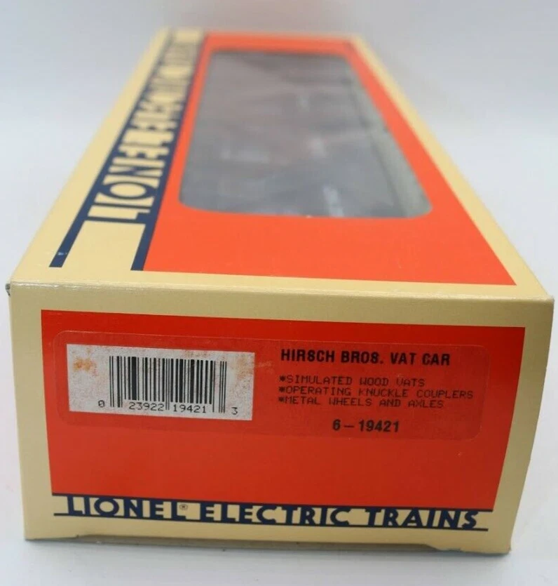 LIONEL Hirsch Bros. Vat Car 6-19421 O27 New In Box Cond Original Box 1995 NIB RR. We ships USPS PLEASE see photos for detailed condition!! There may be pieces that are missing or broken including, but not limited to, couplers, brake wheels, steps, ladders, railings, etc. May need detailed cleaning. PLEASE LOOK AT THE PHOTOS CAREFULLY BEFORE PURCHASING!! If you are purchasing more than one item from us and would like combined shipping, PLEASE request an adjusted invoice from us while still in the cart and BEFORE paying. Ebay does not usually calculate combined shipping accurately and you might get overcharged. Please be aware that when we photograph items, we use lighting that will show the details well. Although we try to present the product as accurately as possible, the lighting may affect the overall look of the item by appearing lighter/darker or possibly a different hue than the actual item. Depending on the type of lighting you have in your home, there may be some differences between the photos and the actual item. If this is a concern of yours, please feel free to request additional photos made in natural lighting or ask for a more detailed description of the item PRIOR TO PURCHASE! PLEASE NOTE: We greatly appreciate your interest in our item for sale. We look forward to a pleasant, quick and satisfying transaction for everybody, so please note the following information before bidding. Thank you! ITEM DESCRIPTIONS: * We will try to describe items well and provide plenty of photos. Please review these carefully before bidding or purchasing. * Only the items pictured and described are what you will receive when purchased. * We will occasionally offer an item clearly marked "AS-IS". This means that we are not sure if it works because we are unable to test it for whatever reason. We will offer these at a discounted price then a similar "working" item. It is possible that these items will work fine, but it also is possible that these items are more useful for their parts. Please only bid on or purchase these items if you are well aware of this, as we will only provide refunds of actual item price (no shipping cost refunds) for these items. * If you have any questions that aren't addressed by the descriptions or photos, please feel free to ask before you bid. SHIPPING: * We offer international shipping, if you have any questions please reach out. * We try to pack items as carefully as possible, but damage may occur during shipping. If you receive an item that was damaged in shipping, please contact us and we will work with you to resolve the problem. * We will combine shipping costs for all items the same buyer purchases from us within 2 days. Please wait to pay for items until you're done shopping with us. Please contact us if you're expecting to buy more items from us, or to have us adjust the shipping costs. * We will usually ship items out within 24 hours of payment being received Sunday through Friday at noon. We will notify the buyer if there will be a delay in shipping for some reason. Please allow additional time for holidays and weekends when the post office is closed. If payment is received after noon (EST) on Friday, the item might not be shipped until the following Monday. * We do try to recycle shipping materials as much as possible. RETURNS: We abide by eBay's Money Back Guarantee. We definitely want our customers to be happy with their purchase! You may return an item within 30 days of receiving it with the following guidelines: * If the item is defective or damaged (unless we clearly marked the listing "AS-IS"), the buyer will receive a full refund after the buyer returns it and it is received by us. Customers who falsely claim their item is defective, damaged, or not as described in order to receive a full refund and free return shipping will be permanently blocked from making future purchases from us. * If the item is as described (including "AS-IS" items) and the buyer decides for any other reason than defective/damaged to return it, only the actual price of the item will be refunded once it has been returned and it is received by us. The buyer will be asked to pay all original and return shipping charges. This includes all reasons other than defective/damaged, including wrong size, wrong type, changed mind, etc. All "AS-IS" items will fall into this category of return. Please make sure the item is what you want before purchasing it. * Please contact us before initiating a refund request. FEEDBACK: We always leave feedback at the end of transaction. We consider the transaction to be over when we receive feedback from the buyer confirming the item arrived satisfactorily. If you are unsatisfied with your purchase please contact us before leaving neutral or negative feedback. WE APPRECIATE POSITIVE FEEDBACK IF YOU ARE SATISFIED WITH YOUR PURCHASE! THANK YOU FOR YOUR INTEREST IN THIS ITEM!