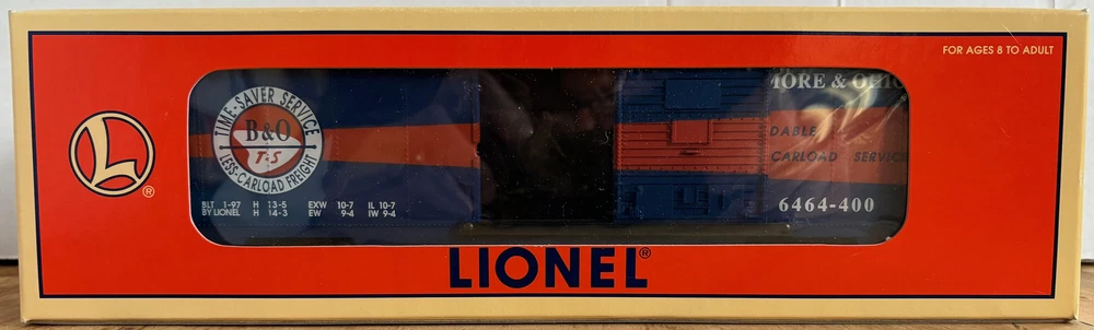 LIONEL 6-19294 O-GAUGE BALTIMORE & OHIO B&O 6464-400 TIMESAVER BOX CAR RTR OVP D LIONEL 6-19294 O-GAUGE BALTIMORE & OHIO B&O 6464-400 TIMESAVER BOX CAR RTR OVP DARK BLUE & ORANGE METAL WHEELS AND AXLES OPERATING KNUCKLE COUPLERS FREE scheduling, supersized images and templates. Get Vendio Sales Manager. Make your listings stand out with FREE Vendio custom templates! FREE scheduling, supersized images and templates. Get Vendio Sales Manager. Over 100,000,000 served. Get FREE counters from Vendio today!