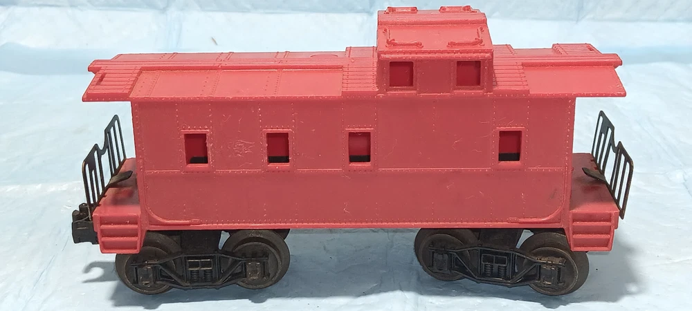 The Unmarked Caboose No. 6167 was available in 1963 and 1964 and was manufactured in various shades of plastic. Issued as a component of various starter sets during these years, they would also be offered in numerous uncataloged sets. These cars are difficult to catalog because the boxes are non-existant, however, attempts have been made to catalog these by their mold number. Some of the RED cabooses use mold 6059-2 while some of the YELLOW ones use mold 6167-52. The most collectable car of this type is the D Variation that uses a Die 4 body. All of these came with either AAR or arch-bar trucks and there are five known variants of this unmarked caboose: Variation A: Unpainted RED body whose chassis does not have handrails and has one solid coupler. Listed in the Lionel Service Manual and Cataloged as 6167-25. Variation B: Cataloged as 6167-125 in the Lionel Service Manual with one operating disc coupler and one solid coupler and has a RED body. Variation C: Unpainted YELLOW body that has one solid coupler. Listed in the Lionel Service Manual and Cataloged as 6167-50. Variation D: OLIVE DRAB body whose chassis does not have handrails and has one solid coupler. Known to have been used as a component for the uncataloged Firestone Tire & Rubber Company set No. 19338 . Variation E: Unpainted BROWN body that uses a Die 4 and was issued uncataloged. Estate find, items has been in storage for decades