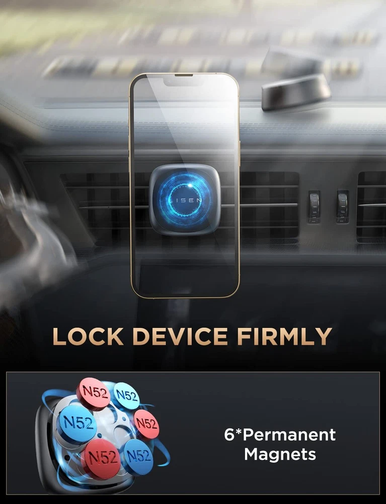 LISEN Magnetic Phone Holder for Car [6 Strong Magnets] Car Phone Holder Mount, R Features: 👍Upgraded 2022 magnetic head:This Magnetic Car Phone Holder Mount uses 6X NdFeB military magnet, which can generate a closed magnetic field to prevent magnetic leakage and interference with mobile phone signals. In addition, the larger and thicker magnetic head (50% thicker than the normal one) brings strong suction to keep your mobile phone stable even on rough roads 👍Replaceable vent base to meet all you need:This phone holder for car vent is compatible with 99% Horizontal & Vertical vents, which solves the common problems of poor compatibility and cradle easily falling off on the market.You can enjoy two different experiences when buying our Magnetic Car Mount to avoid waste caused by repeated purchases 👍Compatible with Horizontal & Vertical Vents: The Steel hook clip of this cell phone mount for car is 50% longer than the ordinary one. It’s compatible with most Horizontal & Vertical vents, which solves the common problems of poor compatibility and cradle easy falling off on the market. We upgrade the iPhone car holder to meet all the needs of the car vent. Note: Round vents may not fit 👍Upgraded double adhesive base fits more tightly:Magnet phone holder car upgraded double 3M VHB adhesive is used to increase the contact area. It can 100% adhere to any Curved& Uneven surface and is more stable than single-sided adhesive.Atmosphere of 122°F and -42°F, this car phone holder could not fall off with heavy things weighing 30kg for more than 72 hours ❤️️Doing Responsibly and Sustainably❤️:As a responsible company, Lisen operates sustainably, to high environmental and social standards. We continue to embed sustainability ever deeper in the way we do business – in our own operations and beyond, together with our suppliers. Lisen cell phone holder for car also comes with 12 months warranty. Our expert team always stands by your side Features: 👍Upgraded 2022 magnetic head:This Magnetic Car Phone Holder Mount uses 6X NdFeB military magnet, which can generate a closed magnetic field to prevent magnetic leakage and interference with mobile phone signals. In addition, the larger and thicker magnetic head (50% thicker than the normal one) brings strong suction to keep your mobile phone stable even on rough roads 👍Replaceable vent base to meet all you need:This phone holder for car vent is compatible with 99% Horizontal & Vertical vents, which solves the common problems of poor compatibility and cradle easily falling off on the market.You can enjoy two different experiences when buying our Magnetic Car Mount to avoid waste causéd by repeated purchases 👍Compatible with Horizontal & Vertical Vents: The Steel hook clip of this cell phone mount for car is 50% longer than the ordinary one. It’s compatible with most Horizontal & Vertical vents, which solves the common problems of poor compatibility and cradle easy falling off on the market. We upgrade the iPhone car holder to meet all the needs of the car vent. Note: Round vents may not fit 👍Upgraded double adhesive base fits more tightly:Magnet phone holder car upgraded double 3M VHB adhesive is uséd to increase the contact area. It can 100% adhere to any Curved& Uneven surface and is more stable than single-sided adhesive.Atmosphere of 122°F and -42°F, this car phone holder could not fall off with heavy things weighing 30kg for more than 72 hours ❤️️Doing Responsibly and Sustainably❤️:As a responsible company, Lisen operates sustainably, to high environmental and social standards. We continue to embed sustainability ever deeper in the way we do business – in our own operations and beyond, together with our suppliers. Lisen cell phone holder for car also comes with 12 months warranty. Our expert team always stands by your side eBay integration by