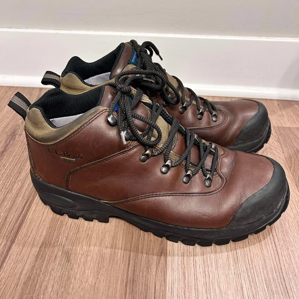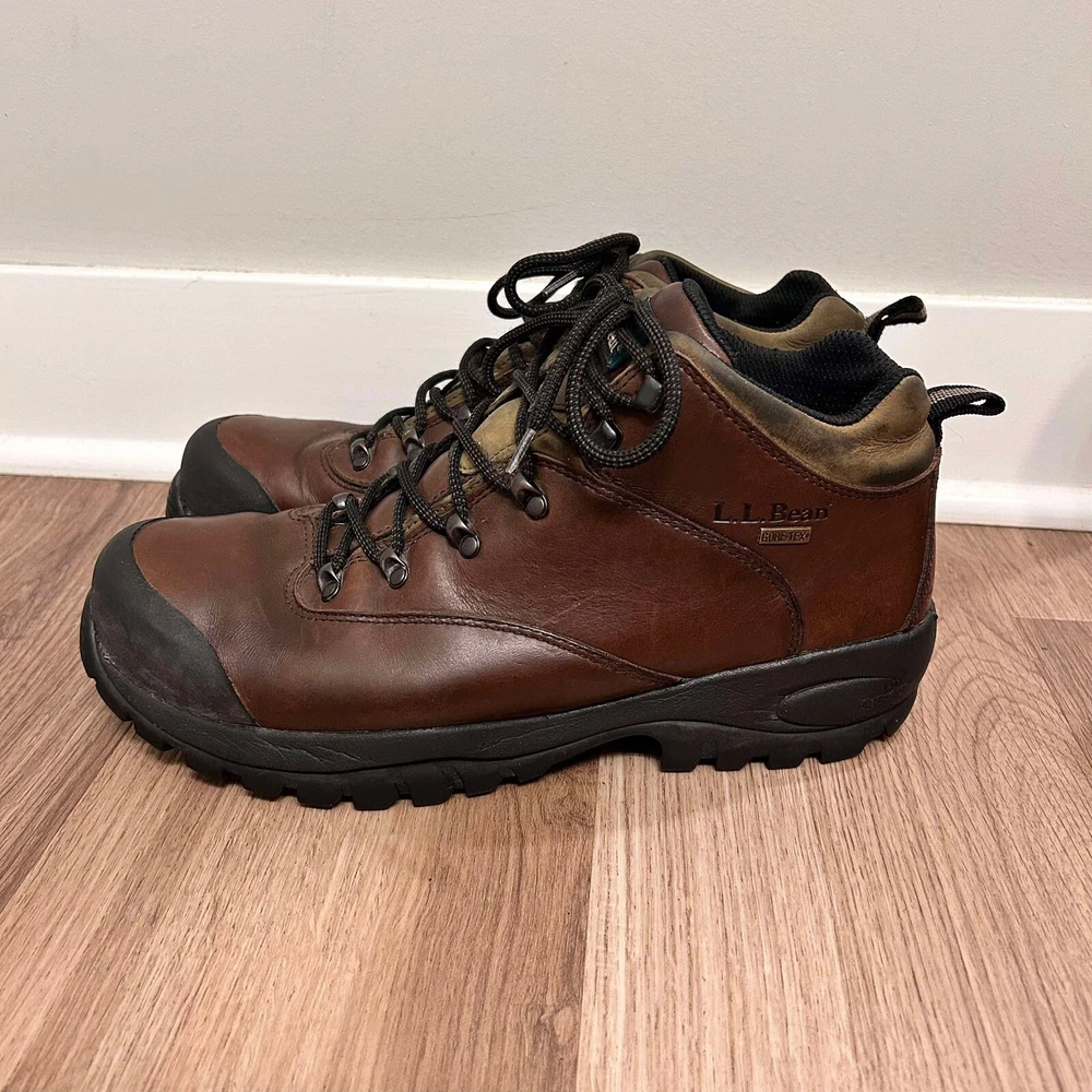 These LL Bean boots are perfect for any outdoor activity. With a solid pattern and brown color, they are made of leather with a fabric lining and insole for added comfort. The round toe shape and lace-up closure make them easy to put on and take off. The boots are water-resistant and feature a rubber outsole for durability, making them perfect for all seasons. The vintage style adds a touch of nostalgia to any outfit. *Mens size 12 W, minimal wear, tread is still in great shape. Great shoe with lots of life left. Leather cleaned with high quality saddle soap and conditioned.