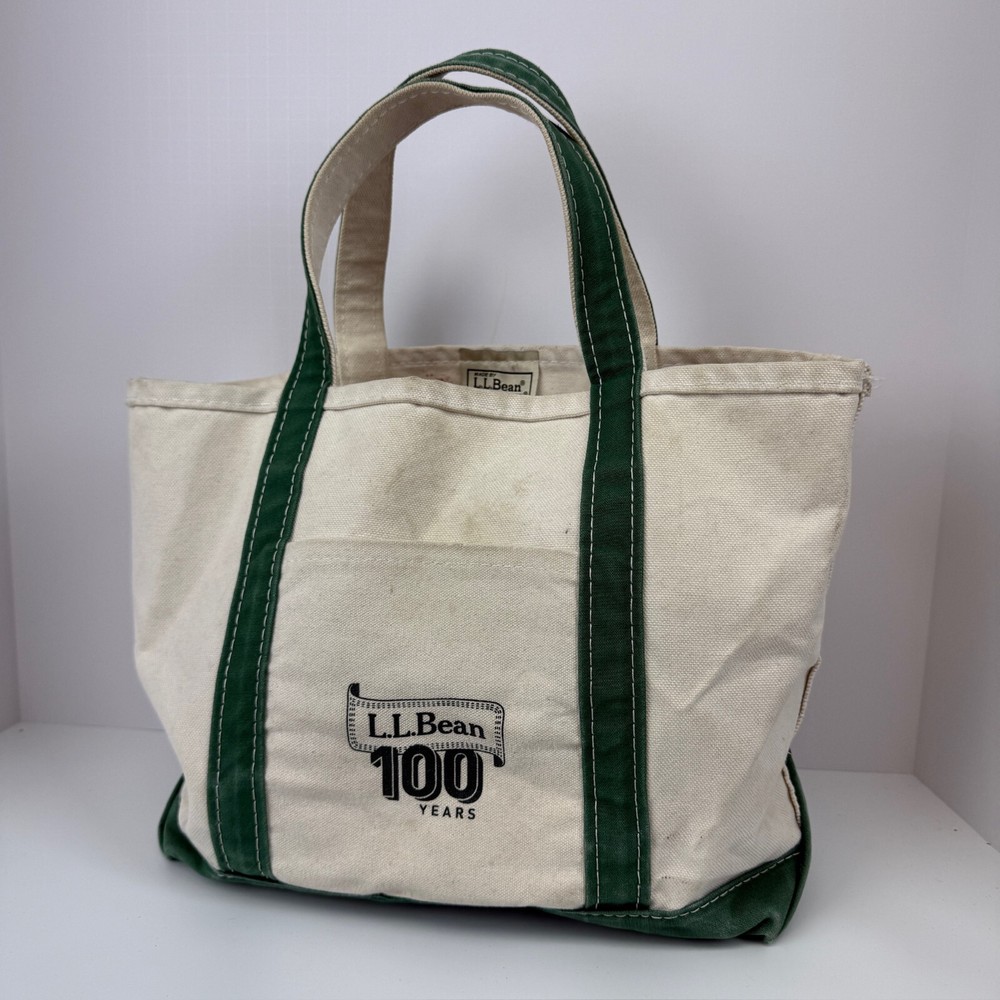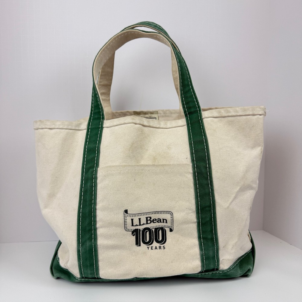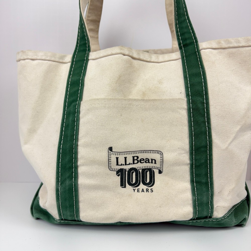 LL Bean 100 Years Anniversary Medium Boat and Tote Bag Green Canvas USA Green some marks throughout but no major flaws or holes 14" x 15" x 5" 7" strap drop