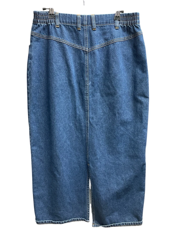 Crafted for versatility and timeless style, the L.L. Bean Denim Midi Skirt is a classic addition to any wardrobe. This knee-length A-line skirt in a rich blue hue is a size 10 and fits comfortably with a high-rise waist, ensuring a flattering silhouette for various body types. Its solid denim fabric, washed to a medium tone, offers a relaxed yet put-together look, perfect for casual outings. The skirt features practical elements like pockets for convenience and a slit for ease of movement, blending functionality with fashion. Embodying the spirit of American vintage chic, it's ideal for channeling bohemian, cowboy, '80s, and '90s themes. Made in the United States, this machine-washable garment is a testament to quality and enduring style. elastic panel waist 15" waiat lying flat 19" hips 34" length