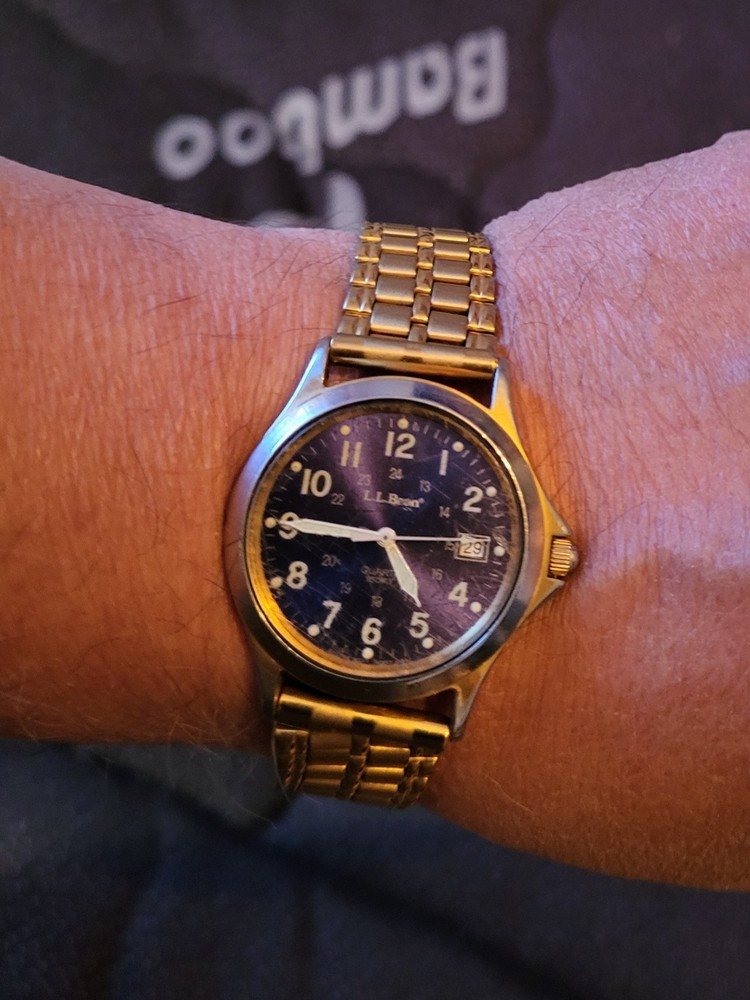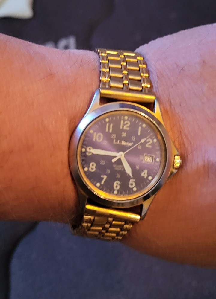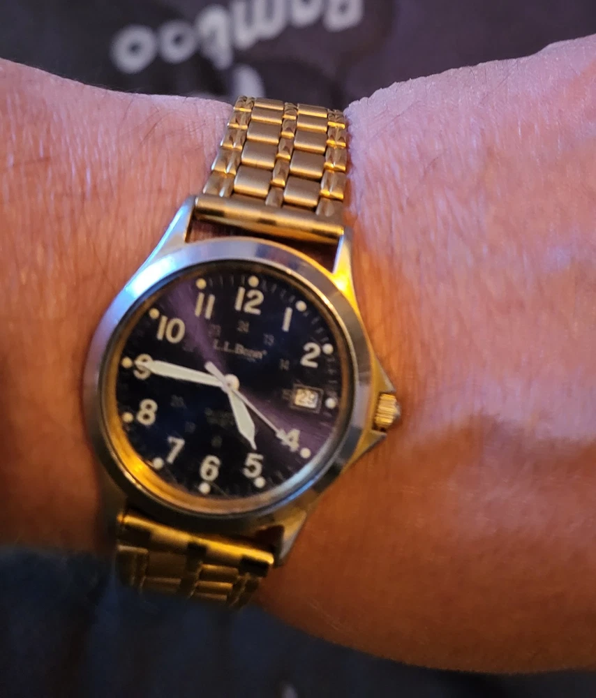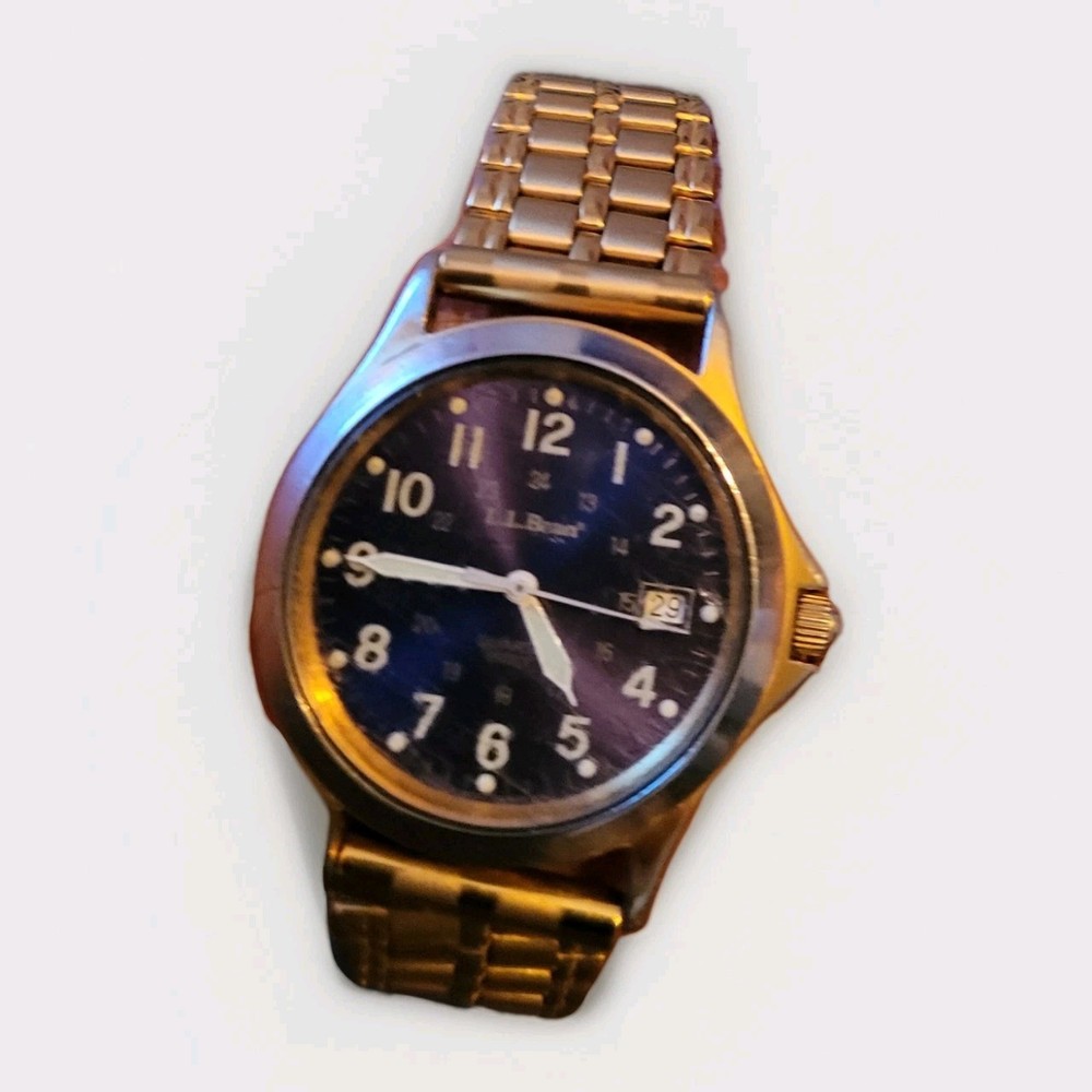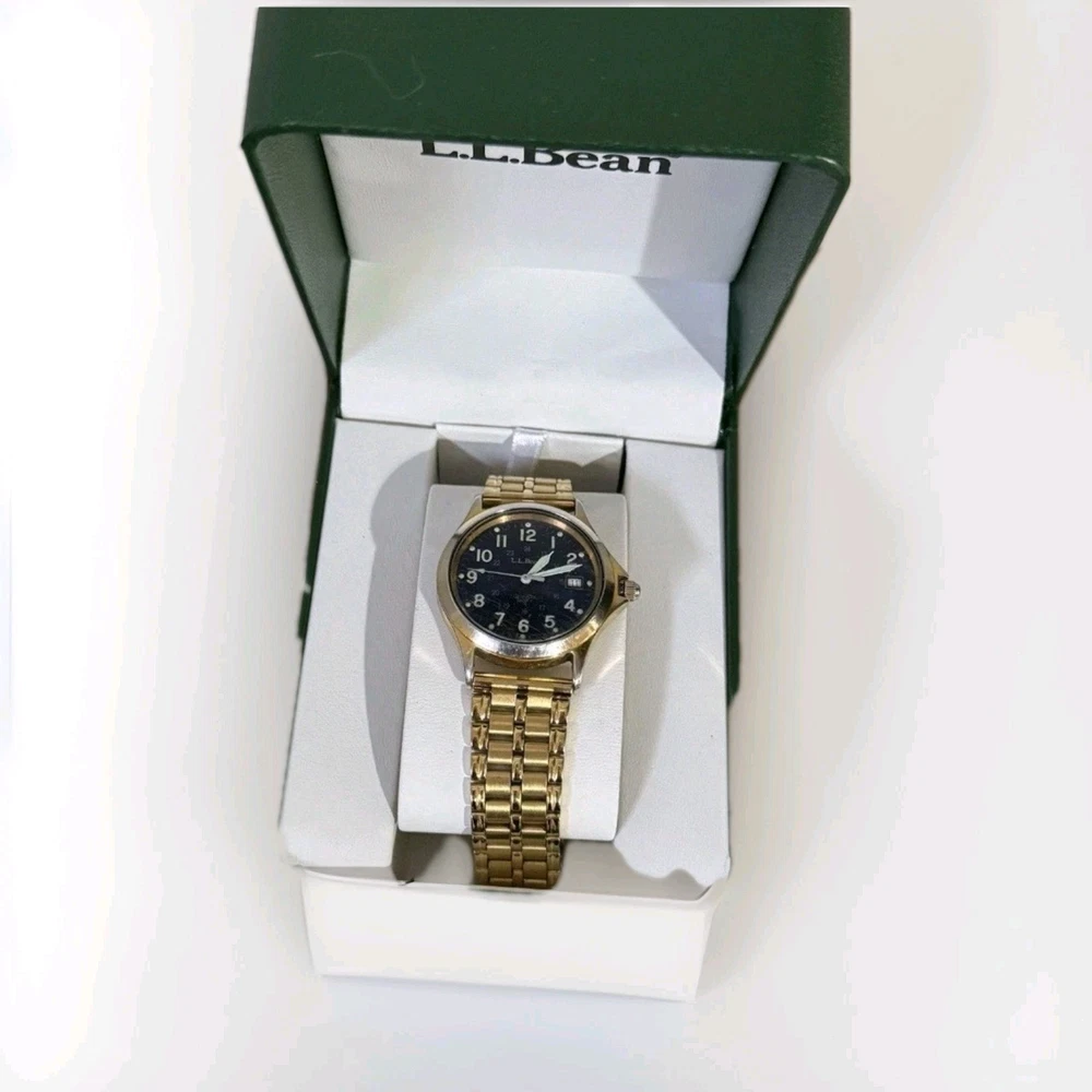 Embrace timeless functionality with the LL Bean Field Watch, a quintessential timepiece for any wardrobe. Crafted with a durable stainless steel case and band, this watch boasts a classic blue dial accented with luminous hands and Arabic numerals. The gold bezel and matching band/strap add a touch of elegance, making it suitable for both casual and sporty occasions. Not just a handsome face, this Swiss-made wristwatch features a reliable quartz movement, water resistance up to 150 meters, and a screwdown crown for ultimate protection. The watch comes complete with its original box, manual, and papers, affirming its authenticity and quality craftsmanship from the 1990s.