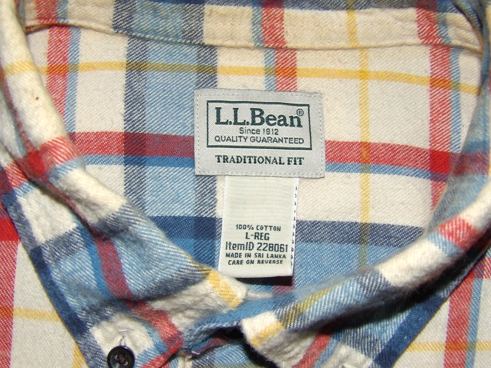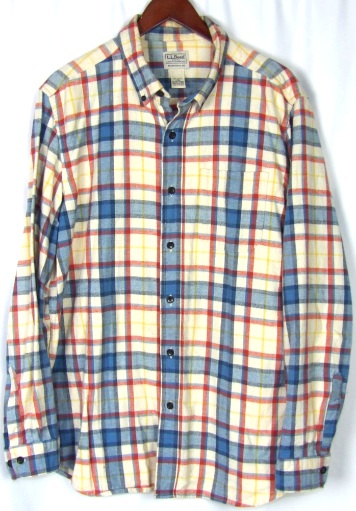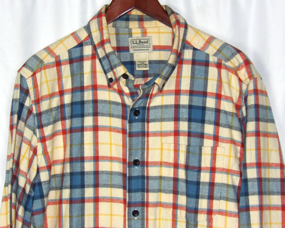 Please read the entire listing before bidding! Description : Men's L.L. Bean Long Sleeved Plaid Flannel Button Up Shirt. Item Condition: This Is In Excellent Used Condition! No Rips Or Stains! Comes From A Pet/Smoke Free Home! Color: Multi-colored plaid Size: Large Armpit To Armpit: 25" Length (Top of collar to bottom hem): 31" Sleeve length (Shoulder seam to end of cuff): 26"