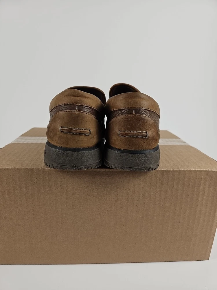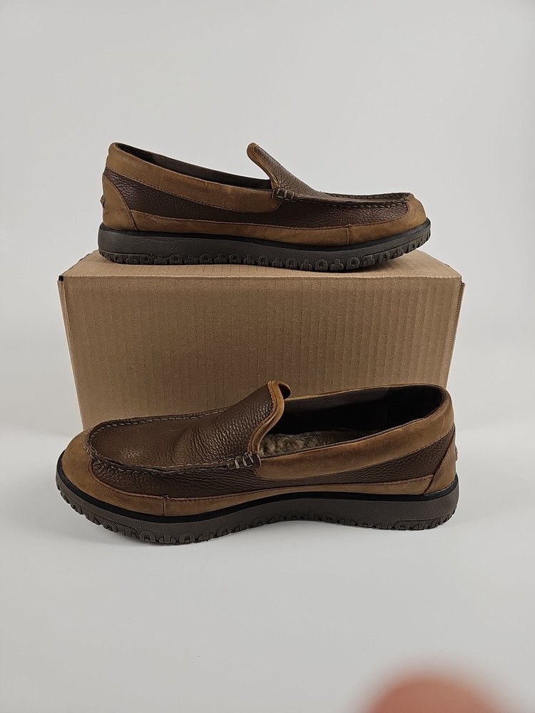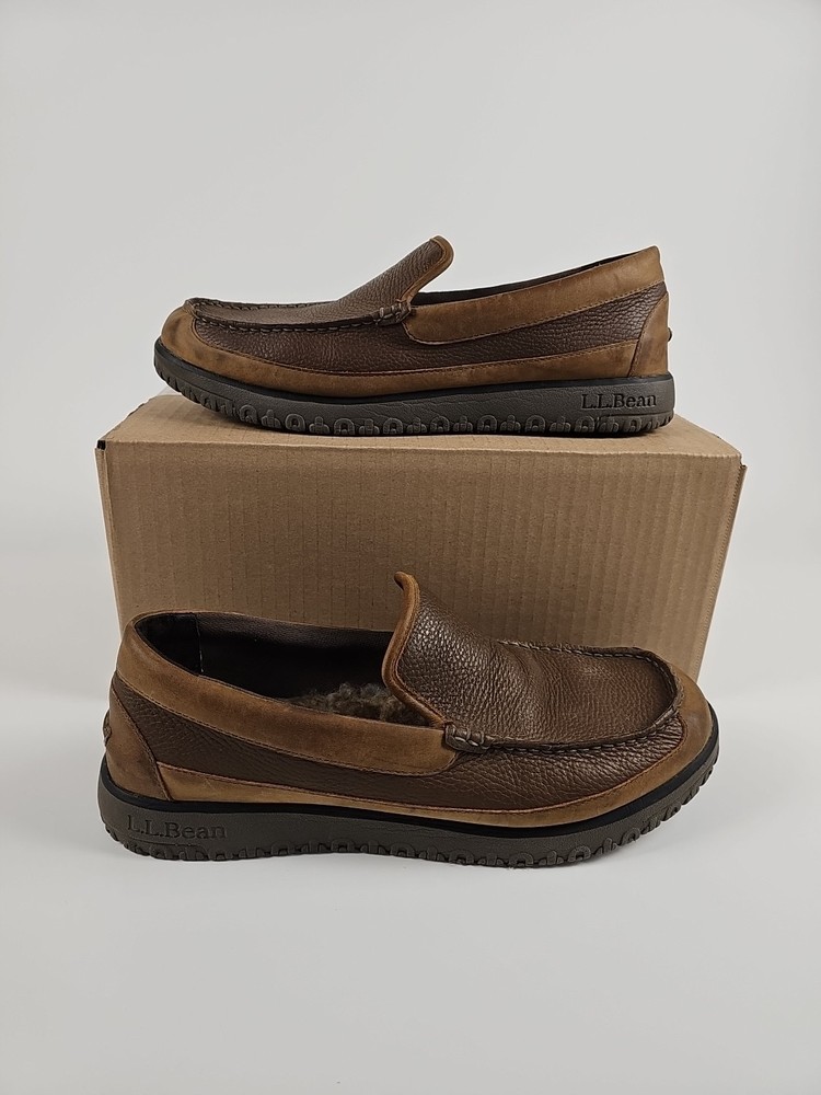 The LL Bean Men's All Week Slipper Mocs in brown leather with shearling lining are a classic and comfortable choice for casual wear. These slip-on moccasins feature a round toe, flat heel, and a lined interior for added warmth during the winter season. With a solid brown color and leather upper material, these slippers are both stylish and durable. Perfect for men looking for a high-quality and timeless footwear option, these LL Bean slipper mocs are a reliable choice for all week wear.