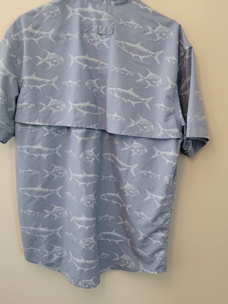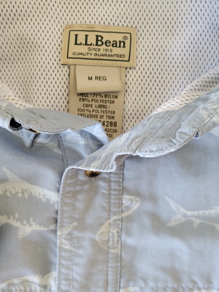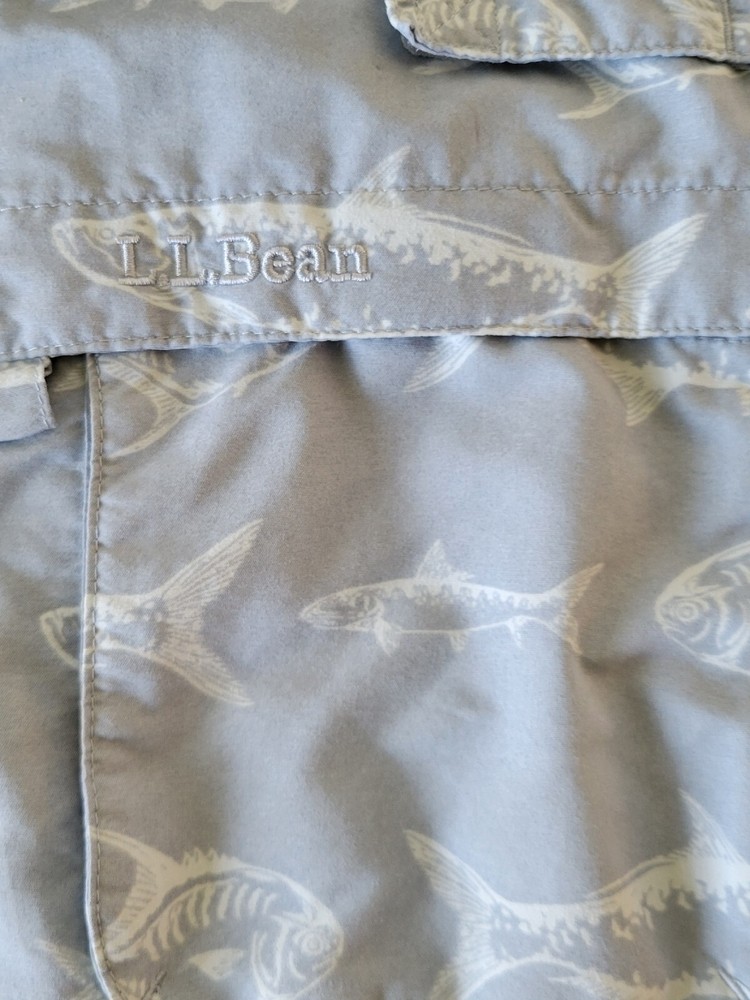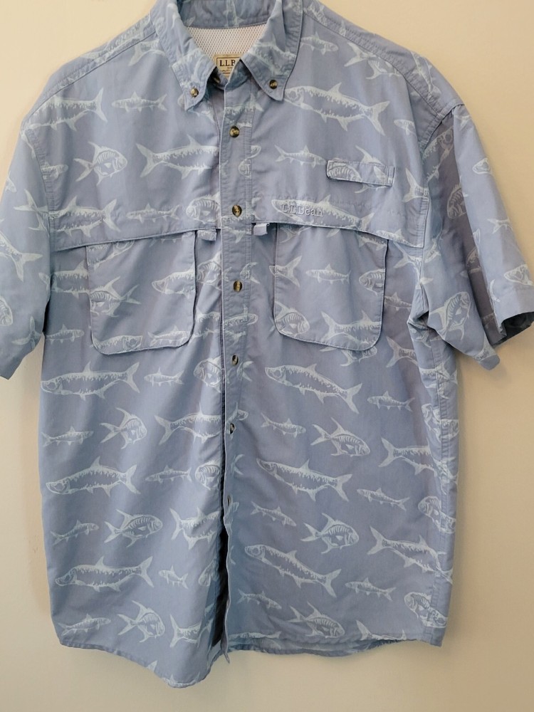 This is a men's L.L. Bean shirt in size Medium with a blue fish graphic print on a cotton knit fabric. It has a collared neckline with a button-up closure and short sleeves. The shirt features a point collar, double-sided design, pockets, and a machine washable care instruction. This casual button-up shirt is suitable for travel, workwear, or casual occasions during the fall and spring seasons.