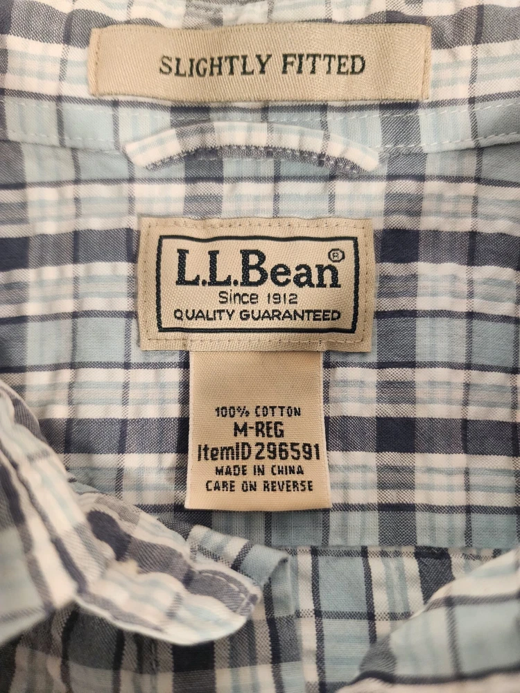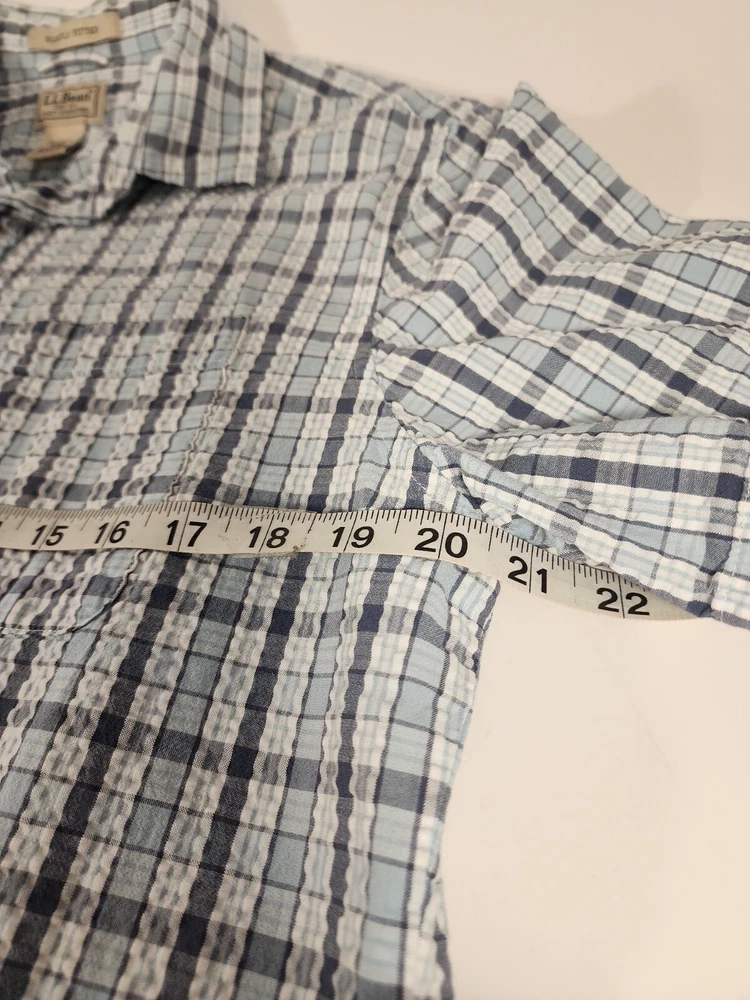 LL Bean Mens M Blue White Check Short Sleeve Button Down Shirt 100% Cotton