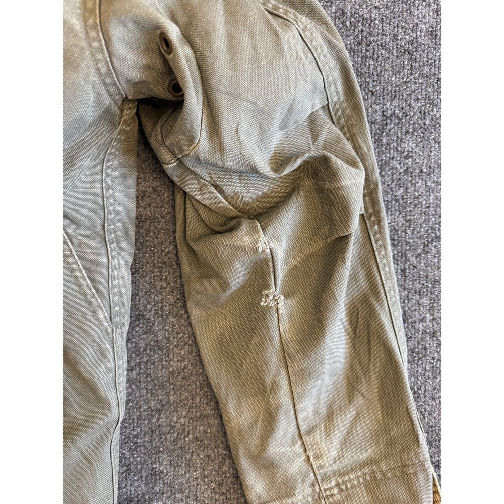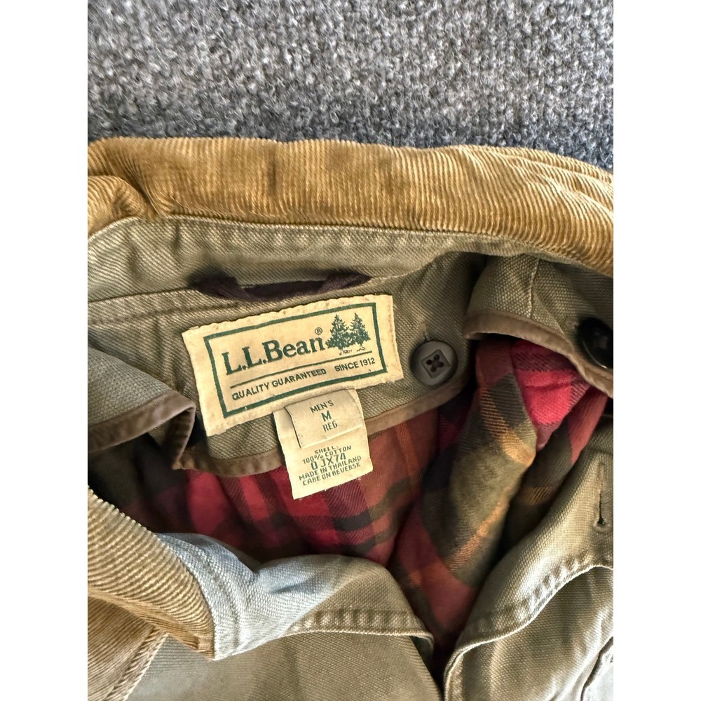 L.L. Bean Original Field Coat in a classic olive drab green cotton canvas features a warm red plaid flannel lining and a tan corduroy collar. This rugged workwear staple is designed with a button-front closure, multiple large utility pockets including a zippered chest pocket, and reinforced shoulders. Underarm grommets provide ventilation, while the durable construction ensures long-lasting wear for outdoor activities or casual everyday use. Note the visible wear and small holes on the sleeve as shown in the photos, adding to its authentic vintage character. See photos for condition.