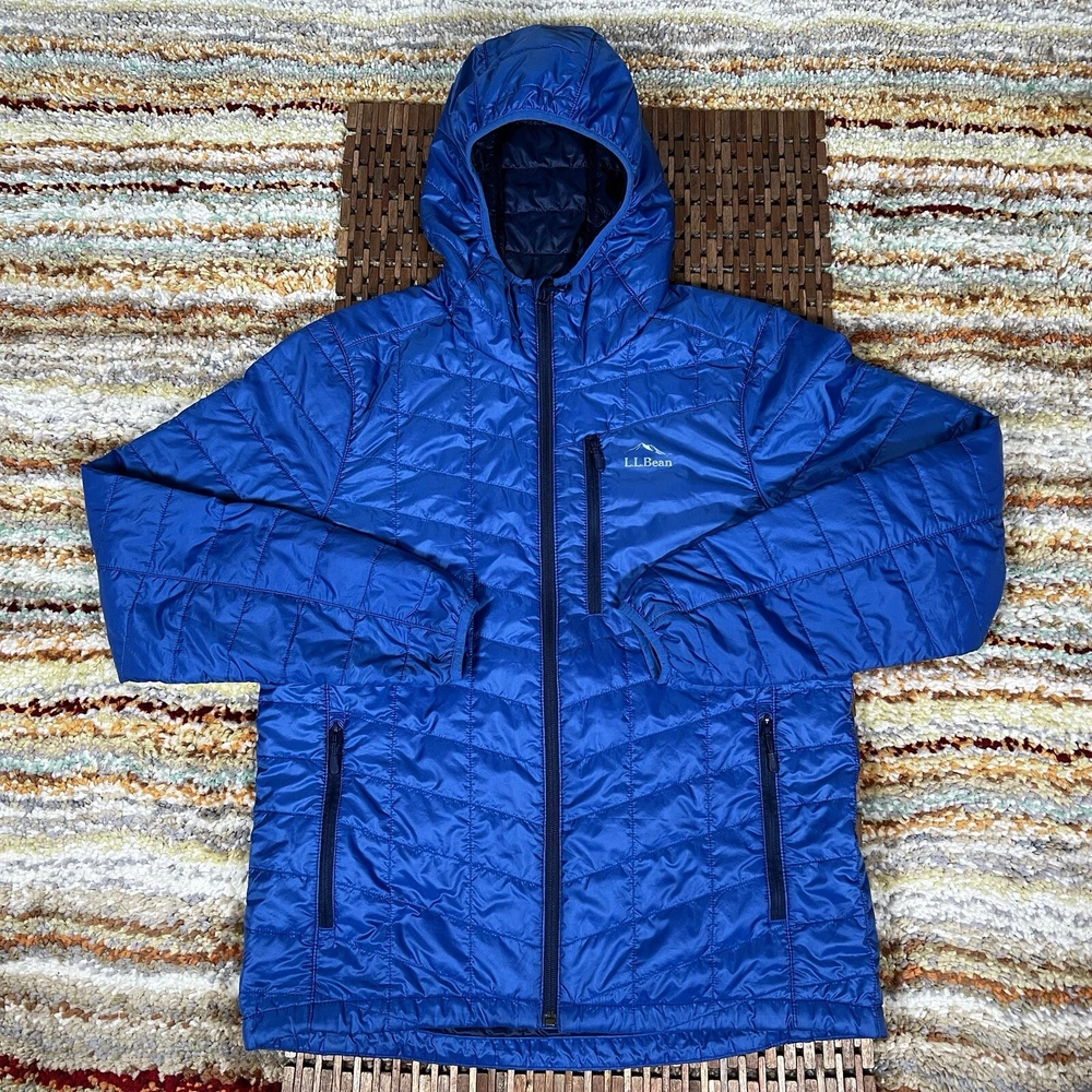 This is a blue LL Bean Ultralight Puffer Jacket in size Medium for men. It features a nylon outer shell, polyester insulation, a zip closure, and a hood. The jacket is designed for outdoor activities like skiing, hiking, and jogging, and offers windproof and breathable properties. It is lightweight and suitable for all seasons. The design includes quilted accents, zippered pockets, and the L.L. Bean logo, making it a stylish and functional choice for casual wear or travel.