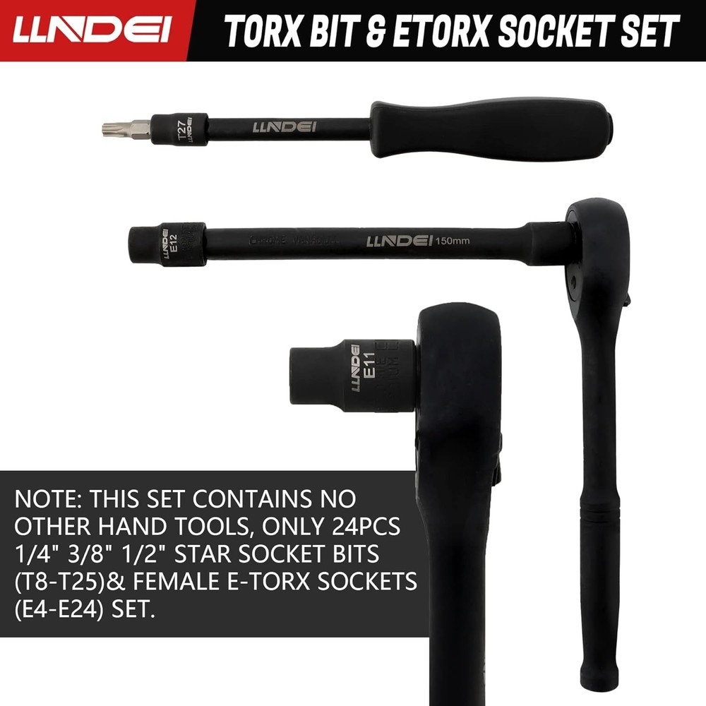 Torx Bit Socket and Female External Set 24PCS, LLNDEI 10 Star 24PCS Product Details Brand: LLNDEI Material: Chrome Vanadium Steel Drive System: Torx, Star, Torq-Set Finish Type: black phosphate finish Number of Pieces: 24 Manufacturer: LLNDEI Part Number: LLNDEI 24 Item Weight: 13.8 ounces Product Dimensions: 5.12 x 4.72 x 2.2 inches Country of Origin: China Item model number: LLNDEI 24 Size: 24PCS Finish: black phosphate finish Shape: torx Power Source: manual Torque: 569 Newton Meters Item Package Quantity: 1 Measurement System: Metric Compatible Fastener Range: 0.375 inches Included Components: TORX BIT SOCKET 1/4"DRIVE:T8,T9,T10,T15,T20,T25,T27,T30,T35,T40, E-TORX SOCKET 3/8"DRIVE:E10, E11, E12, E14, E16, E-TORX SOCKET 1/2"DRIVE:E18, E20, E22, E24, E-TORX SOCKET 1/4"DRIVE:E4, E5, E6, E7, E8 Batteries Included?: No Batteries Required?: No Brand: LLNDEI Material: Chrome Vanadium Steel Drive System: Torx, Star, Torq-Set Finish Type: black phosphate finish Number of Pieces: 24 Chrome Vanadium Steel DURABLE: Female Torx socket set & star bits set meets ANSI and DIN performance standards, constructed of heat-treated chrome vanadium steel(50BV30)and S2 with black phosphate finish for strength and durability. E-TORX SOCKET SET INCLUDE: 1/4"drive: E4, E5, E6, E7, E8; 3/8"drive: E10, E11, E12, E14, E16; 1/2"drive: E18, E20, E22, E24. TORX BIT SET INCLUDE: 1/4" drive:T8,T9,T10,T15,T20,T25,T27,T30,T35,T40. WIDE APPLICATIONS: Torx and e-Torx sockets can meet your requirements for multiple projects, it is an essential tools for your car, motorcycle, bicycle, lawn equipment, electrical appliances, machinery, etc. EASY TO USE: The torque socket set is equipped with a dedicated storage box, and each position is marked with dimensions for secure storage, laser etched high contrast and specific size marks make identification easier. 【889 certification】Our product has obtained U.S. Section 889 certification and meets all government requirements, so you can purchase with confidence.