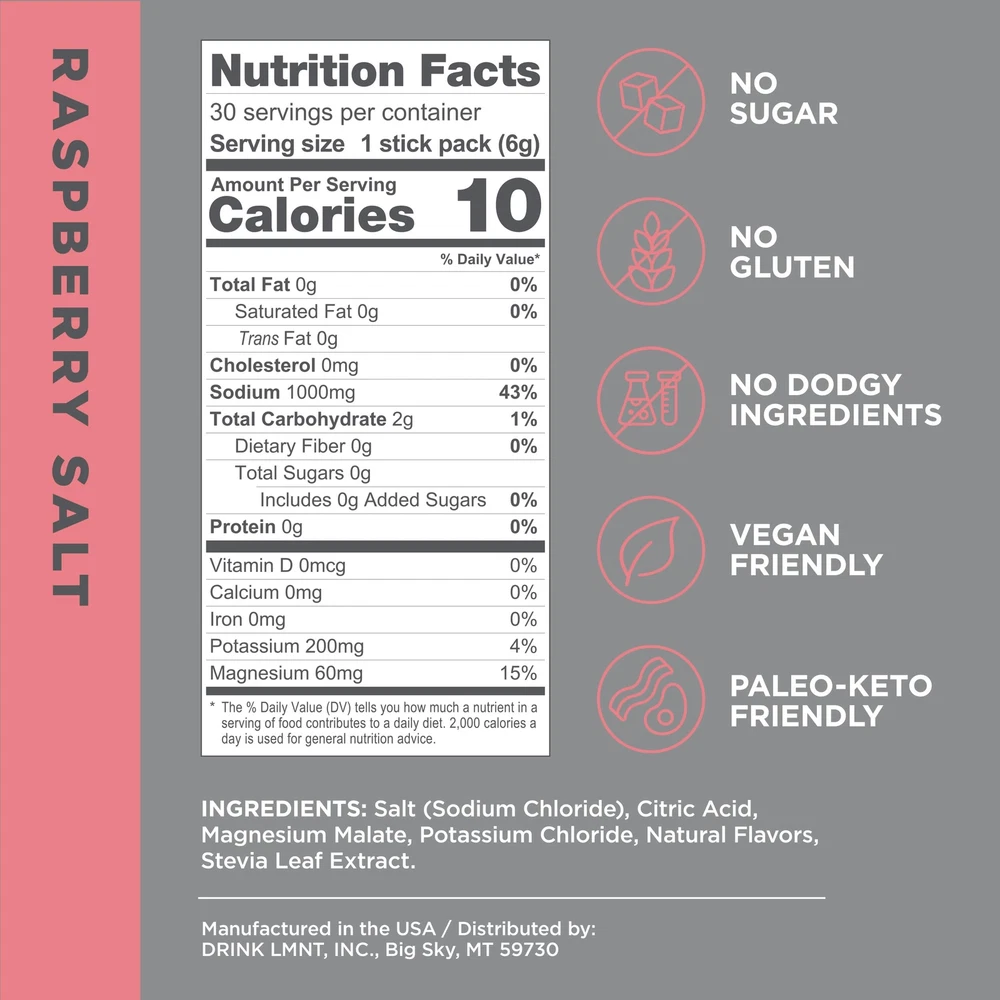 LMNT Zero Sugar Electrolytes - Raspberry Salt | Drink Mix | 30 Count THE BEST ELECTROLYTE DRINK MIX EVER: LMNT is a tasty electrolyte drink mix with everything you need and nothing you don't — perfect for training, low-carb or keto diets, fasting, and those leading active lifestyles. MORE SALT, NOT LESS: A growing body of research reveals that optimal health outcomes occur at sodium levels 2-3x government recommendations. That’s why we say, More Salt, Not Less. OUR FORMULATION: Each stick pack contains 1000 mg sodium, 200 mg potassium, 60 mg magnesium — a truly meaningful serving of electrolytes in a science-backed ratio. FEEL THE DIFFERENCE: All-day energy starts with optimal hydration. More energy. No brain fog or cramps. You feel the difference when you get it right. HOW TO #STAYSALTY: Mix one stick pack with 16–32 ounces of water, sparkling water, tea, smoothie, or more. Shipping We offer FREE shipping on all orders! We ship within Three business days of payment, usually sooner. We use a selection of shipping services such as UPS, FedEx, USPS etc. We only ship to the lower 48 states, no APO/FPO addresses or PO Boxes allowed. Local pickups and combined shipping options are not provided at this time. Return You can return a product for up to 30 days from the date you purchased it. Any product you return must be in the same condition you received it and in the original packaging. Please keep the receipt. Payment We accept payment by any of the following methods: PayPal Please pay as soon as possible after winning an auction, as that will allow us to post your item to you sooner! Feedback Customer satisfaction is very important to us. If you have any problem with your order, please contact us and we will do our best to make you satisfied. Contact Us If you have any queries, please contact us via ebay. We usually respond within 24 hours on weekdays. Please visit our eBay store to check out other items for sale! Thank you for shopping at our store.