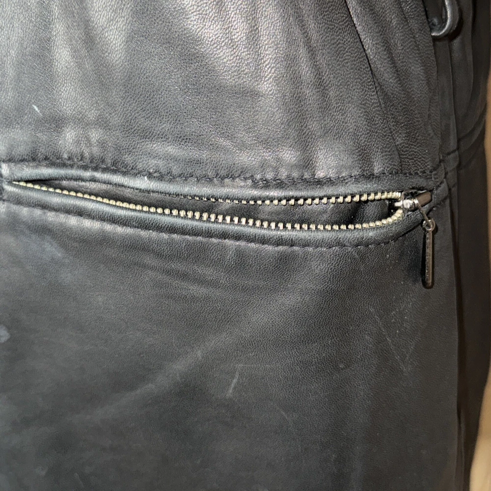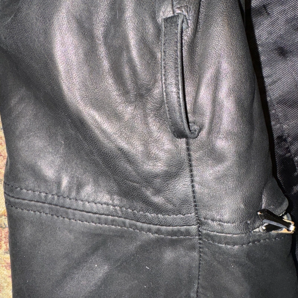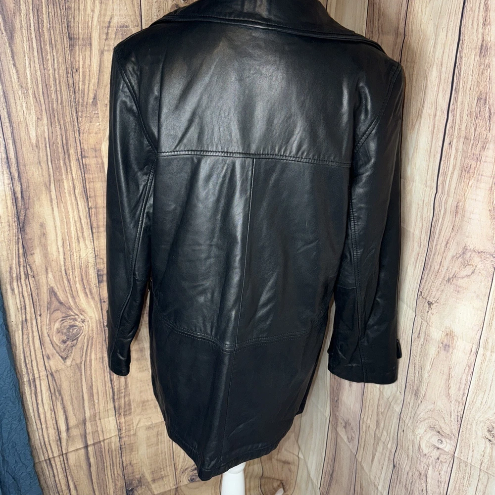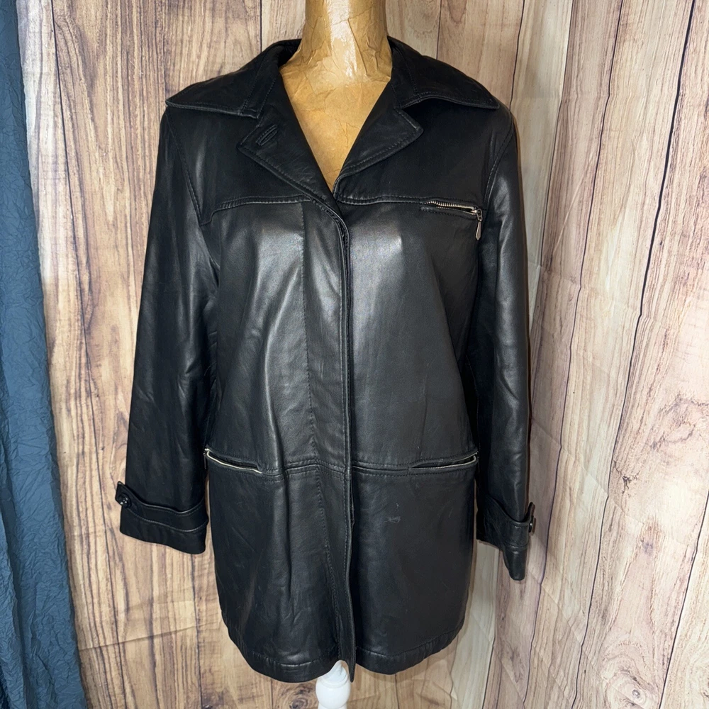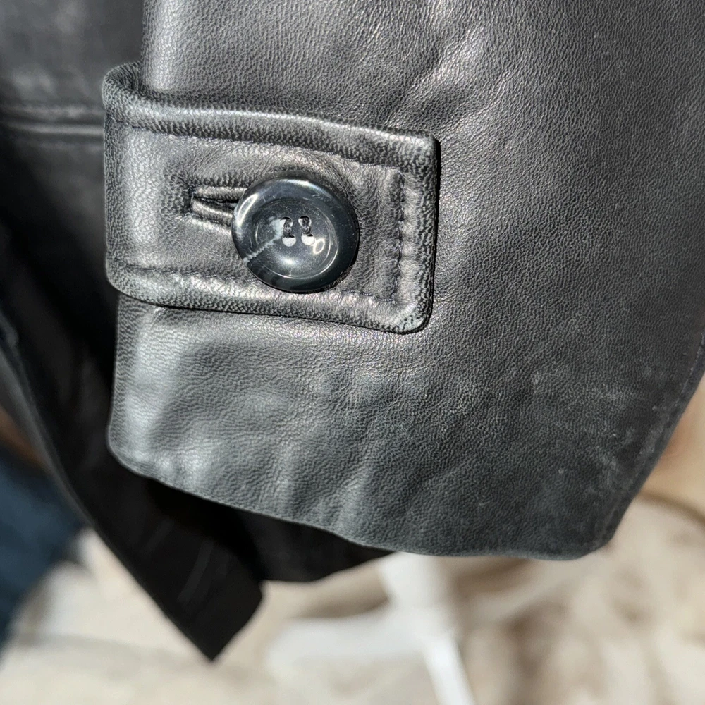 Size: PM Type: Jacket Department: Women Fabric Type: Leather Jacket/Coat Length: Mid-Length Size Type: Regular Color: Black Outer Shell Material: Leather Style: Basic Jacket Features: Pockets, Lightweight Brand: Medium Lining Material: Nylon Closure: Button Theme: Classic