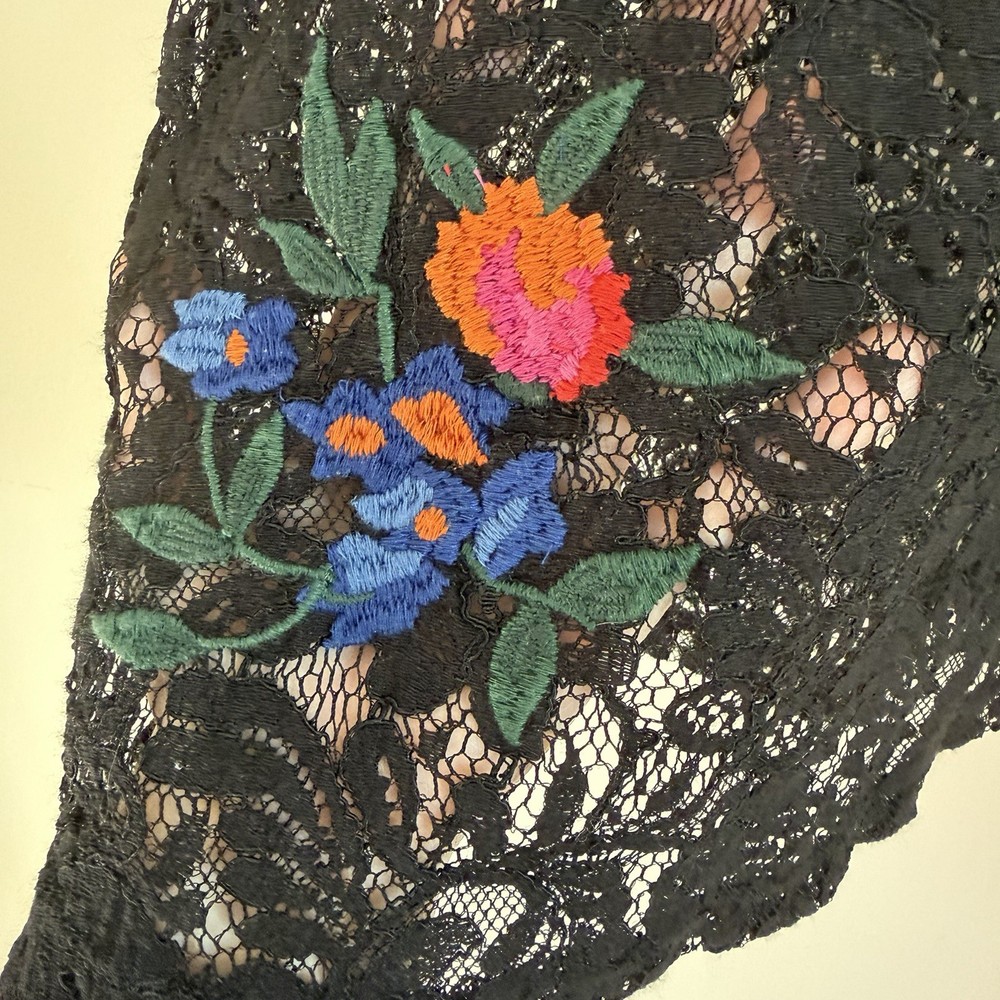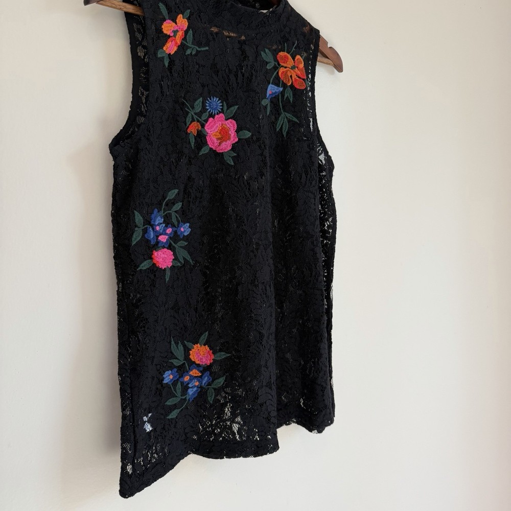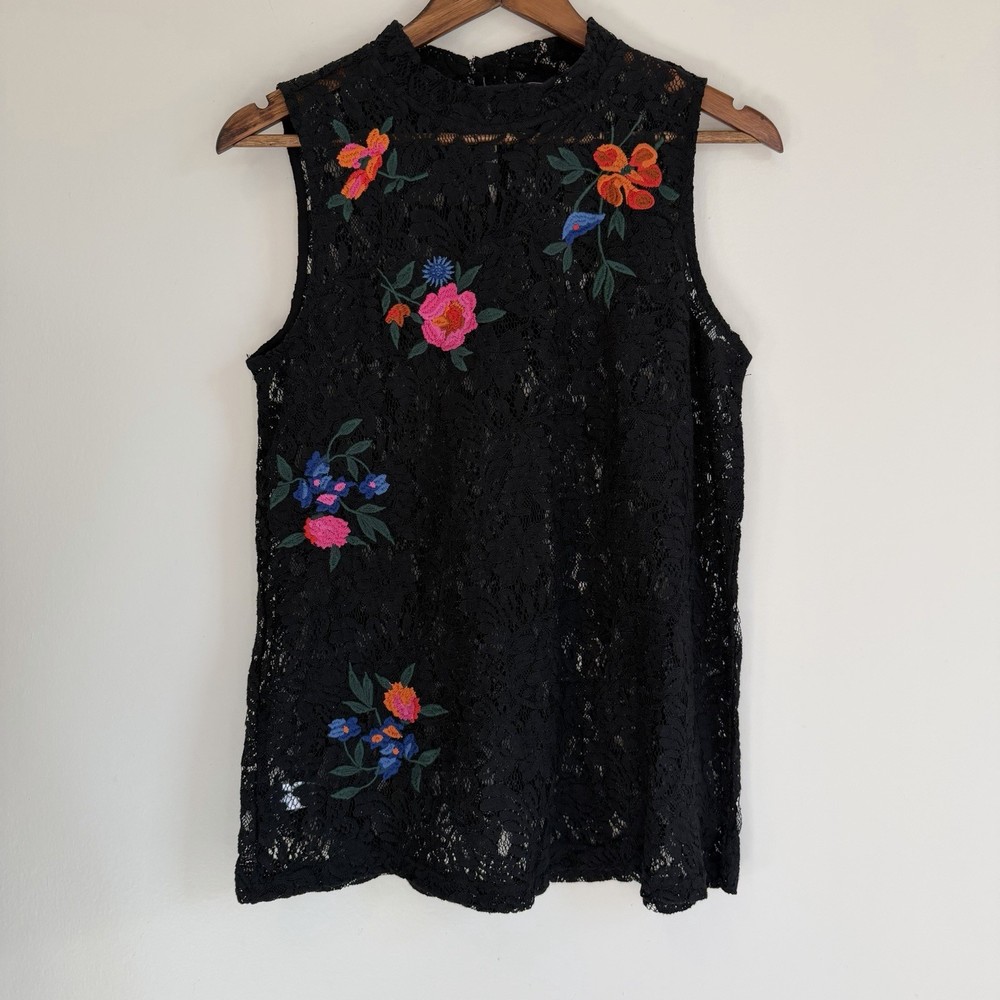 Beautiful LOFT black lace sleeveless top featuring colorful floral embroidery throughout. Sheer lace overlay with mock neckline and flowy silhouette. Perfect for layering or styling boho chic year-round. Measurements: Pit to Pit: 18.5" Length: 26" boho top, embroidered floral, black lace blouse, sheer lace top, cottagecore, romantic style, festival outfit, sleeveless blouse, layered look, feminine chic, boutique style, LOFT blouse, floral embroidery top