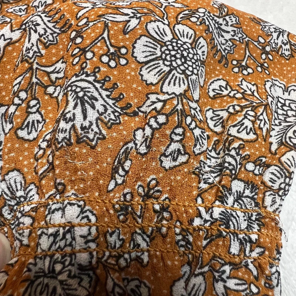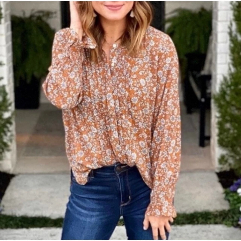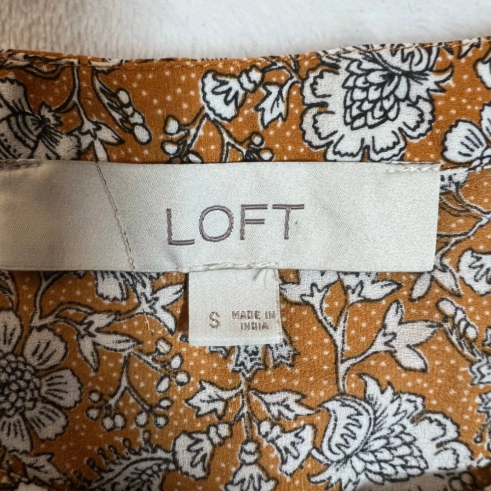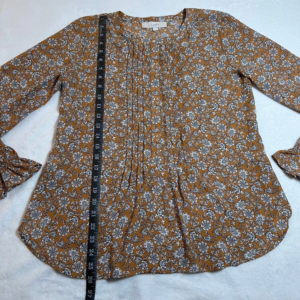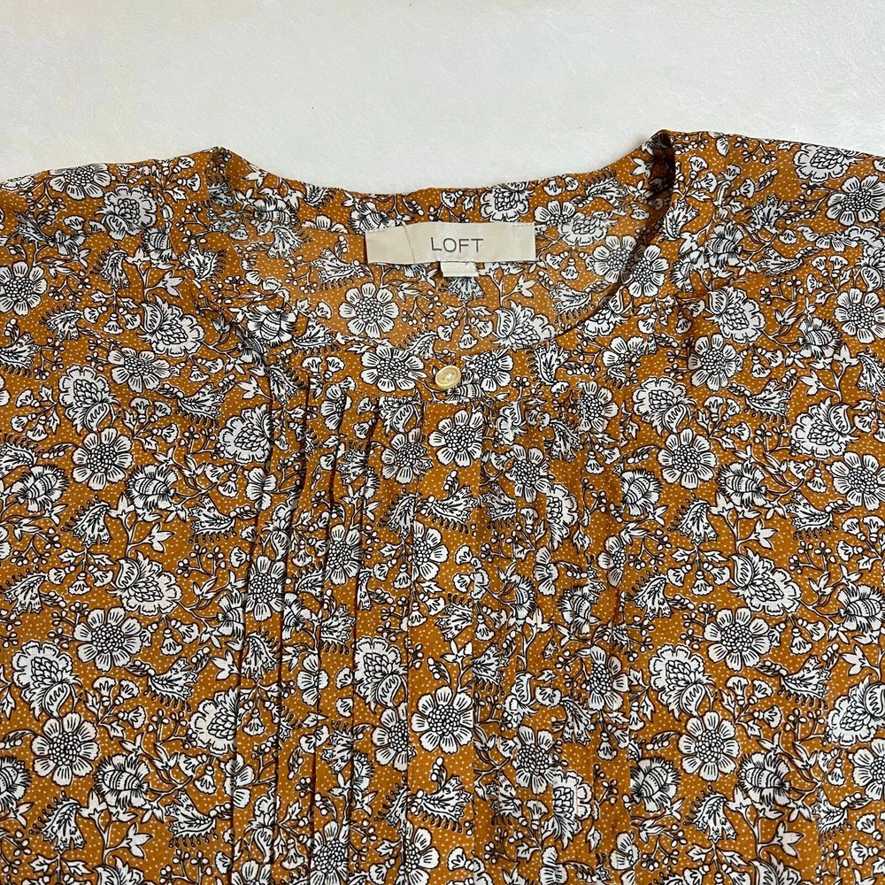 LOFT Crewneck Floral Print Pleated Front Blouse Size Small Lightweight Office CONDITION: Pre-Owned. Excellent Used Condition. FLAWS/ALTERATIONS: There is a tiny snag on the sleeve. Please see the last picture. COLOR: Orange/White/Black SIZE: Women’s Size Small DETAILS: Crewneck Long sleeve Elastic cuffs Floral print Pleated front 3/4 button down Lightweight MEASUREMENTS: Chest: 19.5" Full Length: 26" **All measurements are approximate and are taken flat** MATERIAL: 100% Polyester Bundle 2 OR MORE items to save more! Reasonable offers are welcomed! TAGS: Casual Comfy All Season Floral Contemporary Maximalist Career Office Professional Boho Bohemian Hipster