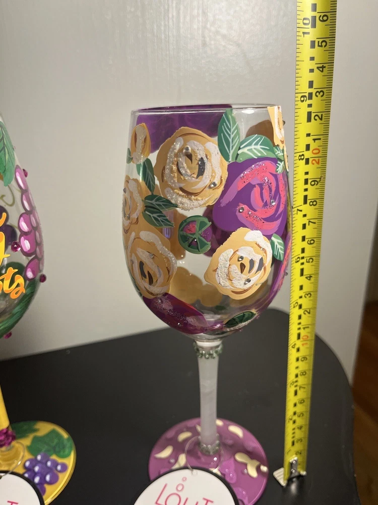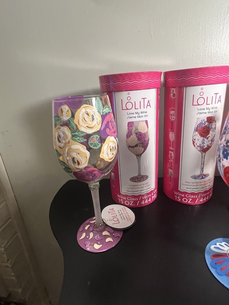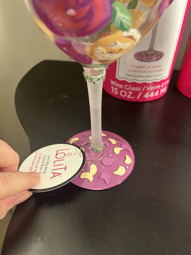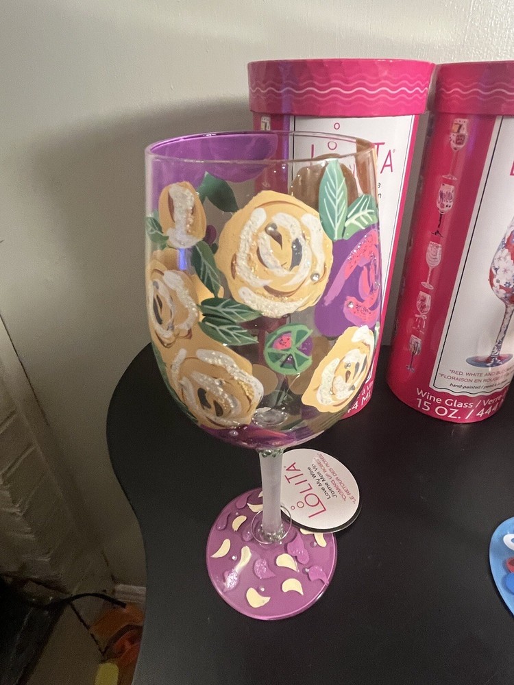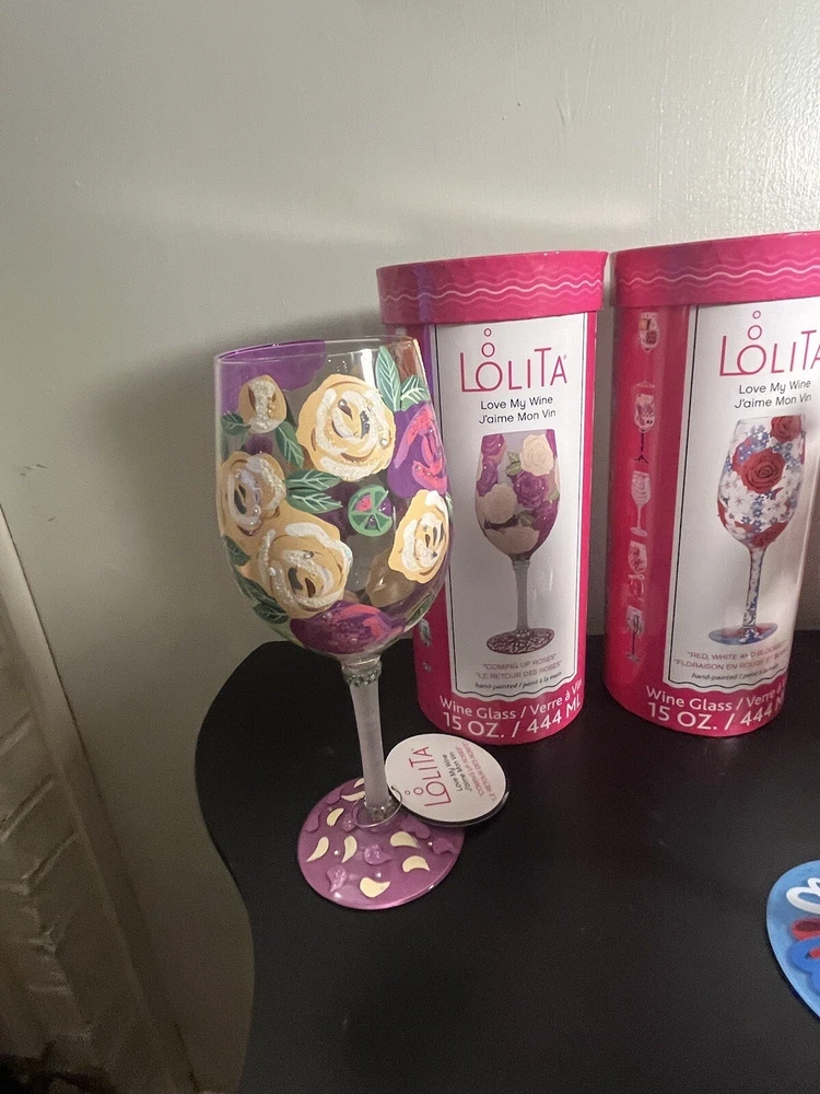 This gorgeous hand-painted Lolita wine glass is a must-have for any wine lover! The vibrant purple and yellow "Coming Up Roses" design adds a pop of elegance to every sip. I love the thoughtful touch of a recipe on the stem—such a fun surprise. The glass feels premium, and the bright pink cylinder box makes it perfect for gifting. Shipped fast, it arrived in time for Mother’s Day. Whether for a special occasion or just to treat yourself, this glass turns ordinary wine nights into something magical. Highly recommend!
