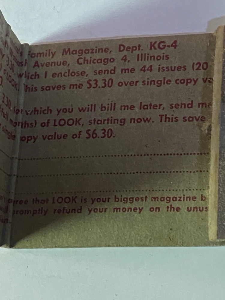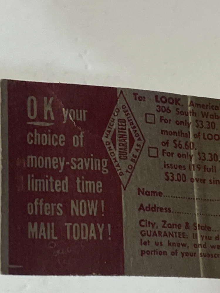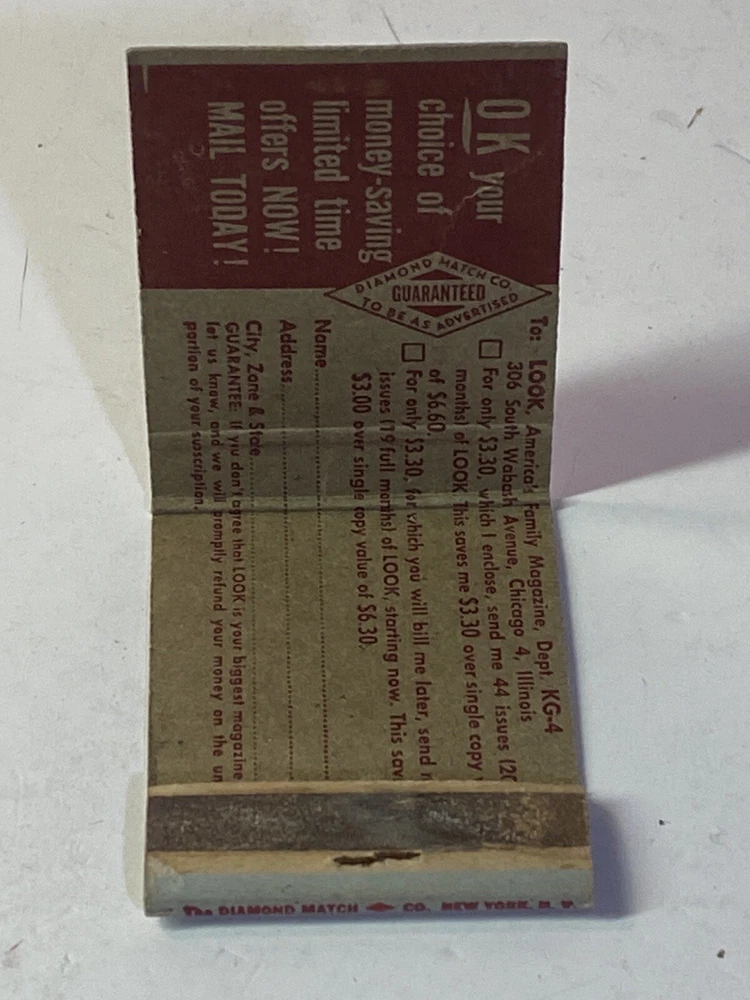 Please note: Buy any 5 or more listings of Matchbooks - Postcards - Advertising Pens - Advertising Pencils - Photographs (unframed) all in one checkout and we will combine and ship USPS ground advantage with tracking for free to you . All one category or mix it up. It helps if you drop us a quick message as you check out that you are doing this and how many listings (5 or more) you are purchasing under this offer. Have a question? Ask before you buy. Thank you. Good vintage condition.