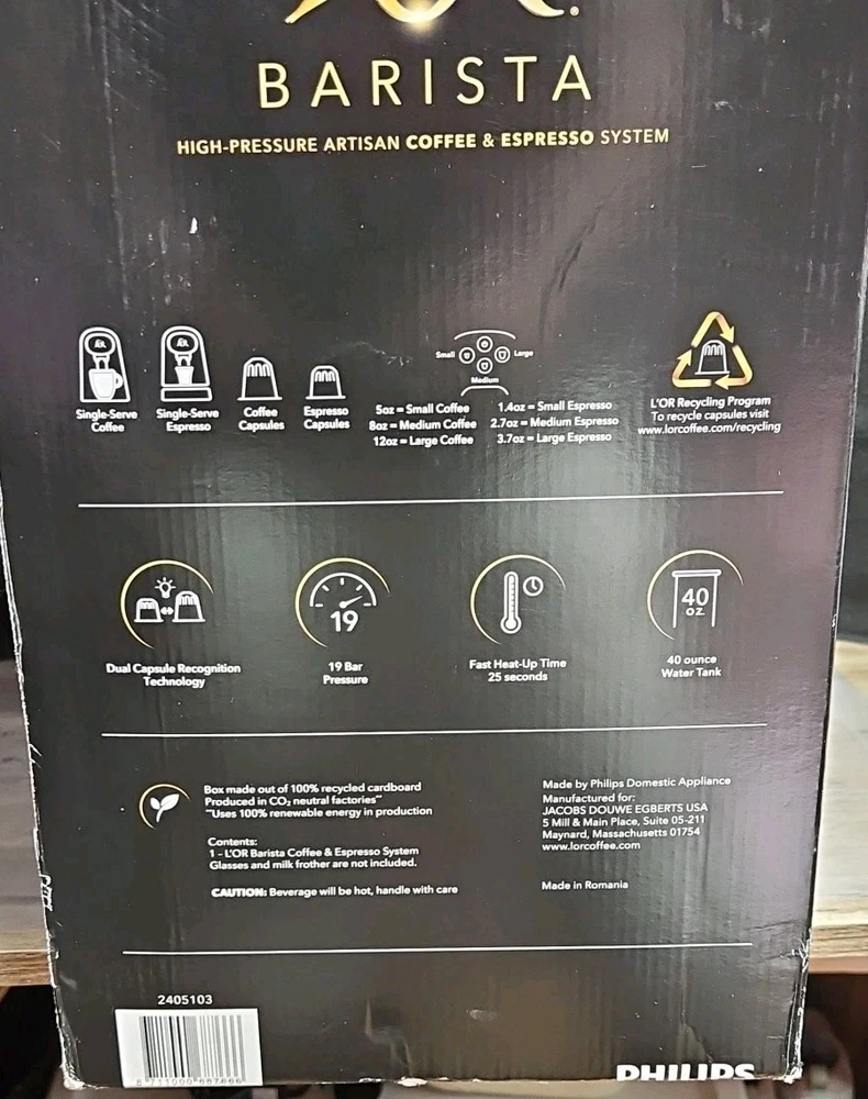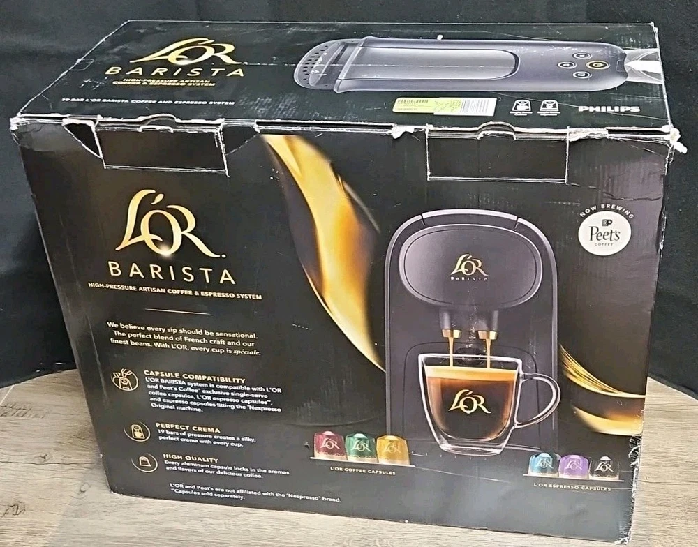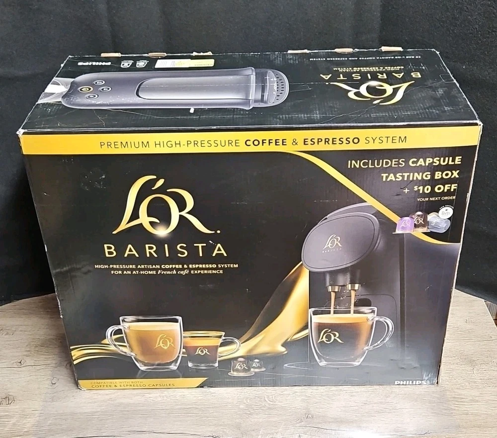 L'OR Barista System | Coffee & Espresso Maker This unit has been thoroughly tested and is fully functional. It has seen minimal use and is prepared for its next deployment. Condition & Specifics: Performance: Comprehensively tested; operates flawlessly. Exterior: Previously owned with minor cosmetic abrasions. No significant damage is present. Packaging: The original retail packaging is included, exhibiting some visible wear and tear. Please Note: The original capsule tasting box is not included. Imagery: Kindly refer to all provided images for an accurate representation of the unit's and packaging's condition. Key Features & Specifications: Dual-Capsule Compatibility: Capable of brewing both high-pressure espresso and standard drip coffee utilizing L'OR Barista and Nespresso* Original capsules. Automatic Capsule Recognition: Intelligently identifies capsule dimensions to dispense the optimal volume of water and pressure for each serving. 19-Bar High Pressure: Delivers professional-grade crema and robust flavor extraction, consistent with high-end espresso machines. Versatile Brew Sizes: Offers a selection of 6 distinct beverage volumes, ranging from a 1.3 oz espresso to a full 12 oz coffee. Rapid Heating: Attains brewing temperature swiftly, ensuring prompt enjoyment of your beverage. Generous Water Reservoir: Equipped with a removable tank for convenient refilling and maintenance. Ships within 1 business day.