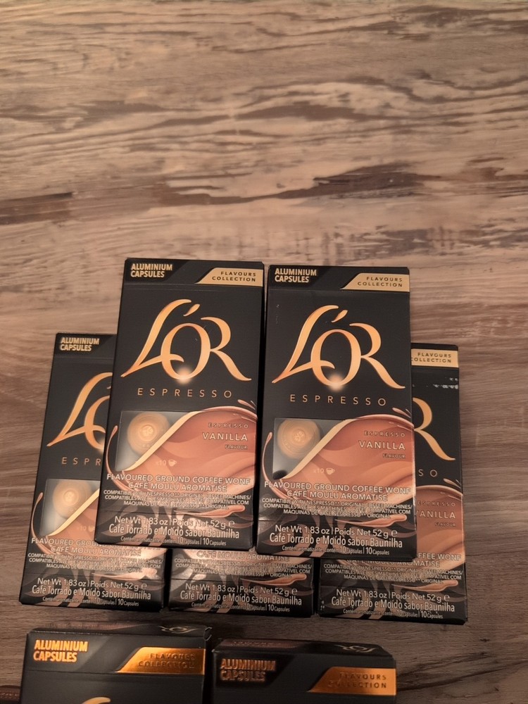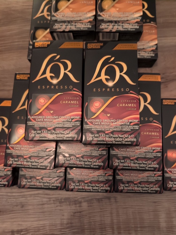 L'OR Espresso Coffee Aluminum Capsules. 100 caramel and 50 vanilla. BB dates in the pictures. Boxes are in great shape.
