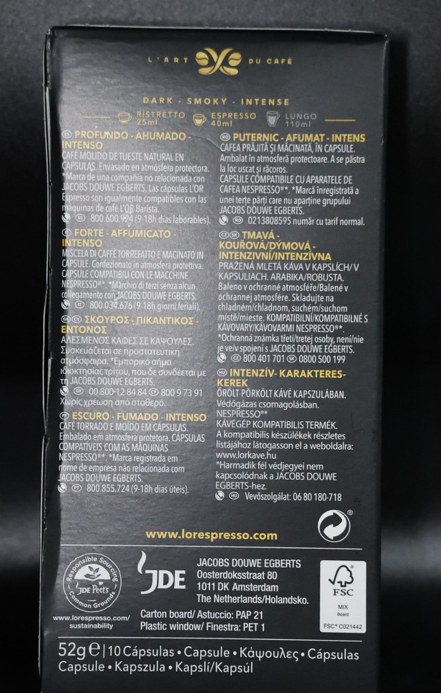 L'OR Espresso - Onyx, Level 12 Intensity Dark Roast, EX: 5/26 *50 CAPSULES* Includes 5 boxes - each box contains 10 capsules - 50 total capsules One box has been opened but all capsules are sealed Some boxes have minor damage - all shown in photos
