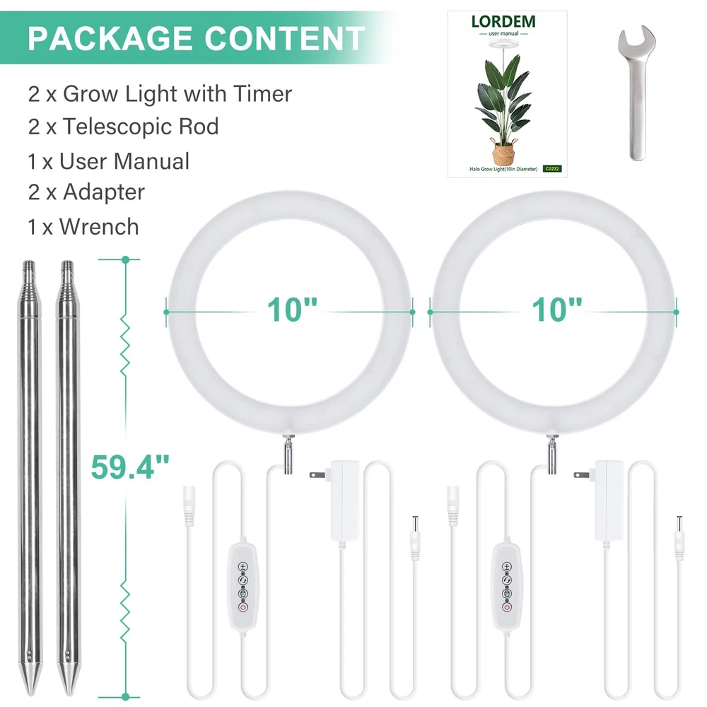 10" Extra Large Size Halo Grow Light: Tailored for larger plants, our 10-inch grow lamp provides the ideal spectrum and intensity to accelerate photosynthesis and plant growth, ensuring your plants flourish year-round. With the super bright 160pcs LEDs, this indoor plant light replicates a full spectrum akin to natural sunlight, promoting robust plant growth. Sunlight Design with 3 Spectrum Modes: This grow light expertly emulates natural sunlight, delivering a full spectrum of light (380nm-800nm) for your plants in all growth stages. It offers three optional color light modes: 5500K (All LEDs On), 5000K (Warm White and Cool White LEDs On), and 2500K (Red and Blue LEDs On). These three spectrum options allow you to customize the lighting to suit your plant's growth stage. You could maximize plants' potential from seedlings to maturity. Auto On/Off Timer and 10 Dimming Levels: Take control of your plants' lighting needs with easy-to-set timed dimming functions. Select from 4, 8, or 12-hour cycles, and the light will automatically turn on/off at your pre-set times. With 10 adjustable brightness levels(10% to a powerful 100%), you have precise control over the lighting intensity. Height Adjustable Plant Lamp: Cater to tall large plants with ease! Our Plant Light offers a maximum height reach of 61 inches, ensuring that even the tallest plants receive the ideal amount of light for their growth. The sturdy pole provides flexibility in adjusting the height. Just push it up or down – a perfect choice for your indoor potted tall plants! Effortless Installation & 106" Long Cabel: Enjoy a hassle-free setup with a generous 106-inch long power cord. Fix the light panel to the pole, and you're ready to nurture your plants. The extended power cord adds convenience, allowing you to place your Plant Grow Light exactly where needed. If you have any questions, please feel free to get in touch with us, we sincerely provide you with the most concerned services and answers to questions.