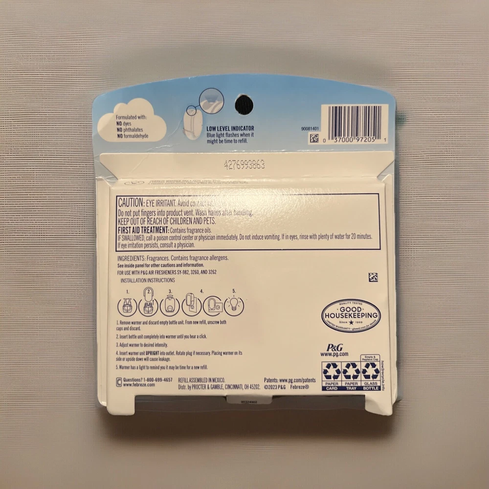 The product is a lot of two Febreze Plug scented oil refills & plug air freshener oil warmer with indicator light. Each refill includes two scented oil cartridges with both Crisp Clean & Shower Fresh scents, with a total item weight of 12 oz. The product belongs to the Febreze Heavy Duty product line and is designed to provide a long-lasting and refreshing fragrance for your home. The plug-in design allows for easy and convenient use in any room.