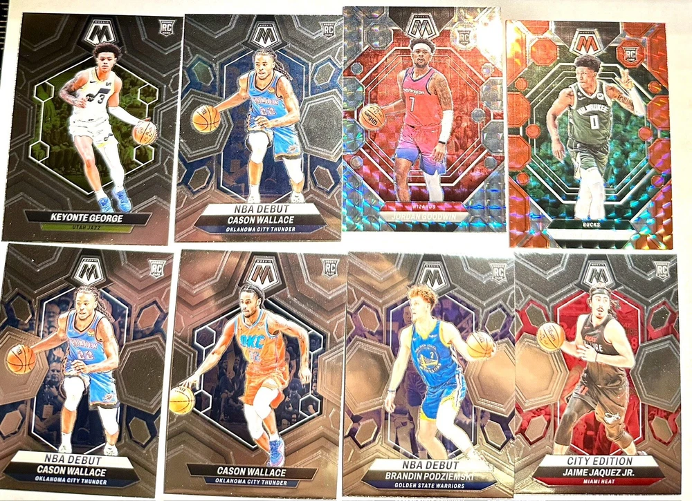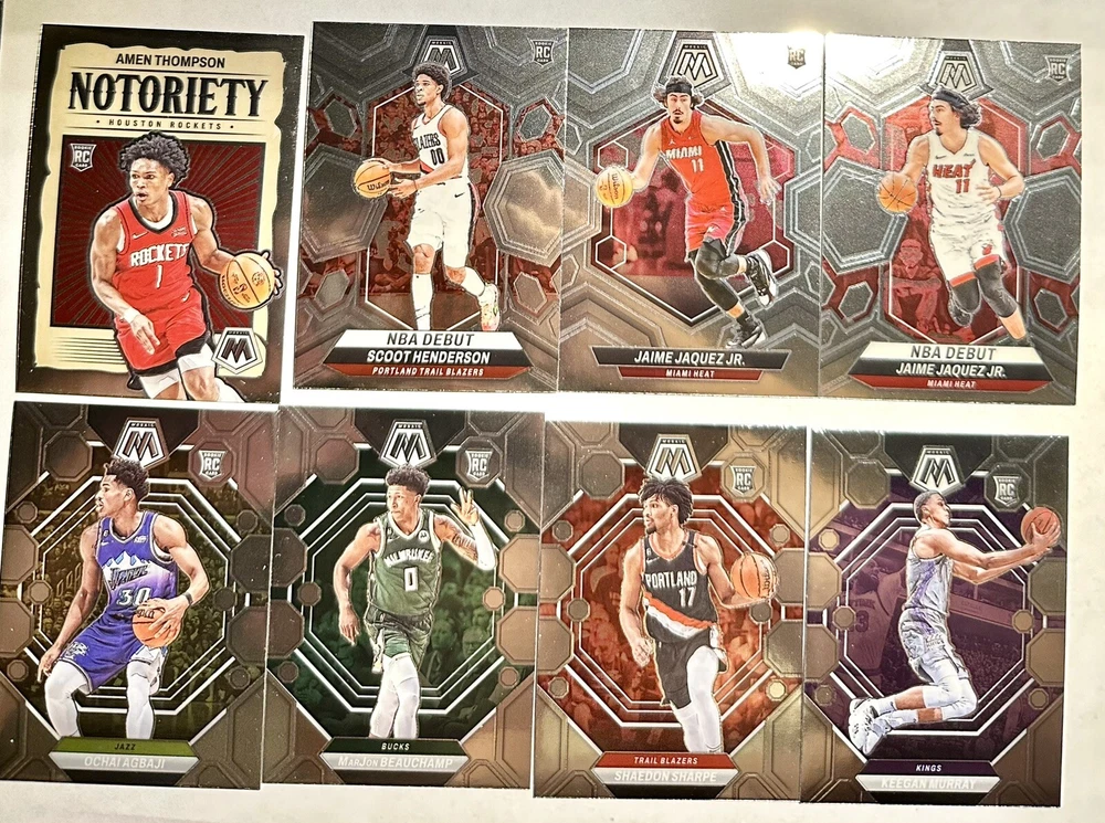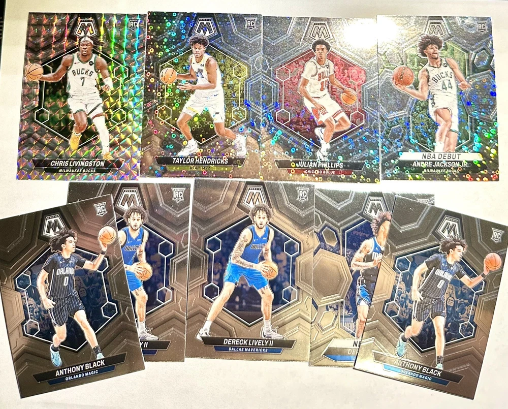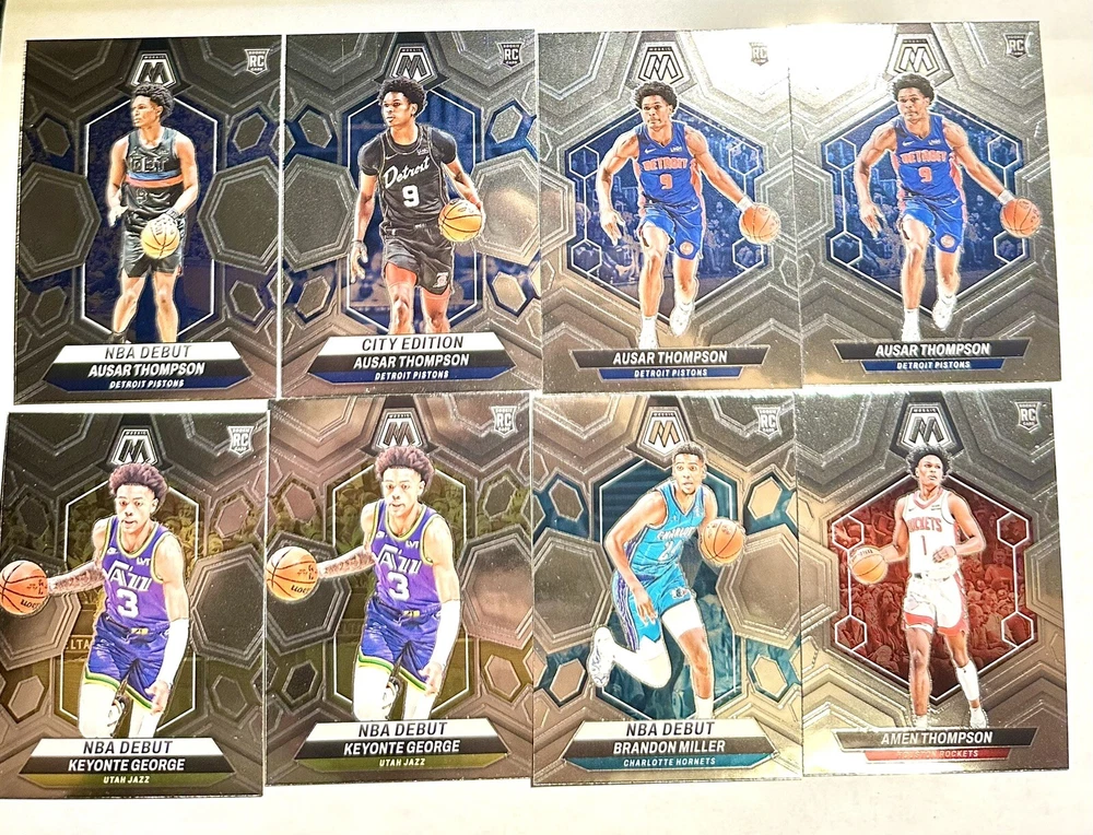 This lot includes 33 sports trading cards featuring rookie players from the National Basketball Association (NBA) for the 2023-24 season. The cards are from the MOSAIC series and are perfect for collectors and fans of basketball. Each card has its own unique design and features the player's name, team, and stats. This lot is a great addition to any collection or a perfect gift for a basketball fan.
