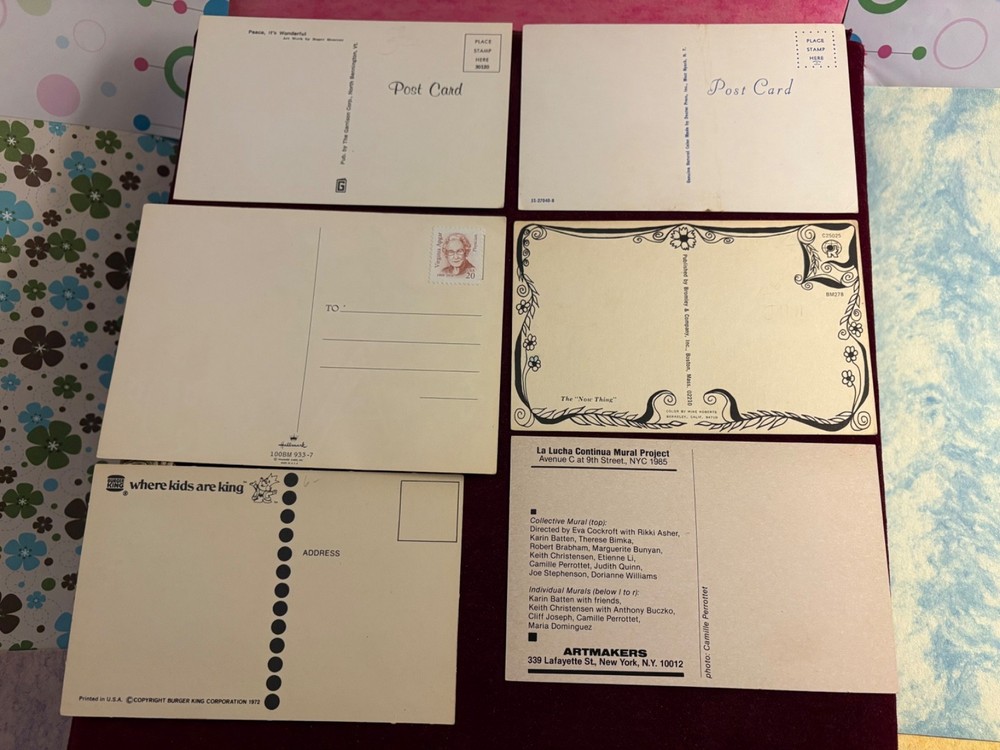Exciting, Colorful, Striking, Playful and Socially-Historic LOT of Six (6) Different Vintage 1960s Beat Hippie Counterculture “Flower Power” Psychedelic Era Satirical, Advertising, Decorative and Comic Postcards. The postcards feature several design elements of the era—Art Nouveau Revival graphics and typography, cartoony satiric comic style (including Burger King Logo promotion), photo documentation of movements and culture—all capturing the “Haight Ashbury” and the other Hippie Era Counterculture and Political vibe. SEE SCANNED IMAGES and Details Listed Above. Sorry, NO International Buyers or Returns. $7.99 s/h includes US Ground Advantage Postage, Bubble Envelope, Careful Packing, Insurance and Tracking #. NOTE: US Postal Rates have increased dramatically. NOTE: Will combine s/h for multiple wins.