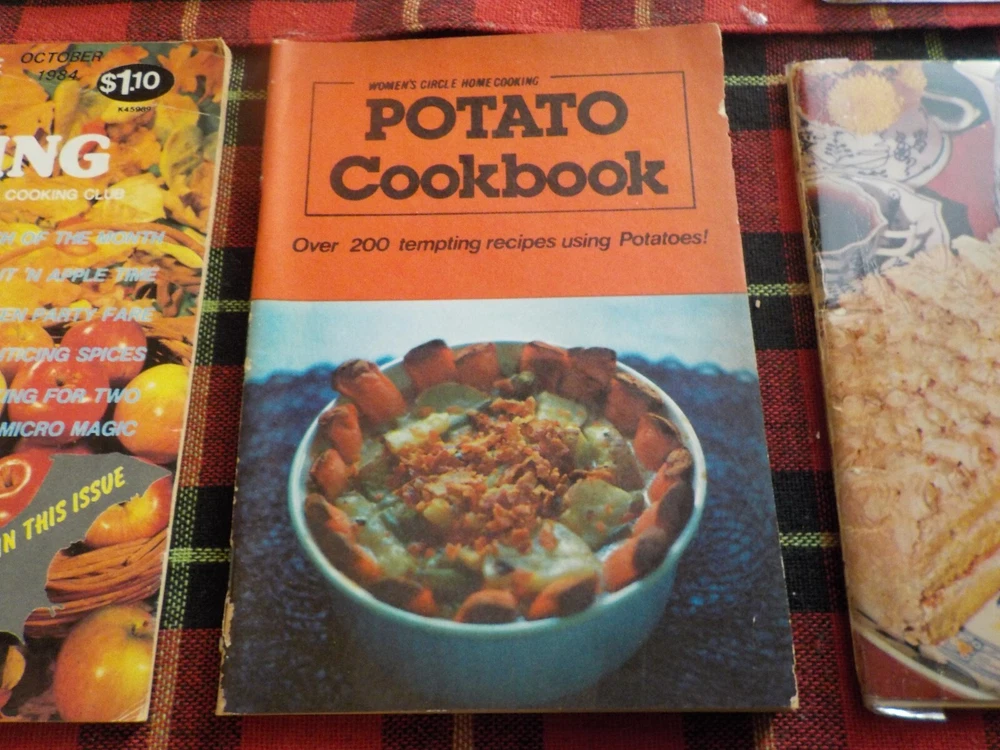 Lot of 6 vintage 1970s pamphlet cookbooks from Women's Circle featuring recipes for potatoes and cakes. The books focus on bakery and baking themes and were originally created in the United States.