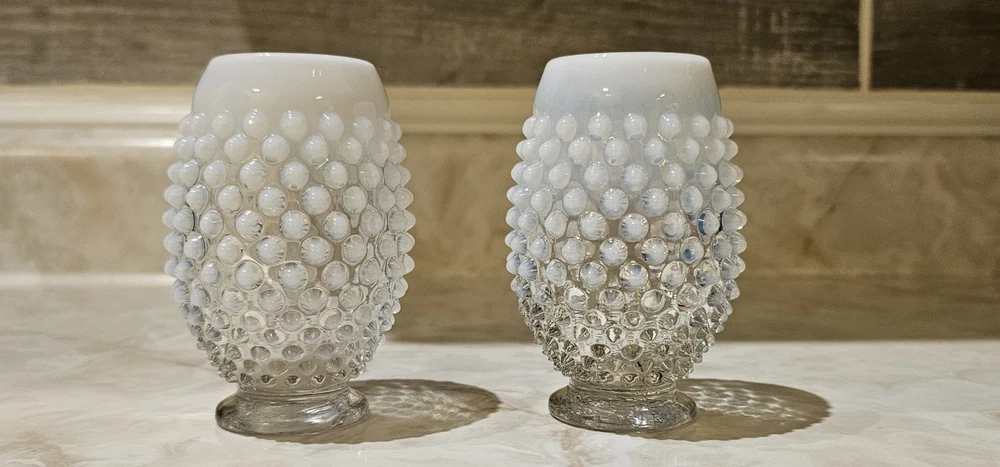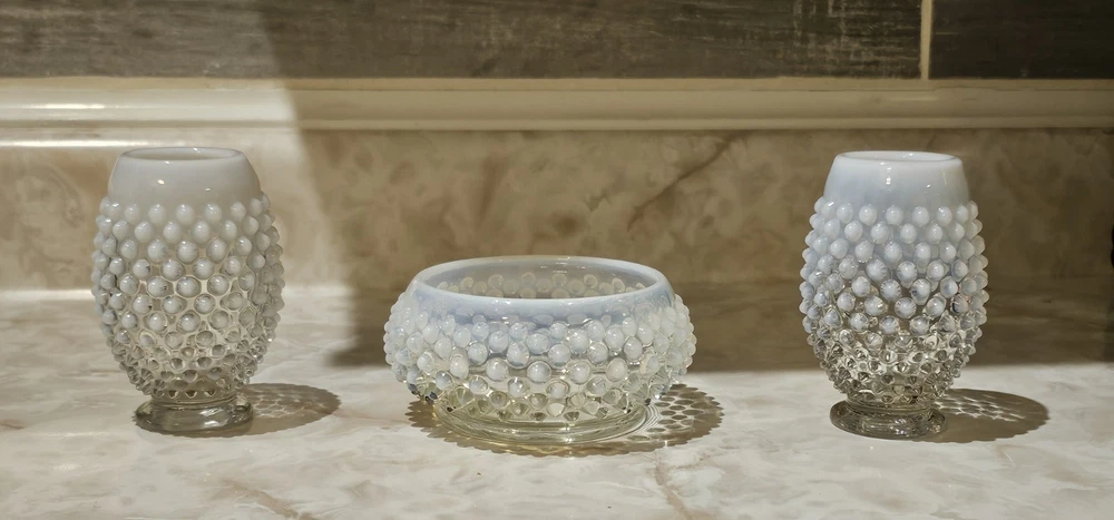 Here are 2 Fenton French Opalescent Hobnail Mini vases and 1 Fenton Opalescent Dish. All are crafted from luxurious opalescent glass. From the 1940s, they have a classic elegance with the intricate hobnail (bumps) design. The crisp white hue and light blue provide a versatile match to any decor. They look like they glow, especiallyunderuv or blacklights. All 3 glass pieces are in perfect condition. That's how they'll arrive. No chips, cracks or scratches. Functional or for display, they match 2 other Perfume Bottles I recently posted. Please see pictures for details and condition. Items will be packaged with care and shipped within 1 day after receiving payment. Thanks for stopping by and looking!