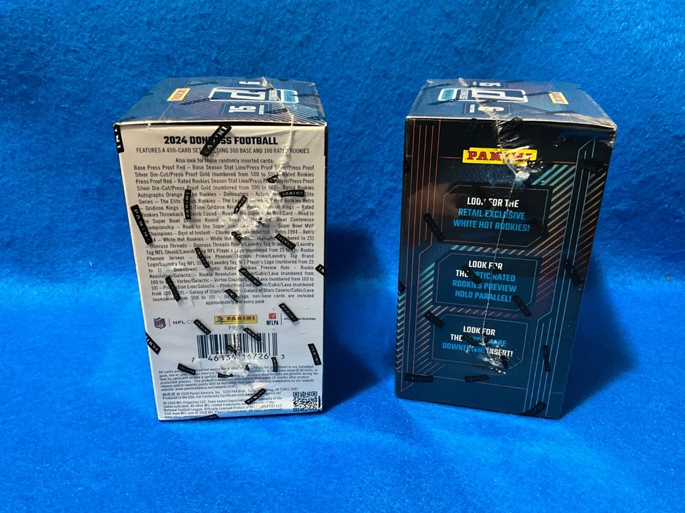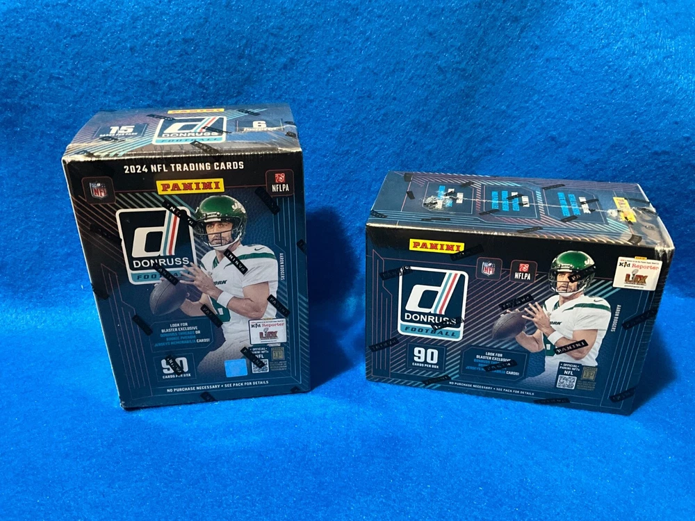 The product is a lot of two 2024 Panini Donruss Football factory sealed blaster boxes, each containing 90 trading cards. The cards are in English and authenticated by Donruss. These boxes are part of the NFL league and feature standard card size. Manufactured by Panini in the United States, this set is intended for football fans and collectors looking to add to their sports trading card collection. Shipping is free for this item. In hand - Free Shipping - Ships out same day.