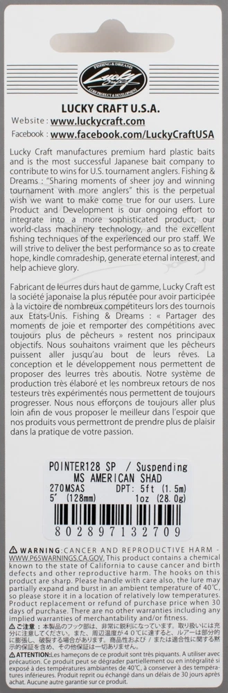 (LOT OF 2) LUCKY CRAFT POINTER 128SP 1OZ PT128SP-270 MS AMERICAN SHAD L8349 (LOT OF 2) LUCKY CRAFT POINTER 128SP 1OZ PT128SP-270 MS AMERICAN SHAD L8349 The original Pointer Series has a lively, powerful action with a side-to-side slide. The Pointer 128 is the largest of the pointer series and its rolling action is the best of the Pointer series. It silently enters the target and attacks unwary bass. This product is the one miracle bait for bass, trout, musky, and every species of fish. Length: 5" (128mm) Weight: 1.0oz (28.0g) Depth: 5ft Type: Suspending Many baits designed in US and all Lures made in Japan High Quality Lures with unusual color offerings Used by Pro Fisherman like Skeet Reese A staple in any fisherman’s tacklebox Lucky Craft Lures – Since 1992 On their packaging, Lucky Craft has a tag line that says the company is all about “Fishing and Dreams.” No one has exhibited that more than Skeet Reese, who recently nailed his second Elite Series win of the year at Guntersville. Lucky Craft evolved in 1992 out of a Japanese manufacturing company that specialized in popular toy robots. They first got into the lure business as the Japanese manufacturer for Daiwa lures, and when Daiwa took their business to Indonesia, starting with the Japanese market. In many ways, they paved the way for other Japanese lure companies to enter the US market, by creating a reputation for high-quality baits with unusual color offerings. The Japan-only lineup features many of the lures that American fishermen will recognize from their tackle box, along with some strange creatures from fan-tailed goldfish to giant bugs. PAYMENT TERMS VISA, MASTERCARD, AMEX, OR DISCOVER PAYPAL APPLE PAY GOOGLE PAY PAYMENTS MUST BE MADE IN FULL WITHIN 7 DAYS SHIPPING TERMS ALL PAID ORDERS SHIP WITHIN 1 BUSINESS DAY INSURANCE IS INCLUDED IN SHIPPING PRICE COMBINED ORDER POLICY ORDERS ARE COMBINED NIGHTLY AFTER END OF ALL AUCTIONS. DO NOT PAY FOR INDIVIDUAL ITEMS ENDING ON THE SAME DATE IF YOU WANT THE ORDER COMBINED. ALLOW US TIME TO SEND YOU A COMBINED INVOICE. ORDERS THAT ARE PAID FOR ON DIFFERENT DATES ARE NOT OUR RESPONSIBILITY TO COMBINE. ITEMS MUST BE PAID IN FULL WITHIN 7 DAYS FROM THE END OF 1ST AUCTION. COMBINED ORDER PRICING BAITS - EACH ADDITIONAL AUCTION $1.00 REELS - EACH ADDITIONAL AUCTION $1.00 RODS* - EACH ADDITIONAL AUCTION $1.00 *ALL RODS WILL ONLY COMBINE WITH RODS OPERATING HOURS BUSINESS HOURS ARE MONDAY - THURSDAY 9AM-5PM CENTRAL TIME & FRIDAY 9AM-3PM CENTRAL TIME, EXCLUDING HOLIDAYS EBAY MESSAGES ARE ANSWERED DURING NORMAL BUSINESS HOURS DUE TO THE OVERWHELMING AMOUNT OF ONLINE ORDERS WE ARE EXPERIENCING, LONGER THAN NORMAL RESPONSE TIME TO EMAILS MAY OCCUR. PLEASE BE PATIENT.