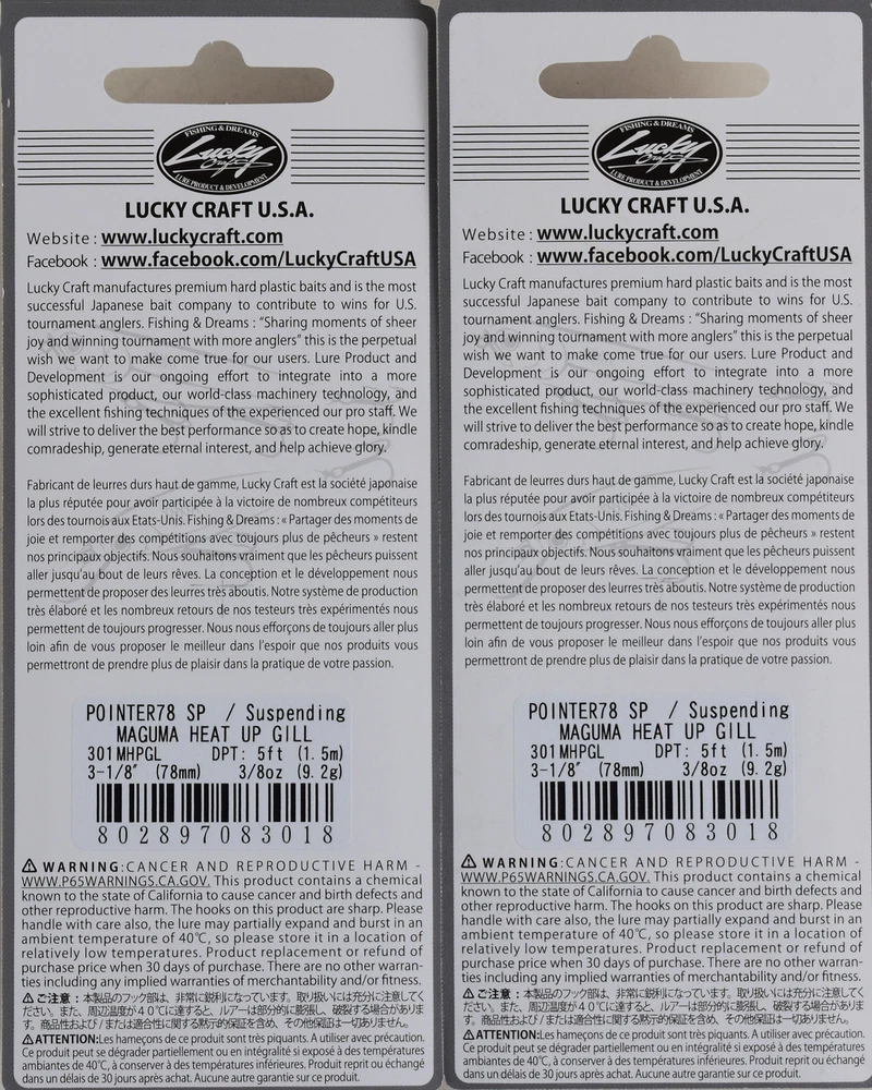 (LOT OF 2) LUCKY CRAFT POINTER 78SP 3/8OZ PT78SP-301 MAGMA HEAT UP GILL H2361 (LOT OF 2) LUCKY CRAFT POINTER 78SP 3/8OZ PT78SP-301 MAGMA HEAT UP GILL H2361 The POINTER has been designed with a very low center of gravity through the use of special brass weights. The low center of balance causes the lure to wobble and vibrate whenever the retrieving motion is stopped. The POINTER will suspend 4 -5 feet deep and will emit an intriguing bass-calling vibration, while in the suspended state. A short twitch of the fishing rod will generate the "Walk the Dog" action under the water. Length: 3 1/8" (78mm) Weight: 3/8oz.(9.2g) Depth: 5ft Type: Suspending PAYMENT TERMS VISA, MASTERCARD, AMEX, OR DISCOVER PAYPAL APPLE PAY GOOGLE PAY PAYMENTS MUST BE MADE IN FULL WITHIN 7 DAYS SHIPPING TERMS ALL PAID ORDERS SHIP WITHIN 1 BUSINESS DAY INSURANCE IS INCLUDED IN SHIPPING PRICE COMBINED ORDER POLICY ORDERS ARE COMBINED NIGHTLY AFTER END OF ALL AUCTIONS. DO NOT PAY FOR INDIVIDUAL ITEMS ENDING ON THE SAME DATE IF YOU WANT THE ORDER COMBINED. ALLOW US TIME TO SEND YOU A COMBINED INVOICE. ORDERS THAT ARE PAID FOR ON DIFFERENT DATES ARE NOT OUR RESPONSIBILITY TO COMBINE. ITEMS MUST BE PAID IN FULL WITHIN 7 DAYS FROM THE END OF 1ST AUCTION. COMBINED ORDER PRICING BAITS - EACH ADDITIONAL AUCTION $1.00 REELS - EACH ADDITIONAL AUCTION $1.00 RODS* - EACH ADDITIONAL AUCTION $1.00 *ALL RODS WILL ONLY COMBINE WITH RODS OPERATING HOURS BUSINESS HOURS ARE MONDAY - THURSDAY 9AM-5PM CENTRAL TIME & FRIDAY 9AM-3PM CENTRAL TIME, EXCLUDING HOLIDAYS EBAY MESSAGES ARE ANSWERED DURING NORMAL BUSINESS HOURS DUE TO THE OVERWHELMING AMOUNT OF ONLINE ORDERS WE ARE EXPERIENCING, LONGER THAN NORMAL RESPONSE TIME TO EMAILS MAY OCCUR. PLEASE BE PATIENT.