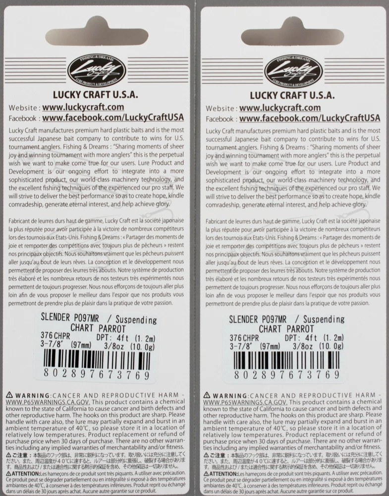 (LOT OF 2) LUCKY CRAFT SLENDER POINTER 97MR 3/8OZ PO97MR-376 CHART PARROT B6139 (LOT OF 2) LUCKY CRAFT SLENDER POINTER 97MR 3/8OZ PO97MR-376 CHART PARROT B6139 Lucky Craft's new Slender Pointer represents Lucky Crafts' continued dedication to listening to the needs of our customers. Smallmouth fishermen around the country have been requesting a more slender version of our Original Pointer Minnow. With the new Slender Pointer Lucky Craft has answered their requests. The new Slender Pointer from Lucky Craft is available in three great fish-catching sizes, the Slender Pointer 97, Slender Pointer 112 and the Slender Pointer 127. Smallmouth Bass are known to slash at a jerk bait, so to increase the hooking ratio, these baits feature three razor-sharp Diaiichi treble hooks. This means wherever a fish hits this bait, it will get hooked. These three new baits feature Lucky Crafts patented weight transfer system, so even in the wind, they cast like a bullet. Like all of Lucky Crafts suspending jerk baits, the new Slender Pointers will suspend perfectly horizontal in the water and will stay there no matter how long you pause them. The action of these new baits has also been changed to appeal more to the smallmouth fisherman. These new baits feature a more erratic side-to-side action that will drive fish wild. Both sizes of the new Slender Pointer will run 3-4 feet deep and are available in a rainbow of color options to match any fishing condition. This is just another example of Lucky Crafts' continuing mission to produce the most technologically advanced fishing lures on the market. Length: 3 7/8" (97mm) Weight: 3/8oz (10.0g) Class: Suspending Depth: 4ft Hooks: #6 Color: Chartreuse Parrot Many baits designed in the US and all Lures made in Japan High Quality Lures with unusual color offerings Used by Pro Fisherman like Skeet Reese A staple in any fisherman’s tacklebox Lucky Craft Lures – Since 1992 On their packaging, Lucky Craft has a tag line that says the company is all about “Fishing and Dreams.” No one has exhibited that more than Skeet Reese, who recently nailed his second Elite Series win of the year at Guntersville. Lucky Craft evolved in 1992 out of a Japanese manufacturing company that specialized in popular toy robots. They first got into the lure business as the Japanese manufacturer for Daiwa lures, and when Daiwa took their business to Indonesia, starting with the Japanese market. In many ways, they paved the way for other Japanese lure companies to enter the US market, by creating a reputation for high-quality baits with unusual color offerings. The Japan-only lineup features many of the lures that American fishermen will recognize from their tackle box, along with some strange creatures from fan-tailed goldfish to giant bugs. PAYMENT TERMS VISA, MASTERCARD, AMEX, OR DISCOVER PAYPAL APPLE PAY GOOGLE PAY PAYMENTS MUST BE MADE IN FULL WITHIN 7 DAYS SHIPPING TERMS ALL PAID ORDERS SHIP WITHIN 1 BUSINESS DAY INSURANCE IS INCLUDED IN SHIPPING PRICE COMBINED ORDER POLICY ORDERS ARE COMBINED NIGHTLY AFTER END OF ALL AUCTIONS. DO NOT PAY FOR INDIVIDUAL ITEMS ENDING ON THE SAME DATE IF YOU WANT THE ORDER COMBINED. ALLOW US TIME TO SEND YOU A COMBINED INVOICE. ORDERS THAT ARE PAID FOR ON DIFFERENT DATES ARE NOT OUR RESPONSIBILITY TO COMBINE. ITEMS MUST BE PAID IN FULL WITHIN 7 DAYS FROM THE END OF 1ST AUCTION. COMBINED ORDER PRICING BAITS - EACH ADDITIONAL AUCTION $1.00 REELS - EACH ADDITIONAL AUCTION $1.00 RODS* - EACH ADDITIONAL AUCTION $1.00 *ALL RODS WILL ONLY COMBINE WITH RODS OPERATING HOURS BUSINESS HOURS ARE MONDAY - THURSDAY 9AM-5PM CENTRAL TIME & FRIDAY 9AM-3PM CENTRAL TIME, EXCLUDING HOLIDAYS EBAY MESSAGES ARE ANSWERED DURING NORMAL BUSINESS HOURS DUE TO THE OVERWHELMING AMOUNT OF ONLINE ORDERS WE ARE EXPERIENCING, LONGER THAN NORMAL RESPONSE TIME TO EMAILS MAY OCCUR. PLEASE BE PATIENT.