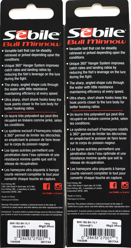 (LOT OF 2) SEBILE BULL MINNOW BMI-152-SK-YLY 2-3/8OZ 1443249 YELLY DM1116 (LOT OF 2) SEBILE BULL MINNOW BMI-152-SK-YLY 2-3/8OZ 1443249 YELLY DM1116 Description The Sebile Bull Minnow is a wide action bait that is ideal for power fishing (Retrieving/jerking/pulling) situations when fish are active. The Bull Minnow is designed to be versatile. As a power jerkbait, the Bull Minnow is designed to handle aggressive fishing by anglers. The Bull Minnow can be retrieved at high speeds while remaining stable and tracking true! Features Versatile bait that can be steadily retrieved or jerked depending upon the conditions The sharp, angled shape cuts through the water with little resistance maintaining efficiency at every speed Designed with a 360-degree rotating belly hook preventing fish from gaining leverage and throwing bait Constant action is ideal for cast and retrieves techniques Tail weighted design casting distance Rocket version geared to make super long casts and includes extra single hooks LENGTH: 6" WEIGHT: 2-3/8 OZ HOOK SIZE: 3/0 SWIMMING DEPTH: 2.5'-5'' PAYMENT TERMS VISA, MASTERCARD, AMEX, OR DISCOVER PAYPAL APPLE PAY GOOGLE PAY PAYMENTS MUST BE MADE IN FULL WITHIN 7 DAYS SHIPPING TERMS ALL PAID ORDERS SHIP WITHIN 1 BUSINESS DAY INSURANCE IS INCLUDED IN SHIPPING PRICE COMBINED ORDER POLICY ORDERS ARE COMBINED NIGHTLY AFTER END OF ALL AUCTIONS. DO NOT PAY FOR INDIVIDUAL ITEMS ENDING ON THE SAME DATE IF YOU WANT THE ORDER COMBINED. ALLOW US TIME TO SEND YOU A COMBINED INVOICE. ORDERS THAT ARE PAID FOR ON DIFFERENT DATES ARE NOT OUR RESPONSIBILITY TO COMBINE. ITEMS MUST BE PAID IN FULL WITHIN 7 DAYS FROM THE END OF 1ST AUCTION. COMBINED ORDER PRICING BAITS - EACH ADDITIONAL AUCTION $1.00 REELS - EACH ADDITIONAL AUCTION $1.00 RODS* - EACH ADDITIONAL AUCTION $1.00 *ALL RODS WILL ONLY COMBINE WITH RODS OPERATING HOURS BUSINESS HOURS ARE MONDAY - THURSDAY 9AM-5PM CENTRAL TIME & FRIDAY 9AM-3PM CENTRAL TIME, EXCLUDING HOLIDAYS EBAY MESSAGES ARE ANSWERED DURING NORMAL BUSINESS HOURS DUE TO THE OVERWHELMING AMOUNT OF ONLINE ORDERS WE ARE EXPERIENCING, LONGER THAN NORMAL RESPONSE TIME TO EMAILS MAY OCCUR. PLEASE BE PATIENT.
