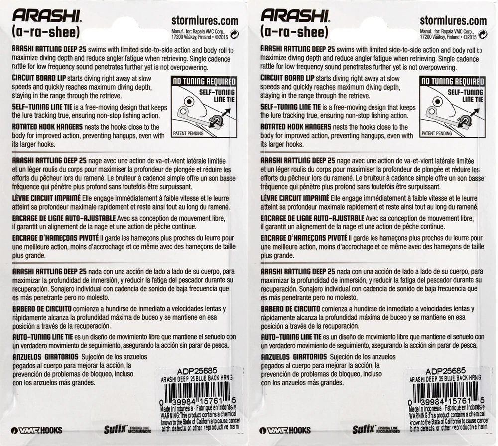(LOT OF 2) STORM ARASHI RATTLING DEEP 25 ADP25685 1-3/8OZ BLUE BACK HER K3488 (LOT OF 2) STORM ARASHI RATTLING DEEP 25 ADP25685 1-3/8OZ BLUE BACK HER K3488 Packed with features formerly only found in expensive, custom lures, the Arashi® Rattling Deep swims with a moderate rolling action for the right amount of search with loads of tail kick. Large single knocker rattle delivers low-frequency pitch and a long-cast design for increased distance with accuracy. LENGTH : 2-3/8 " WEIGHT : 1-3/8OZ HOOK SIZE : 1/0 SINGLE BALL RATTLE SYSTEM features a knocking cadence and low-frequency pitch that fish can perceive at greater distances and easily track to the source ROTATED HOOK HANGERS nests the hooks close to the body for improved action, preventing hang-ups and allowing larger hooks ( Patent Pending ) PATENTED SELF-TUNING LINE TIE is a free-moving design that keeps the lure tracking true, ensuring non-stop fishing action CIRCUIT BOARD LIP starts right away at slow speeds and quickly reaches maximum diving depth. Extremely thin with superior strength and durability Premium Black Nickel VMC® Hooks COLOR: BLUE BACK HERRING PAYMENT TERMS VISA, MASTERCARD, AMEX, OR DISCOVER PAYPAL APPLE PAY GOOGLE PAY PAYMENTS MUST BE MADE IN FULL WITHIN 7 DAYS SHIPPING TERMS ALL PAID ORDERS SHIP WITHIN 1 BUSINESS DAY INSURANCE IS INCLUDED IN SHIPPING PRICE COMBINED ORDER POLICY ORDERS ARE COMBINED NIGHTLY AFTER END OF ALL AUCTIONS. DO NOT PAY FOR INDIVIDUAL ITEMS ENDING ON THE SAME DATE IF YOU WANT THE ORDER COMBINED. ALLOW US TIME TO SEND YOU A COMBINED INVOICE. ORDERS THAT ARE PAID FOR ON DIFFERENT DATES ARE NOT OUR RESPONSIBILITY TO COMBINE. ITEMS MUST BE PAID IN FULL WITHIN 7 DAYS FROM THE END OF 1ST AUCTION. COMBINED ORDER PRICING BAITS - EACH ADDITIONAL AUCTION $1.00 REELS - EACH ADDITIONAL AUCTION $1.00 RODS* - EACH ADDITIONAL AUCTION $1.00 *ALL RODS WILL ONLY COMBINE WITH RODS OPERATING HOURS BUSINESS HOURS ARE MONDAY - THURSDAY 9AM-5PM CENTRAL TIME & FRIDAY 9AM-3PM CENTRAL TIME, EXCLUDING HOLIDAYS EBAY MESSAGES ARE ANSWERED DURING NORMAL BUSINESS HOURS DUE TO THE OVERWHELMING AMOUNT OF ONLINE ORDERS WE ARE EXPERIENCING, LONGER THAN NORMAL RESPONSE TIME TO EMAILS MAY OCCUR. PLEASE BE PATIENT.