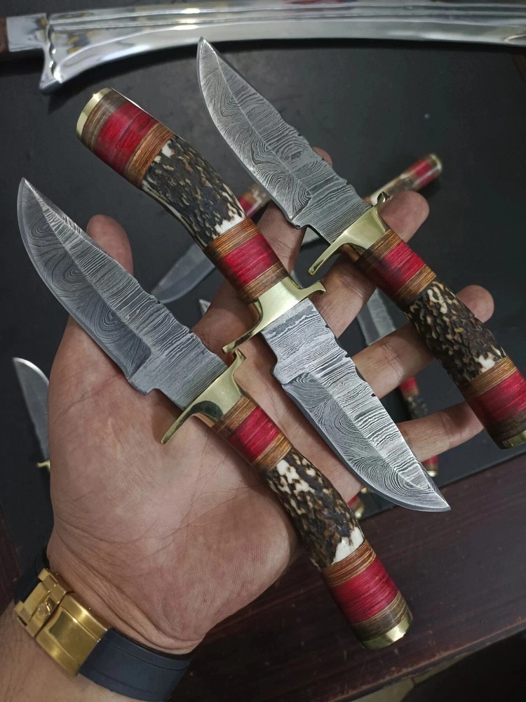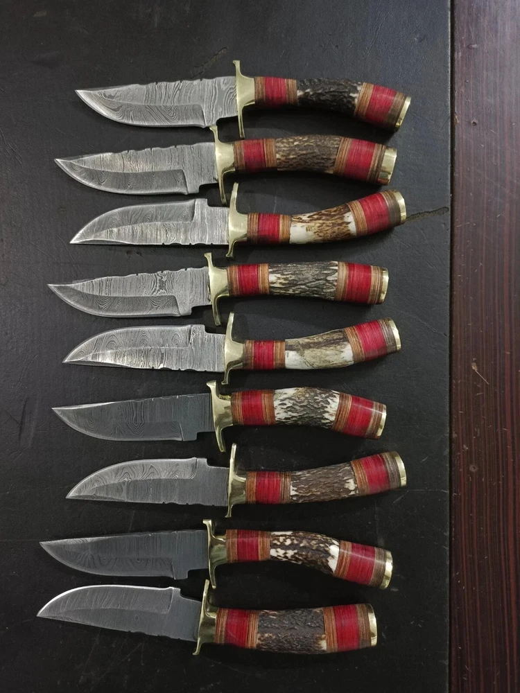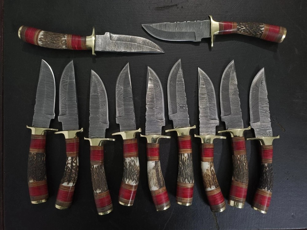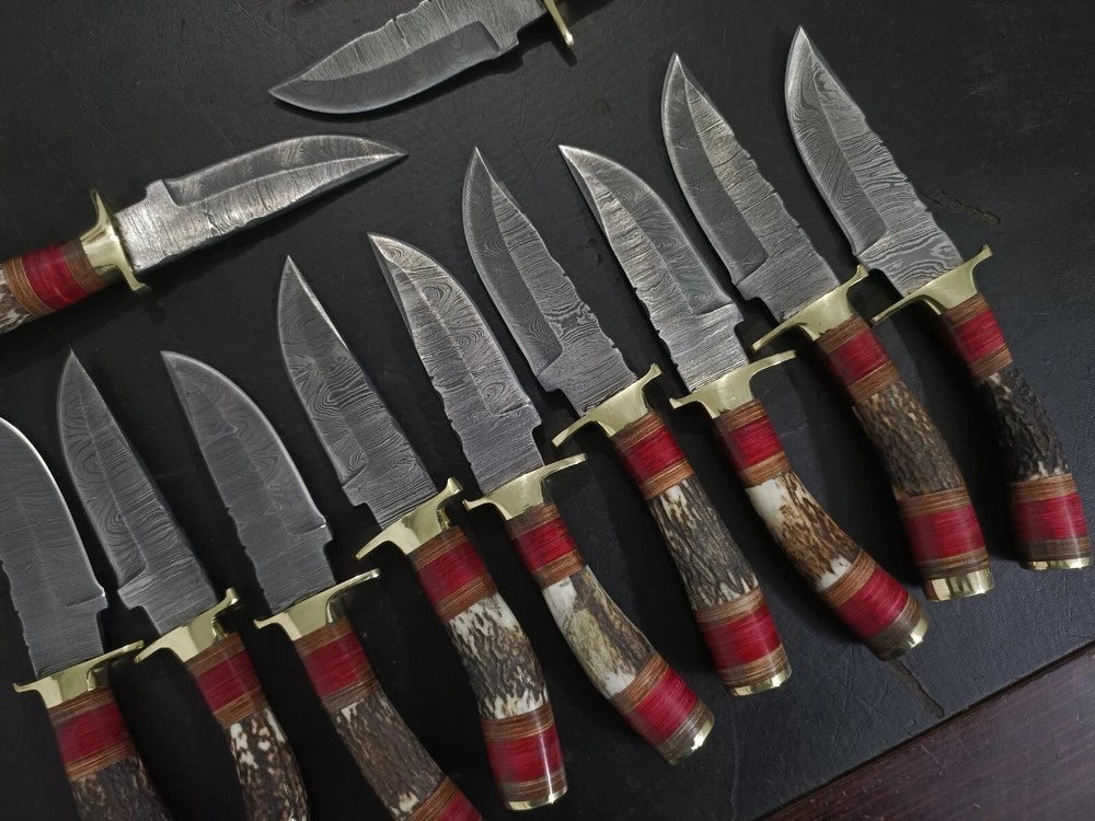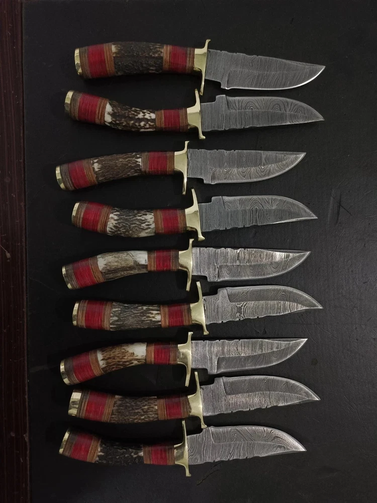MARVELLOUS LOT OF "20" CUSTOM HANDMADE FORGED DAMASCUS STEEL TWISTED PATTER SHARPENED EDGE FULL TANG BLADE EDC CAMPING HUNTING CAMPING SKINNER KNIVES IN STAG HORN , MIX SHEET WOOD & BRASS HAND GUARD HANDLE. MEASUREMENT: OVERALL LENGHT: 8.00 INCHES (APPROX.) BLADE LENGTH: 4.00 INCHES (APPROX.) HANDLE LENGHT: 4.00 INCHES (APPROX.) FEATURES: Sharp Edge Easy to Carry Smooth Grip And Long Lasting Useable Knife For Hunting and Outdoors Man. HAND FORGED DAMASCUS BLADES: Damascus blades are hand forged through a process of layering, melting and hammering. This results in each blade having a unique design or as some would say a "fingerprint". Each & every knife is truly one of a kind. Damascus steel has outstanding properties of strength and hardness. We amplify its properties by oil quenching it at 2100 deg F to cool it down fast and we do it twice to make sure it's hard to its inner core to withstand any kind of work you may put it to use. It achieves a 58 or higher HRC on the Rockwell Scale. Producing Damascus steel is still unknown to this day, the process has been lost over the past 500 years. Today, we layer & hand forge two different steels 15n20 & 1095. It is then dipped in Ferric Chloride creating a distinct reaction with the metals producing a Damascus like pattern. ✅ 【 PATENTED DESIGN】 Manufactured with ultra-sharp hand forged Damascus steel cutting core at HRC58-60 hardness, this knife comes with unrivaled performance and incredible edge retention. ✅【 HIGH QUALITY HANDMADE KNIFE WITH SHARP, STRONG, AND DURABLE BLADE 】 This knife was hand crafted with the highest attention to detail to create this unique sharp blade with a sturdy handle. This knife is made of high-quality Damascus steel and will not rust with proper care. ✅ 【 PERFECT OUTDOOR CAMPING KNIFE AND HUNTING KNIFE 】 This knife is the perfect camp knife and hunting knife. It’s the best knife for any hunter, camper, survivalist, or outdoor sports enthusiast so that you can enjoy your adventure. ✅ 【 EXCELLENT HANDMADE BUSH CRAFT KNIFE 】 The Perfect bush craft, camp survival knife for all of your most rugged adventures out in the wild. This survival knife will give you an edge so that you can win in the competition against the wild outdoors. ✅ 【 DECORATIVE EDC HUNTING KNIFE FOR COLLECTORS 】 Enrich your collection with this beautifully forged handmade Damascus knife that is sure to impress with its hand forged layers of premium steel and handle. It’s the perfect addition for any true knife collector. ✅ 【 COMFORTABLE AND ERGONOMIC DESIGN FOR EASY GRIP 】 The unique handle is handcrafted for maximum comfort making it the perfect knife for all of your outdoor needs. Full hollow blade is light weight and compliments the handle in maintaining balance and help to reduce stress on your hands after use with comfort while providing you with the perfect blend of performance and comfort. ✅ 【 ULTIMATELY DURABLE HANDLE 】 The meticulously constructed handle has gone through special treatment, making it extremely impervious to heat, moisture, cold with military grade strength and life-long sturdiness; multiple times riveted for extra resilience, ✅ 【 SUPERIOR SHARPNESS 】 Ruthlessly shaving sharp edge is handcrafted by me to a mirror polish at 15-25° per side using the traditional 3-step honing method. ✅ 【 WARRANTY 】 No premium knife is complete without a lifetime warranty; our masterpiece knife is fully covered for life, free exchange or return for life if the item is defective. ✅ 【 SUPERIOR SHARPNESS 】 Ruthlessly shaving sharp edge is handcrafted by me to a mirror polish at 15-25° per side using the traditional 3-step honing method. ✅ 【 WARRANTY 】 No premium knife is complete without a lifetime warranty; our masterpiece knife is fully covered for life, free exchange or return for life if the item is defective. This knife looks great in the sheath or on a belt making it easy to retrieve. It has the perfect sharpness to make your everyday utilitarian tasks an enjoyable experience. Perfect for hunting, fishing, hiking, camping, boating, backpacking, or any other outdoor adventure. It is also a key item to add to your survival tactical gear!