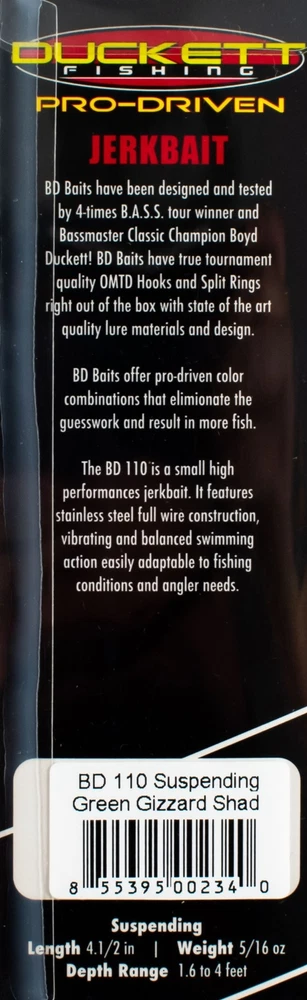 (LOT OF 3) DUCKETT PRO DRIVEN BD 110 JERKBAIT BD110GGS GREEN GIZZARD SHAD L4125 (LOT OF 3) DUCKETT PRO DRIVEN BD 110 JERKBAIT BD110GGS GREEN GIZZARD SHAD L4125 The BD 110 is small high performance jerkbait. It features stainless steel full wire construction, vibrating and balanced swimming action easily adaptable to fishing conditions and angler needs. BD Baits have been designed and tested by 4-time B.A.S.S tour winner and Bassmaster Classic Champ Boyd Duckett! BD Baits have true tourney quality OMTD hooks and split rings right out of the box with state of the art quality lure materials and design. BD Baits offer pro-driven color combinations that eliminate the guesswork and result in more fish! Specs Length: 4.5" Weight: 5/16oz Depth: 1.6'-4' Action: Suspending PAYMENT TERMS VISA, MASTERCARD, AMEX, OR DISCOVER PAYPAL APPLE PAY GOOGLE PAY PAYMENTS MUST BE MADE IN FULL WITHIN 7 DAYS SHIPPING TERMS ALL PAID ORDERS SHIP WITHIN 1 BUSINESS DAY INSURANCE IS INCLUDED IN SHIPPING PRICE COMBINED ORDER POLICY ORDERS ARE COMBINED NIGHTLY AFTER END OF ALL AUCTIONS. DO NOT PAY FOR INDIVIDUAL ITEMS ENDING ON THE SAME DATE IF YOU WANT THE ORDER COMBINED. ALLOW US TIME TO SEND YOU A COMBINED INVOICE. ORDERS THAT ARE PAID FOR ON DIFFERENT DATES ARE NOT OUR RESPONSIBILITY TO COMBINE. ITEMS MUST BE PAID IN FULL WITHIN 7 DAYS FROM THE END OF 1ST AUCTION. COMBINED ORDER PRICING BAITS - EACH ADDITIONAL AUCTION $1.00 REELS - EACH ADDITIONAL AUCTION $1.00 RODS* - EACH ADDITIONAL AUCTION $1.00 *ALL RODS WILL ONLY COMBINE WITH RODS OPERATING HOURS BUSINESS HOURS ARE MONDAY - THURSDAY 9AM-5PM CENTRAL TIME & FRIDAY 9AM-3PM CENTRAL TIME, EXCLUDING HOLIDAYS EBAY MESSAGES ARE ANSWERED DURING NORMAL BUSINESS HOURS DUE TO THE OVERWHELMING AMOUNT OF ONLINE ORDERS WE ARE EXPERIENCING, LONGER THAN NORMAL RESPONSE TIME TO EMAILS MAY OCCUR. PLEASE BE PATIENT.