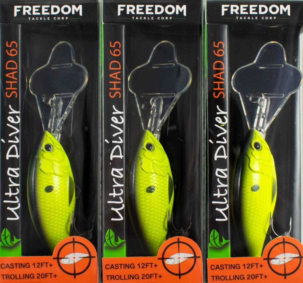 (LOT OF 3) FREEDOM TACKLE ULTRA DIVER SHAD 65 3/8OZ BLCK CHRTREUSE #43112 CO6361 (LOT OF 3) FREEDOM TACKLE ULTRA DIVER SHAD 65 3/8OZ BLCK CHRTREUSE #43112 CO6361 The FT Ultra Diver Minnow is just the bait you need to up your fishing game. The design team at American Baitworks developed the FT Ultra Diver Minnow with a forward-weighted design which ensures the minnow is primed and ready to dive deep as soon as it hits the water. The cloverleaf bill design also creates a radical deflection action that is sure to attract fish. We placed a lot of emphasis on performance and the realistic 3-piece, sonic-welded body design and integrated one-piece bill design add to the appeal of this bait. Plus, the premium VMC black nickel hooks provide even more durability and strength. You'll be cranking in big ones in no time with the Ultra Diver Minnow. Specs/Features Length: 2 1/2" Weight: 3/8oz Weight transfer system Internal rattle system Ultra quick diving Premium paint finishes Premium black nickel hooks PAYMENT TERMS VISA, MASTERCARD, AMEX, OR DISCOVER PAYPAL APPLE PAY GOOGLE PAY PAYMENTS MUST BE MADE IN FULL WITHIN 7 DAYS SHIPPING TERMS ALL PAID ORDERS SHIP WITHIN 1 BUSINESS DAY INSURANCE IS INCLUDED IN SHIPPING PRICE COMBINED ORDER POLICY ORDERS ARE COMBINED NIGHTLY AFTER END OF ALL AUCTIONS. DO NOT PAY FOR INDIVIDUAL ITEMS ENDING ON THE SAME DATE IF YOU WANT THE ORDER COMBINED. ALLOW US TIME TO SEND YOU A COMBINED INVOICE. ORDERS THAT ARE PAID FOR ON DIFFERENT DATES ARE NOT OUR RESPONSIBILITY TO COMBINE. ITEMS MUST BE PAID IN FULL WITHIN 7 DAYS FROM THE END OF 1ST AUCTION. COMBINED ORDER PRICING BAITS - EACH ADDITIONAL AUCTION $1.00 REELS - EACH ADDITIONAL AUCTION $1.00 RODS* - EACH ADDITIONAL AUCTION $1.00 *ALL RODS WILL ONLY COMBINE WITH RODS OPERATING HOURS BUSINESS HOURS ARE MONDAY - THURSDAY 9AM-5PM CENTRAL TIME & FRIDAY 9AM-3PM CENTRAL TIME, EXCLUDING HOLIDAYS EBAY MESSAGES ARE ANSWERED DURING NORMAL BUSINESS HOURS DUE TO THE OVERWHELMING AMOUNT OF ONLINE ORDERS WE ARE EXPERIENCING, LONGER THAN NORMAL RESPONSE TIME TO EMAILS MAY OCCUR. PLEASE BE PATIENT.