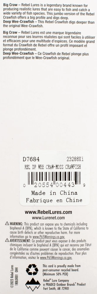 (LOT OF 3) REBEL DEEP WEE CRAW CRANKBAIT 3/8OZ D7684 MOSS CRAWFISH I3455 (LOT OF 3) REBEL DEEP WEE CRAW CRANKBAIT 3/8OZ D7684 MOSS CRAWFISH I3455 The Rebel Deep Wee Crawfish Lure Deep Diving Crankbait is a 2 3/8 inch medium to deep diving crawfish imitating crankbait. This is one of the most popular crawfish imitating fishing lures in the world. It is designed to catch all sizes of game fish - especially bass, walleye, trout, and panfish. The distinct pulsating action is irresistible and extremely effective in rivers and streams. It can be both cast and trolled and displays true-running stability with either technique. It meets the demand for medium to deep-runners and dives between 8 and 10 feet. Features <> The Rebel Deep Wee Crawfish is a 2 3/8 inch medium diving crawfish imitating crankbait. Effective multi-species freshwater lure. The original realistic crawfish crankbait. Effective cast or trolled for big walleyes. PAYMENT TERMS VISA, MASTERCARD, AMEX, OR DISCOVER PAYPAL APPLE PAY GOOGLE PAY PAYMENTS MUST BE MADE IN FULL WITHIN 7 DAYS SHIPPING TERMS ALL PAID ORDERS SHIP WITHIN 1 BUSINESS DAY INSURANCE IS INCLUDED IN SHIPPING PRICE COMBINED ORDER POLICY ORDERS ARE COMBINED NIGHTLY AFTER END OF ALL AUCTIONS. DO NOT PAY FOR INDIVIDUAL ITEMS ENDING ON THE SAME DATE IF YOU WANT THE ORDER COMBINED. ALLOW US TIME TO SEND YOU A COMBINED INVOICE. ORDERS THAT ARE PAID FOR ON DIFFERENT DATES ARE NOT OUR RESPONSIBILITY TO COMBINE. ITEMS MUST BE PAID IN FULL WITHIN 7 DAYS FROM THE END OF 1ST AUCTION. COMBINED ORDER PRICING BAITS - EACH ADDITIONAL AUCTION $1.00 REELS - EACH ADDITIONAL AUCTION $1.00 RODS* - EACH ADDITIONAL AUCTION $1.00 *ALL RODS WILL ONLY COMBINE WITH RODS OPERATING HOURS BUSINESS HOURS ARE MONDAY - THURSDAY 9AM-5PM CENTRAL TIME & FRIDAY 9AM-3PM CENTRAL TIME, EXCLUDING HOLIDAYS EBAY MESSAGES ARE ANSWERED DURING NORMAL BUSINESS HOURS DUE TO THE OVERWHELMING AMOUNT OF ONLINE ORDERS WE ARE EXPERIENCING, LONGER THAN NORMAL RESPONSE TIME TO EMAILS MAY OCCUR. PLEASE BE PATIENT.