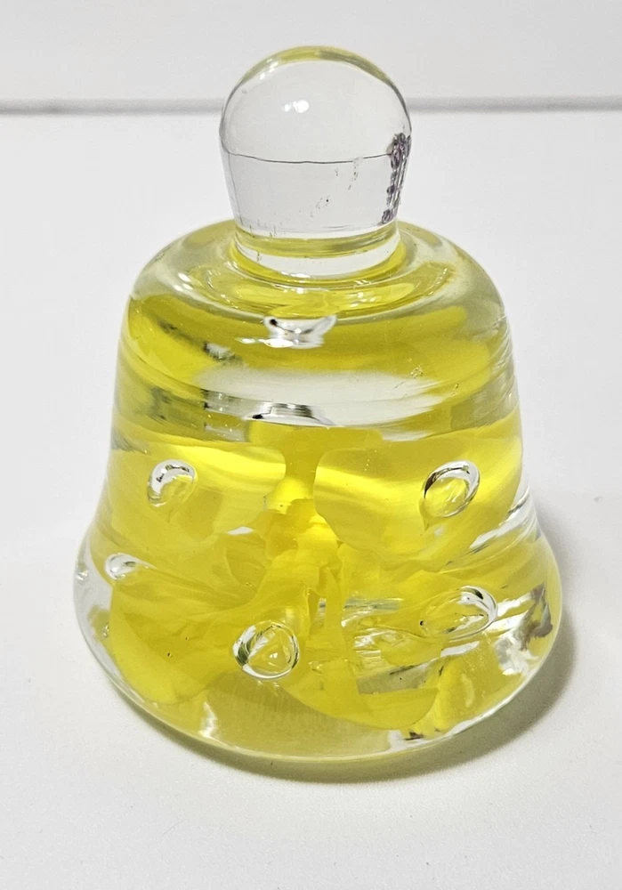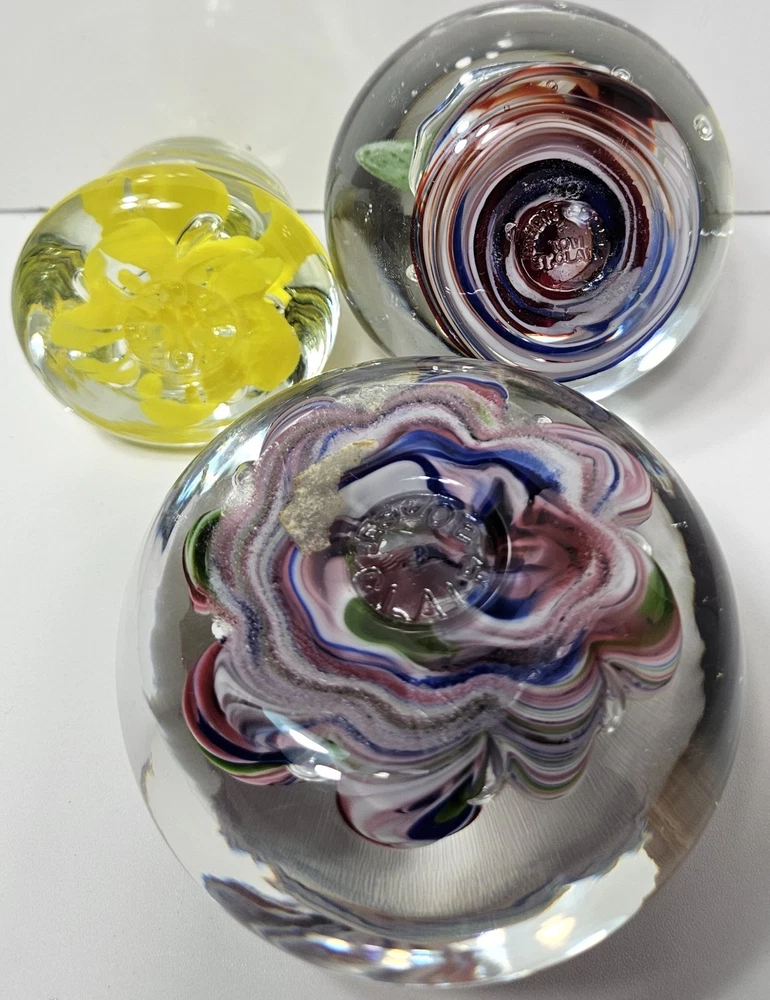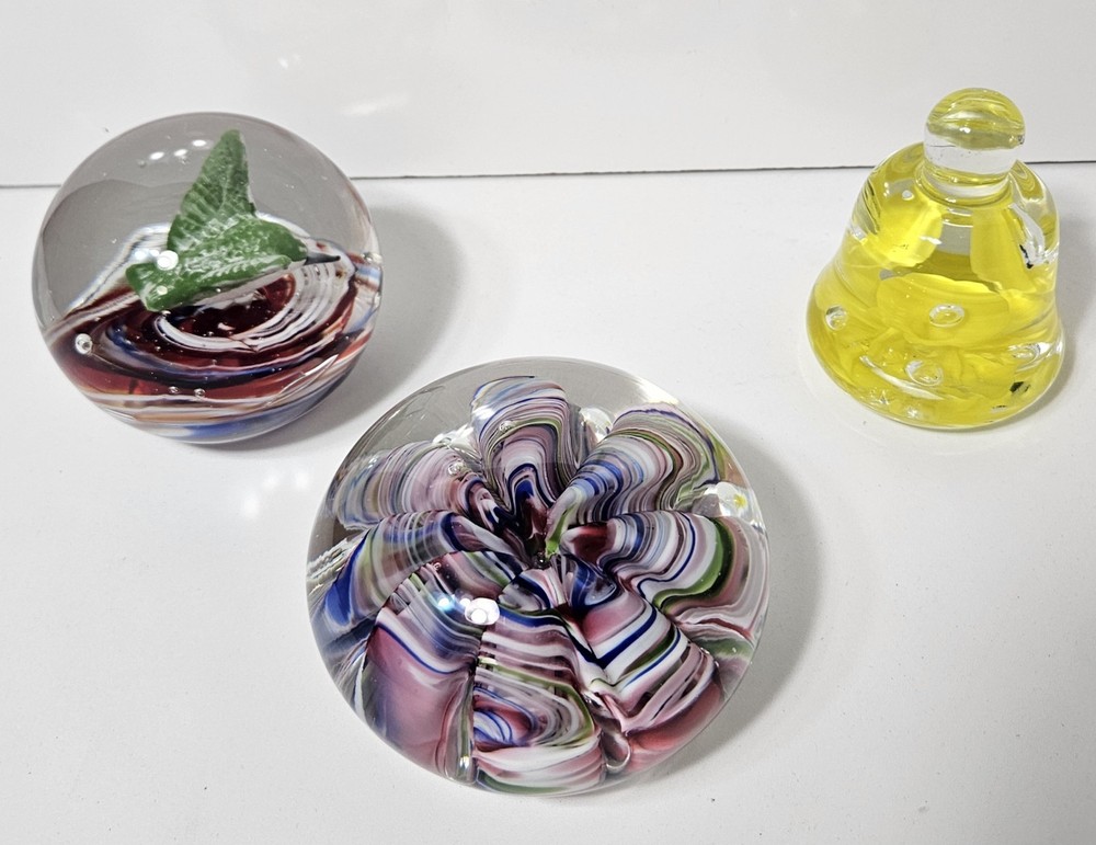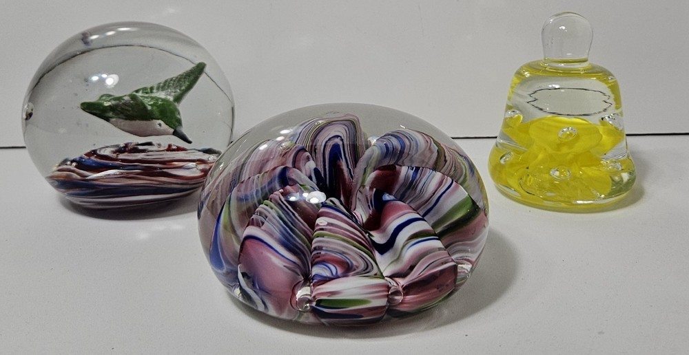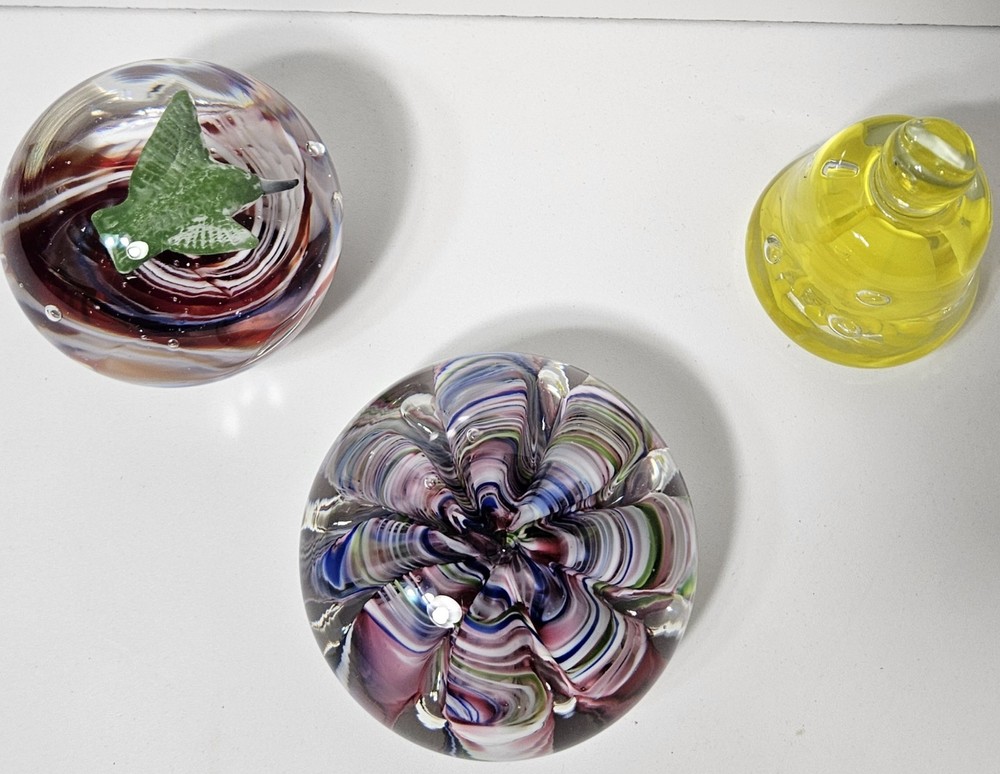 The product is a lot of three antique St. Clair glass paperweights (yellow bell, swirling pattern, and bird.) These vintage paperweights are hand-blown from multicolored art glass, made in the United States. The glossy finish and incised backstamp add to the decorative appeal of these handmade pieces. Perfect for collectors or those looking to add a touch of artisanal elegance to their decor.