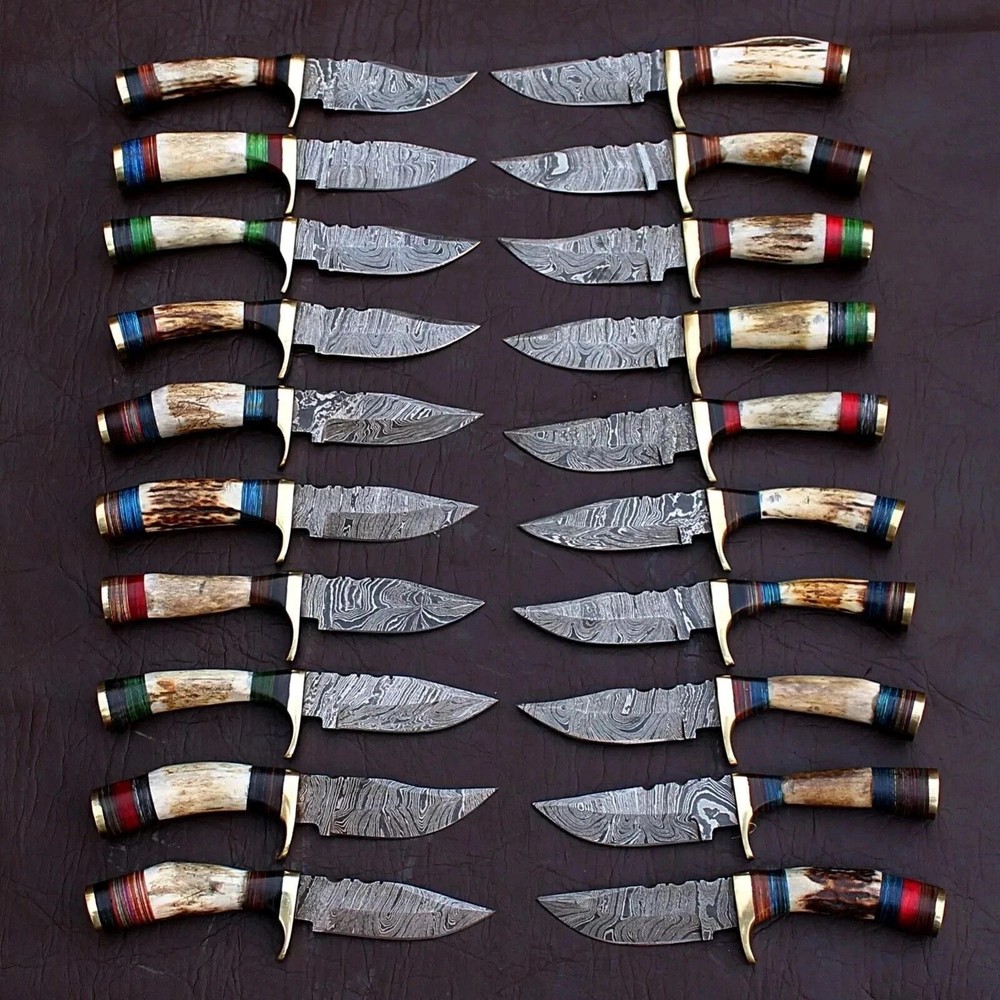 MARVELLOUS LOT OF "50" CUSTOM HANDMADE FORGED DAMASCUS STEEL TWISTED PATTER SHARPENED EDGE FULL TANG BLADE EDC CAMPING HUNTING CAMPING SKINNER KNIVES IN STAG HORN & BRASS HAND GUARD HANDLE. MEASUREMENT: OVERALL LENGHT: 6.00 INCHES (APPROX.) BLADE LENGTH: 3.00 INCHES (APPROX.) HANDLE LENGHT: 3.00 INCHES (APPROX.) FEATURES: Sharp Edge Easy to Carry Smooth Grip And Long Lasting Useable Knife For Hunting and Outdoors Man. HAND FORGED DAMASCUS BLADES: Damascus blades are hand forged through a process of layering, melting and hammering. This results in each blade having a unique design or as some would say a "fingerprint". Each & every knife is truly one of a kind. Damascus steel has outstanding properties of strength and hardness. We amplify its properties by oil quenching it at 2100 deg F to cool it down fast and we do it twice to make sure it's hard to its inner core to withstand any kind of work you may put it to use. It achieves a 58 or higher HRC on the Rockwell Scale. Producing Damascus steel is still unknown to this day, the process has been lost over the past 500 years. Today, we layer & hand forge two different steels 15n20 & 1095. It is then dipped in Ferric Chloride creating a distinct reaction with the metals producing a Damascus like pattern. ✅ 【 PATENTED DESIGN】 Manufactured with ultra-sharp hand forged Damascus steel cutting core at HRC58-60 hardness, this knife comes with unrivaled performance and incredible edge retention. ✅【 HIGH QUALITY HANDMADE KNIFE WITH SHARP, STRONG, AND DURABLE BLADE 】 This knife was hand crafted with the highest attention to detail to create this unique sharp blade with a sturdy handle. This knife is made of high-quality Damascus steel and will not rust with proper care. ✅ 【 PERFECT OUTDOOR CAMPING KNIFE AND HUNTING KNIFE 】 This knife is the perfect camp knife and hunting knife. It’s the best knife for any hunter, camper, survivalist, or outdoor sports enthusiast so that you can enjoy your adventure. ✅ 【 EXCELLENT HANDMADE BUSH CRAFT KNIFE 】 The Perfect bush craft, camp survival knife for all of your most rugged adventures out in the wild. This survival knife will give you an edge so that you can win in the competition against the wild outdoors. ✅ 【 DECORATIVE EDC HUNTING KNIFE FOR COLLECTORS 】 Enrich your collection with this beautifully forged handmade Damascus knife that is sure to impress with its hand forged layers of premium steel and handle. It’s the perfect addition for any true knife collector. ✅ 【 COMFORTABLE AND ERGONOMIC DESIGN FOR EASY GRIP 】 The unique handle is handcrafted for maximum comfort making it the perfect knife for all of your outdoor needs. Full hollow blade is light weight and compliments the handle in maintaining balance and help to reduce stress on your hands after use with comfort while providing you with the perfect blend of performance and comfort. ✅ 【 ULTIMATELY DURABLE HANDLE 】 The meticulously constructed handle has gone through special treatment, making it extremely impervious to heat, moisture, cold with military grade strength and life-long sturdiness; multiple times riveted for extra resilience, ✅ 【 SUPERIOR SHARPNESS 】 Ruthlessly shaving sharp edge is handcrafted by me to a mirror polish at 15-25° per side using the traditional 3-step honing method. ✅ 【 WARRANTY 】 No premium knife is complete without a lifetime warranty; our masterpiece knife is fully covered for life, free exchange or return for life if the item is defective. ✅ 【 SUPERIOR SHARPNESS 】 Ruthlessly shaving sharp edge is handcrafted by me to a mirror polish at 15-25° per side using the traditional 3-step honing method. ✅ 【 WARRANTY 】 No premium knife is complete without a lifetime warranty; our masterpiece knife is fully covered for life, free exchange or return for life if the item is defective. This knife looks great in the sheath or on a belt making it easy to retrieve. It has the perfect sharpness to make your everyday utilitarian tasks an enjoyable experience. Perfect for hunting, fishing, hiking, camping, boating, backpacking, or any other outdoor adventure. It is also a key item to add to your survival tactical gear!