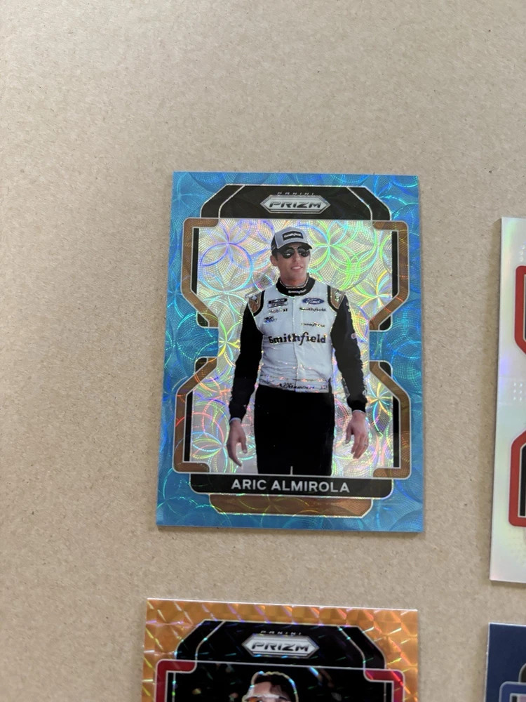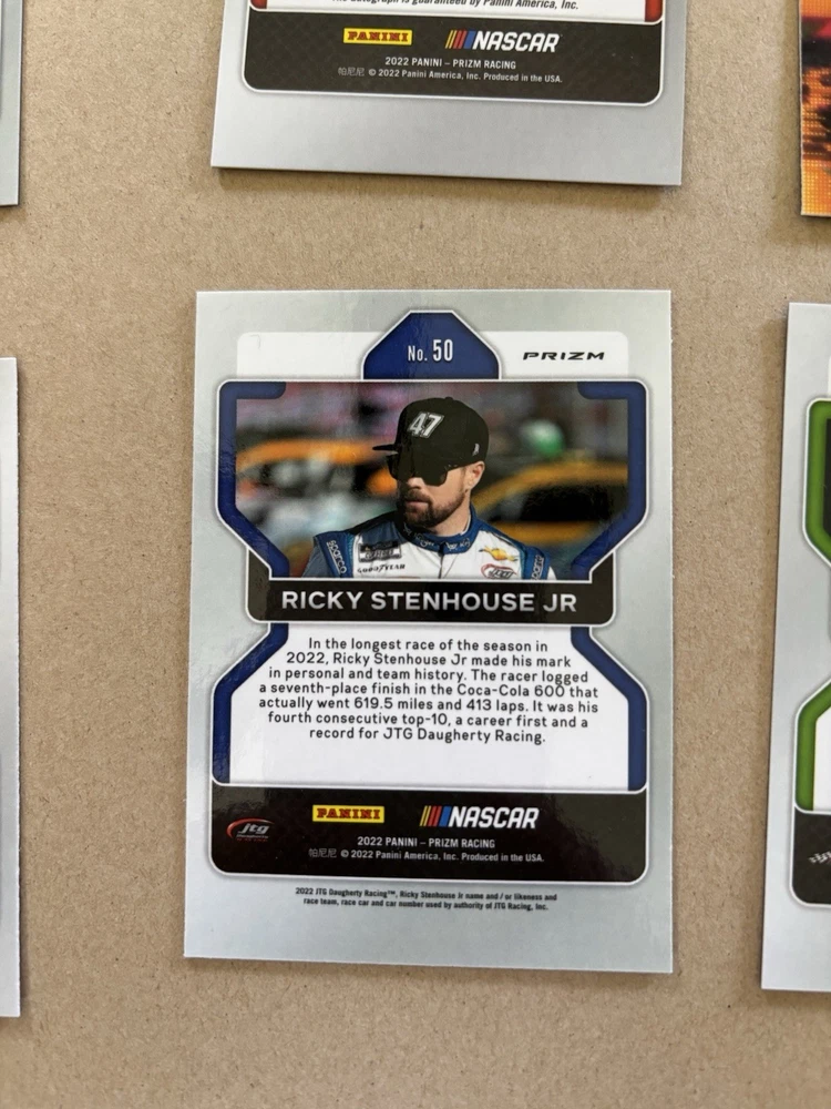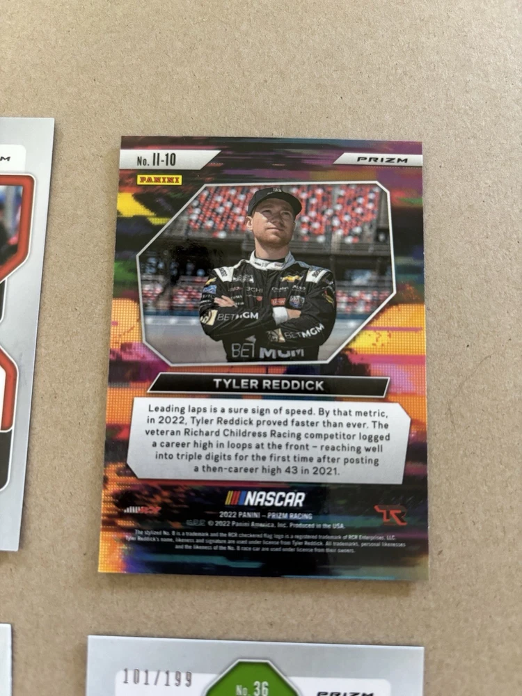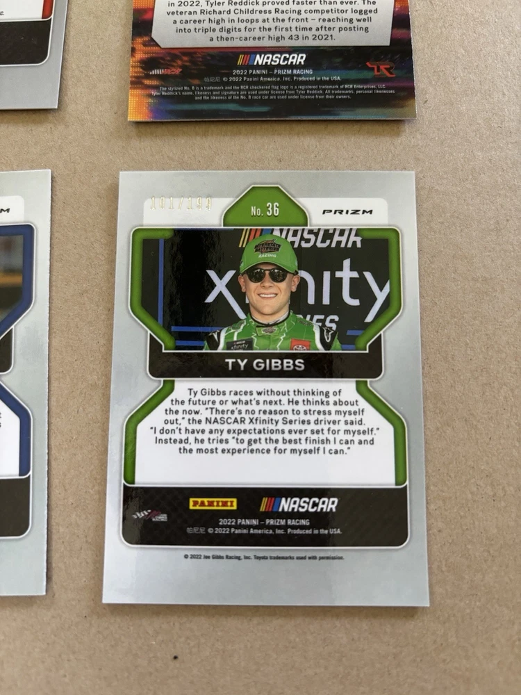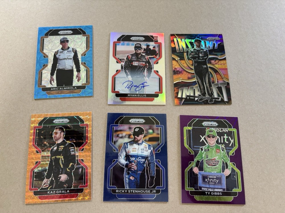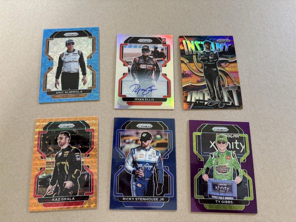 Ryan Ellis Silver Prizm Autograph Ty Gibbs Purple Scope Prizm /199 Ricky Stenhouse Blue Scope Prizm Kaz Grala Orange Reactive Prizm Tyler Reddick Instant Impact Silver Prizm Aric Almirola Blue Prizm /99 This lot includes six autographed sports trading cards from the 2022 Panini Prizm set, featuring the up-and-coming NASCAR driver Ty Gibbs. These cards are all short prints, making them a rare addition to any collection. Each card showcases Gibbs in action, capturing the excitement of auto racing. These cards are perfect for any fan of NASCAR or trading card collector. The autographs add an extra level of uniqueness and value to each card. Don't miss out on the opportunity to own a piece of racing history.